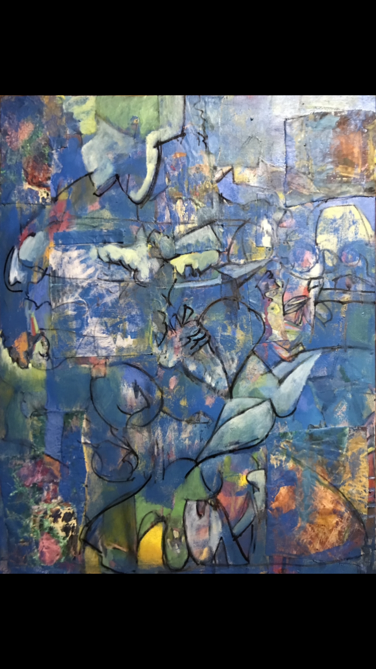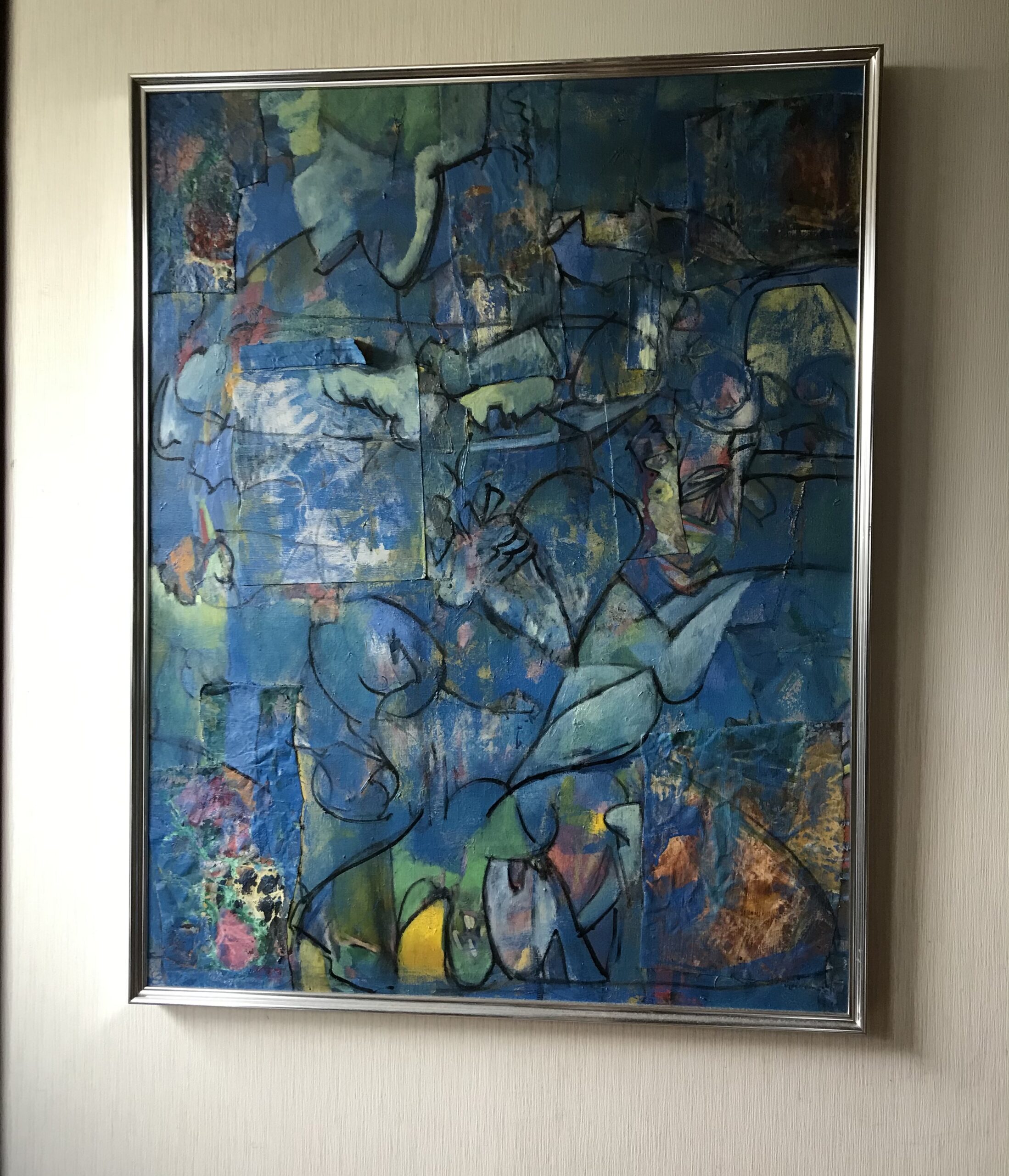 下地に油絵具で抽象画を描いた後、青のペンキでまた新しく描いた作品。