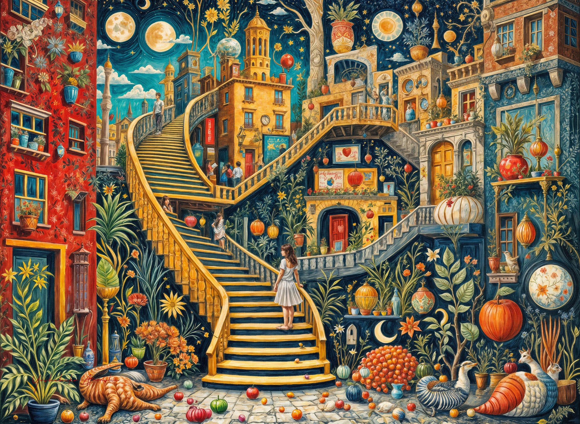 これらの作品「月光の迷宮」は、夢と現実が交錯する幻想的な夜の旅路を描いています。螺旋階段や迷路のような街並み、静謐な月光、そして仮想動物たちの姿は、見る者の無意識と記憶を呼び覚ます象徴です。細密な描写と幻想的構成で、誰しもの心に潜む「帰る場所」への渇望を表現しました。月明かりが照らす道を辿ることで、自らの内面世界と向き合う旅になることを願っています。
