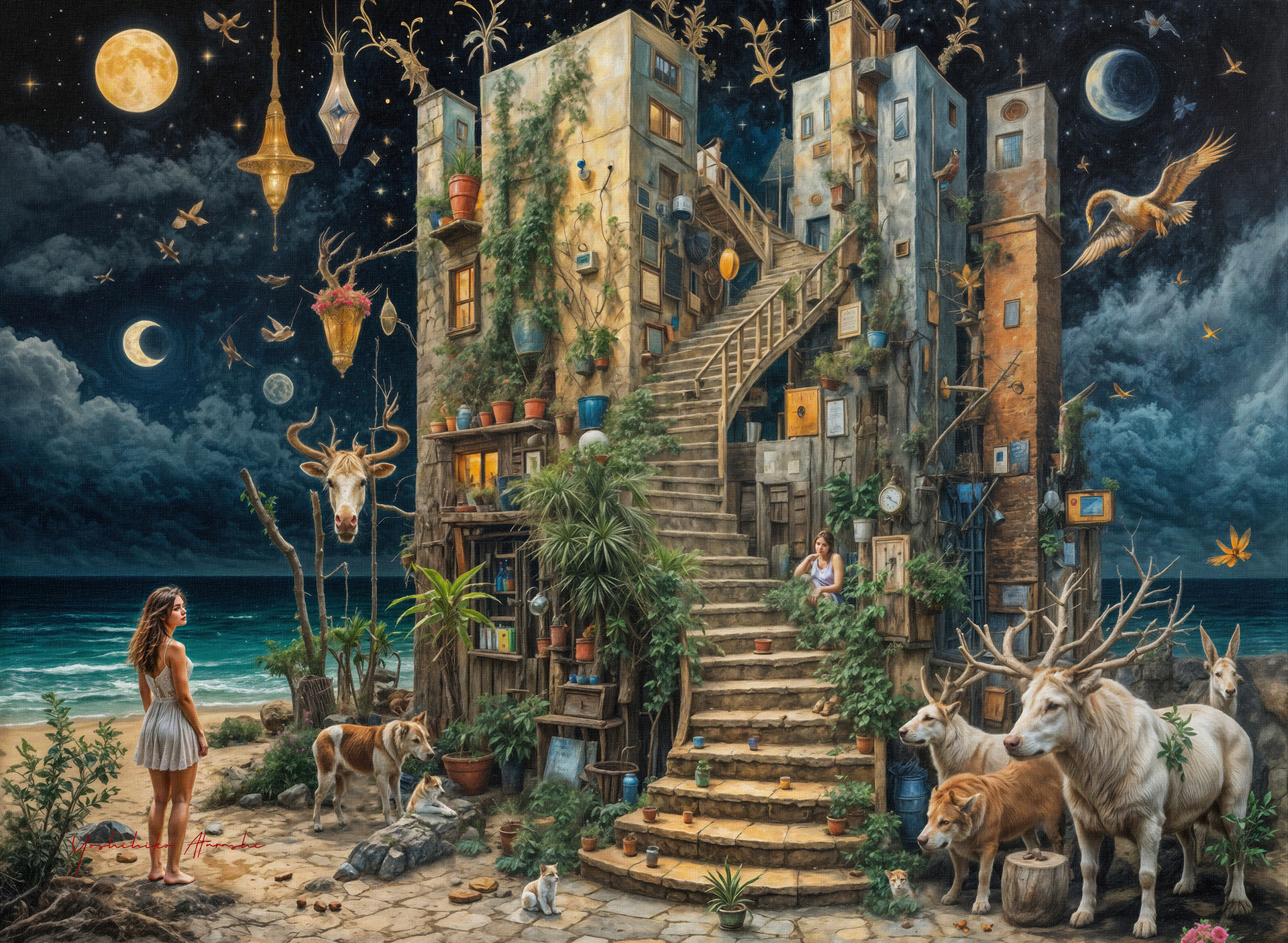これらの作品「月光の迷宮」は、夢と現実が交錯する幻想的な夜の旅路を描いています。螺旋階段や迷路のような街並み、静謐な月光、そして仮想動物たちの姿は、見る者の無意識と記憶を呼び覚ます象徴です。細密な描写と幻想的構成で、誰しもの心に潜む「帰る場所」への渇望を表現しました。月明かりが照らす道を辿ることで、自らの内面世界と向き合う旅になることを願っています。