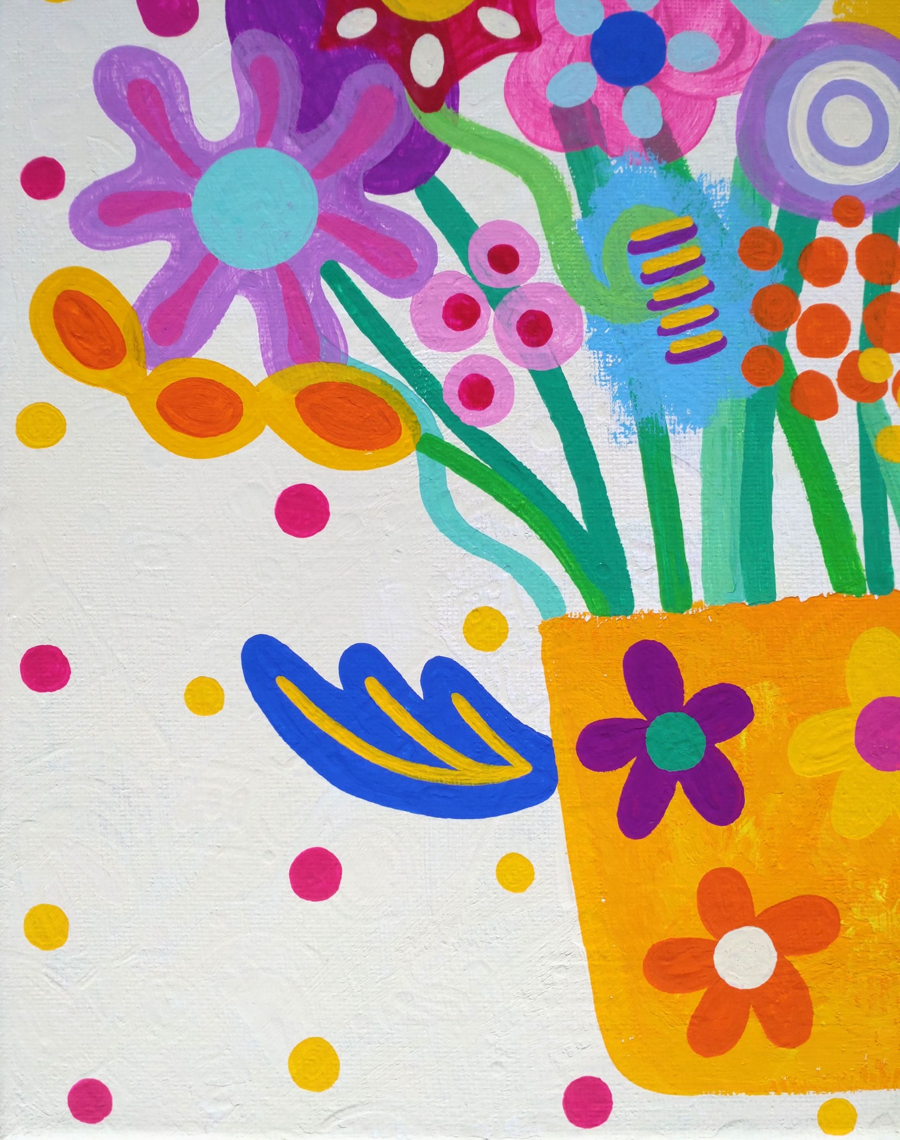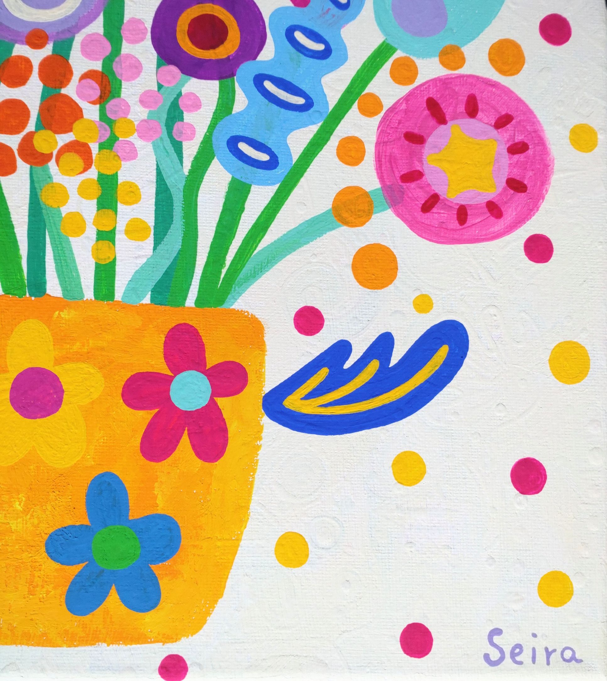 お花を描きました。いろんな形の花がたくさんで、みんな楽しそうです。お花の入れ物はお花の模様&手がついています。キャンバスは模様があり凸凹しています。背景色はアイボリーです。