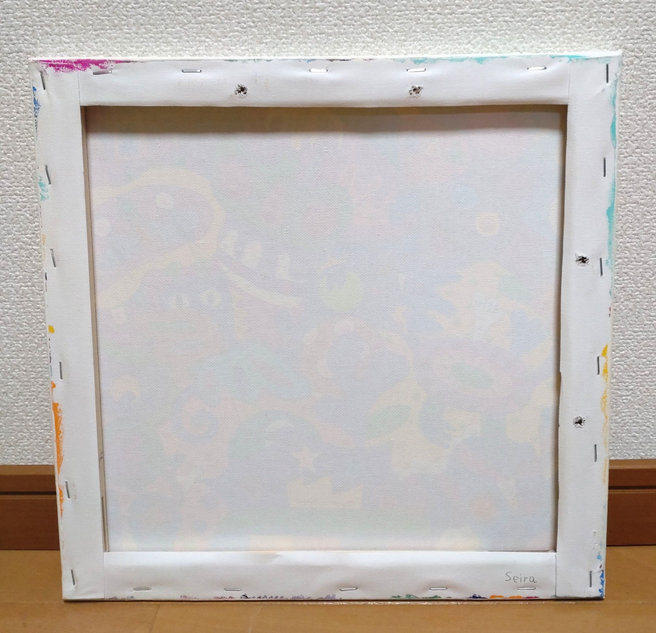 キャンバスのうしろに紐がついておりません。ピンにひっかけていただくと簡単&すぐに展示していただけます。(ふちの部分も色を塗っているので、そのまま飾ることができます。)