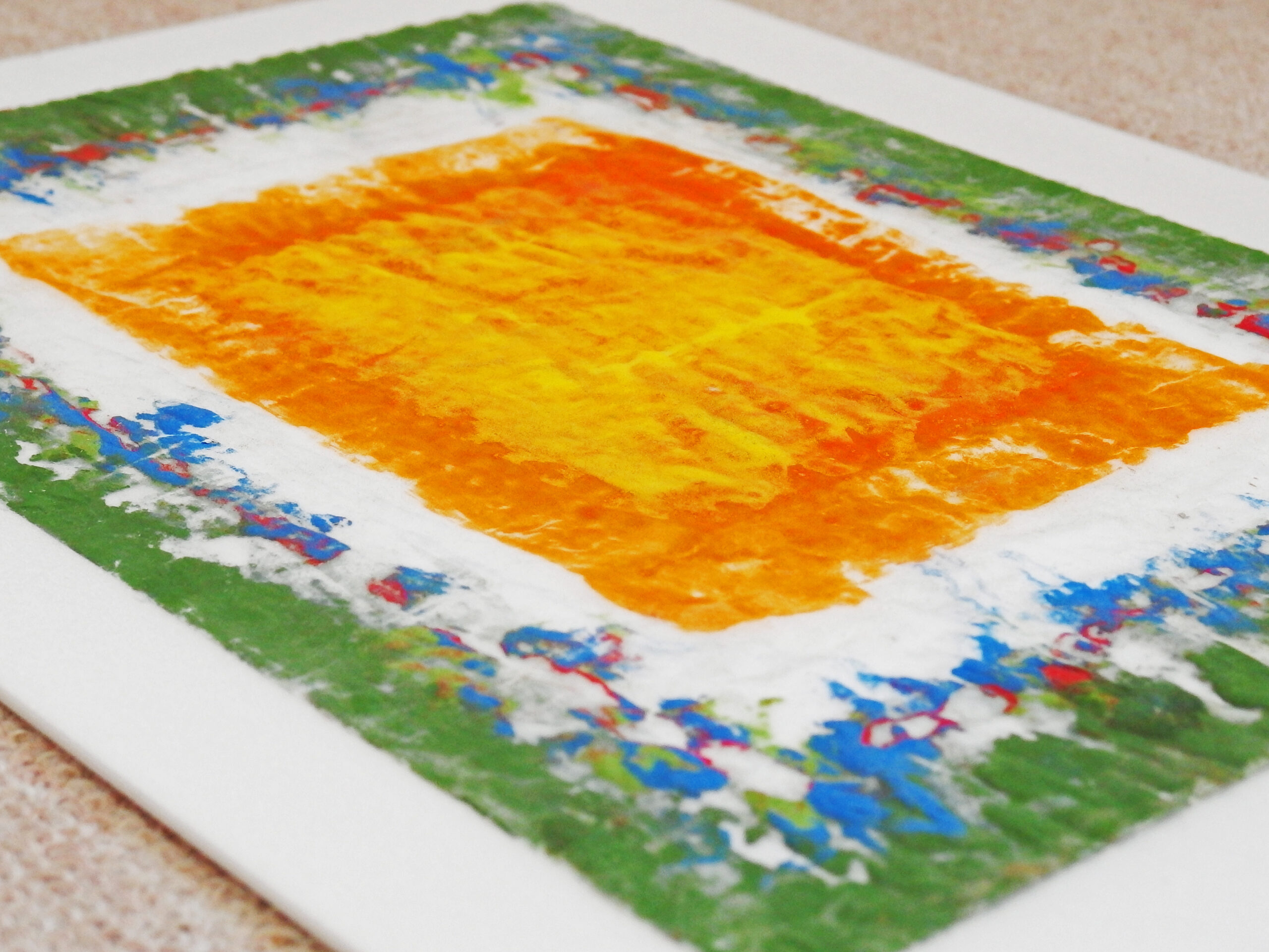 天然素材の和紙に膠を使うのが「日本画」の常識ですが、あえて人工素材を使っています。