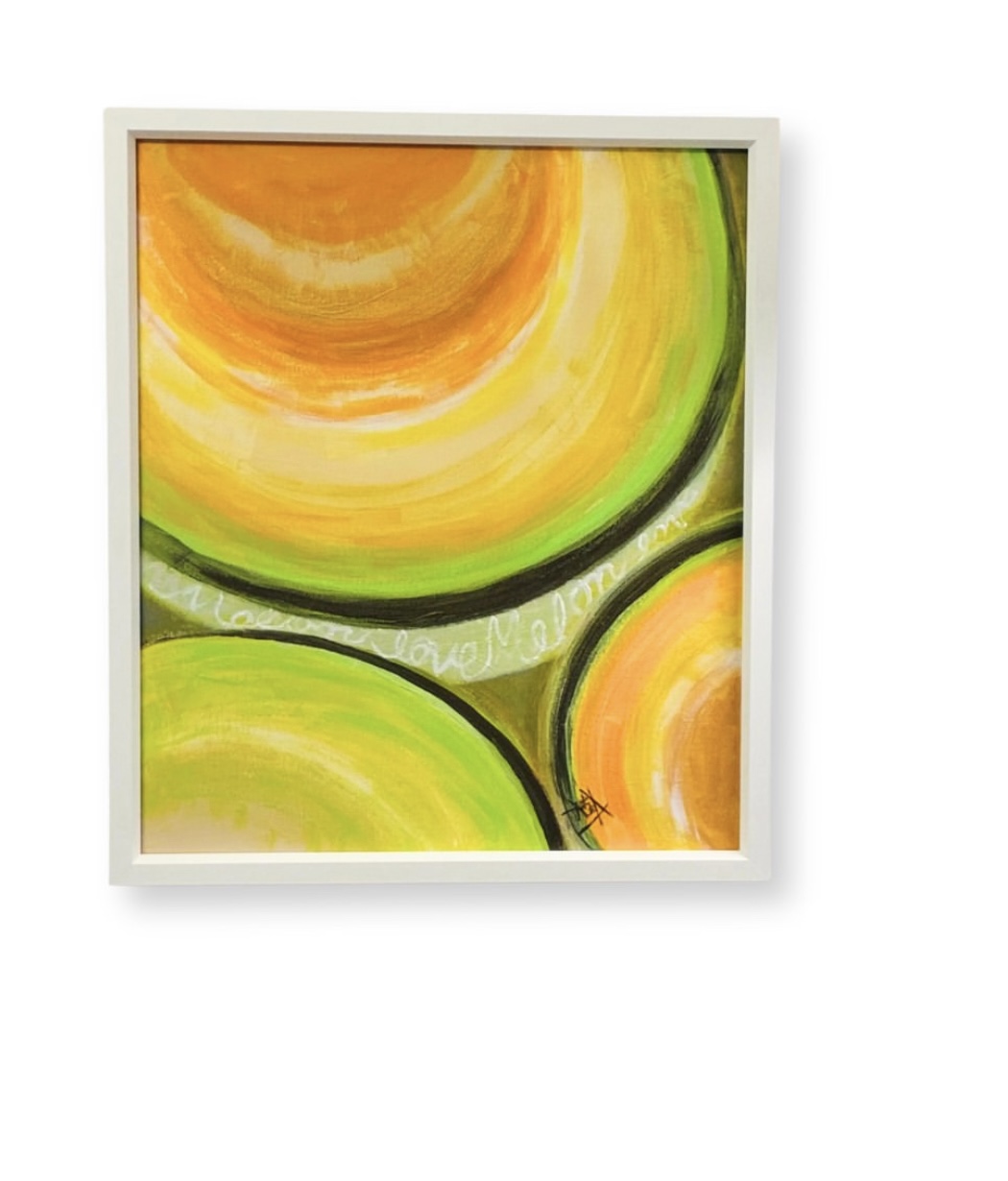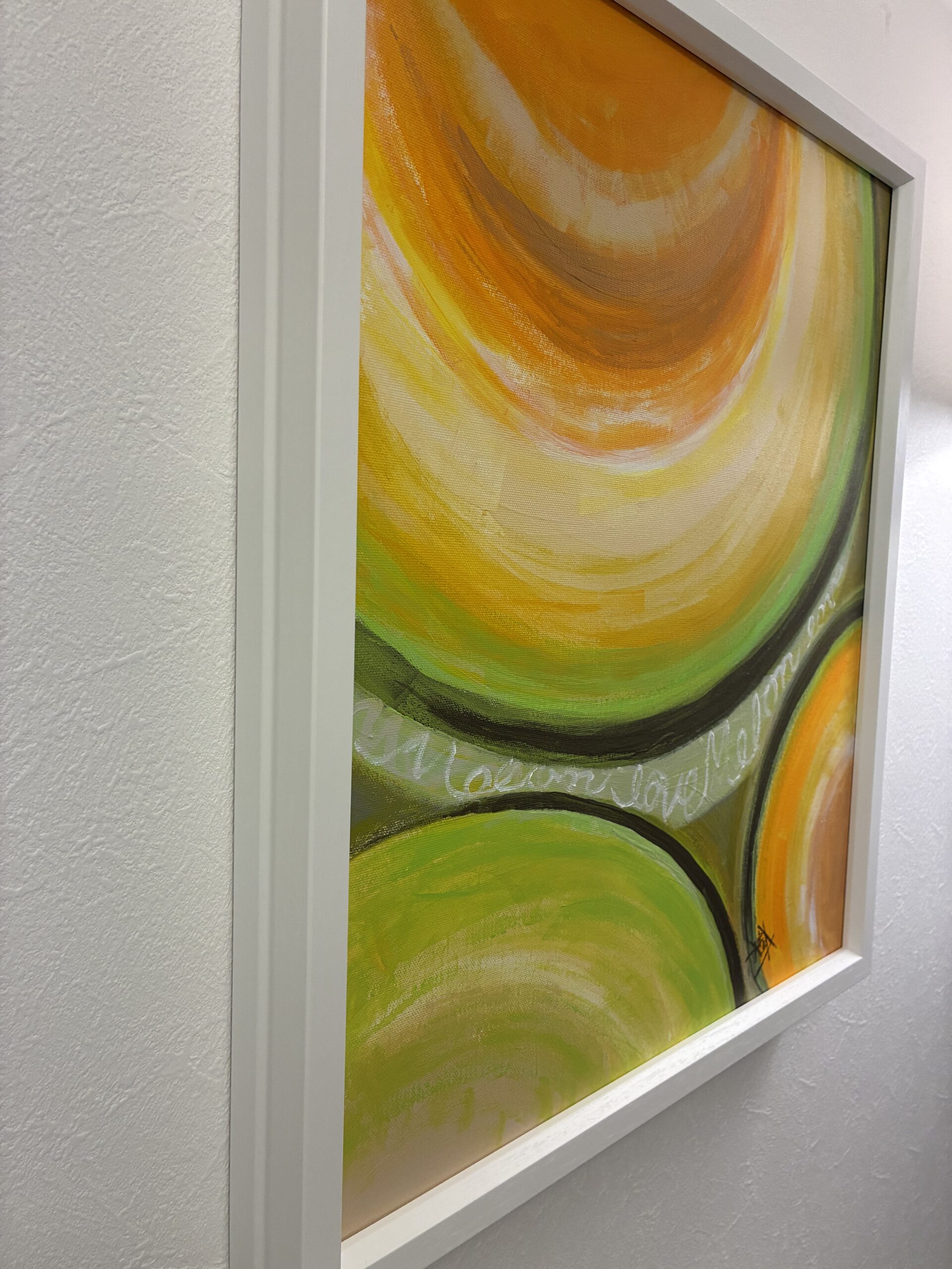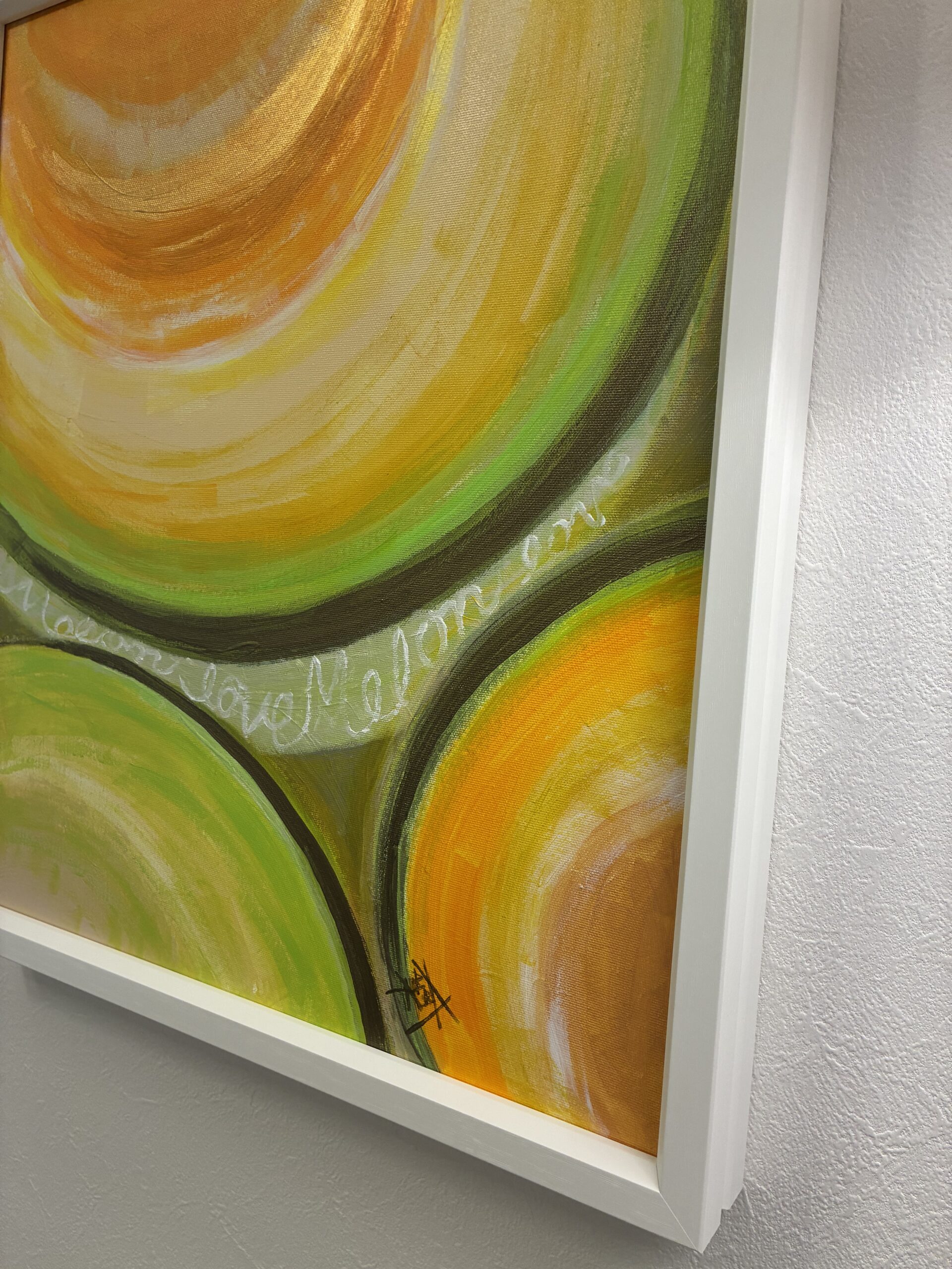 なんだか美味しそうなモダンアートです。お部屋が明るくなります。木製のシンプルな額装はガラスやアクリルが入っていないので光の反射がありません。ゴールドとブロンズの絵の具を一部に使用しています。裏に紐が付いているので、すぐに飾れます。