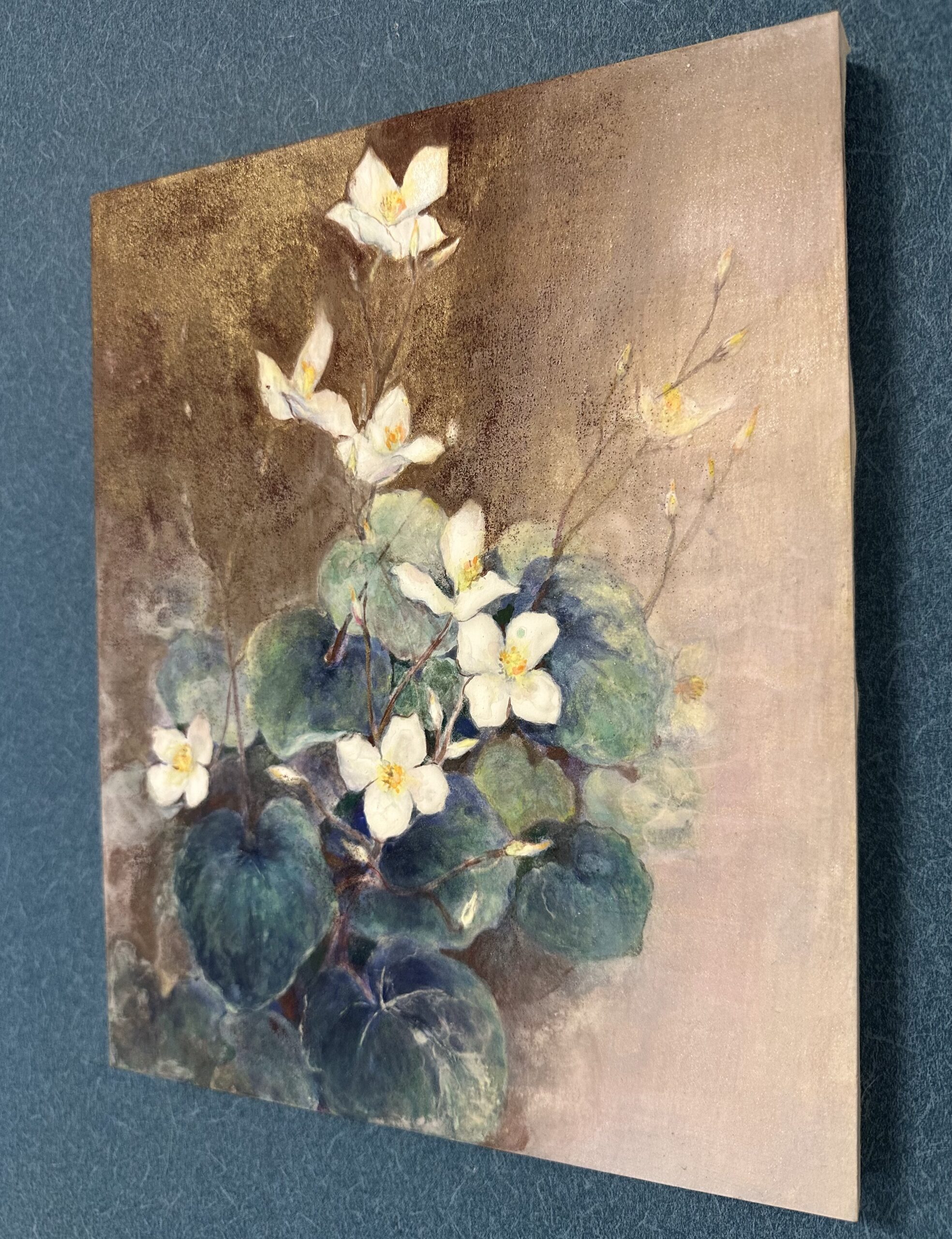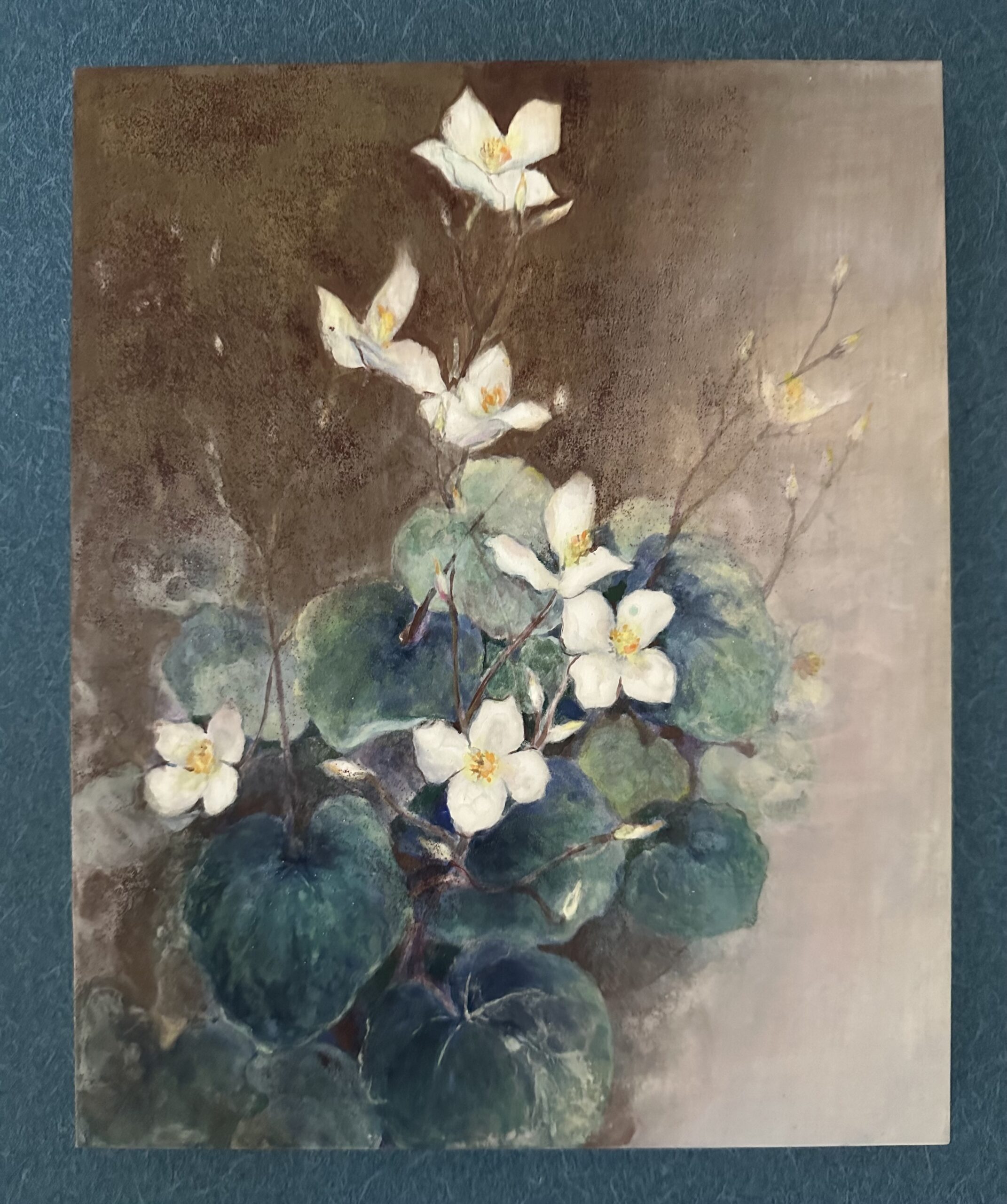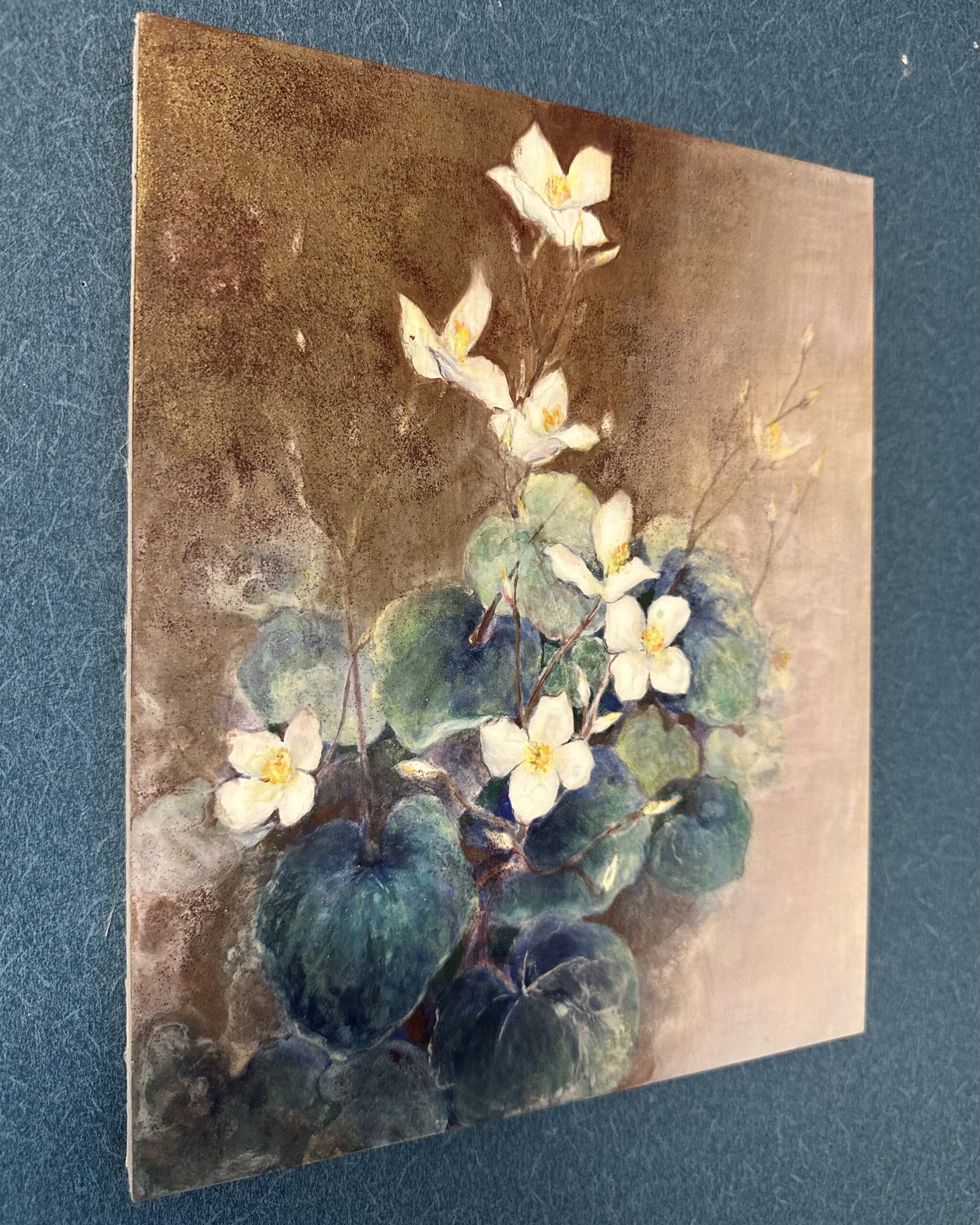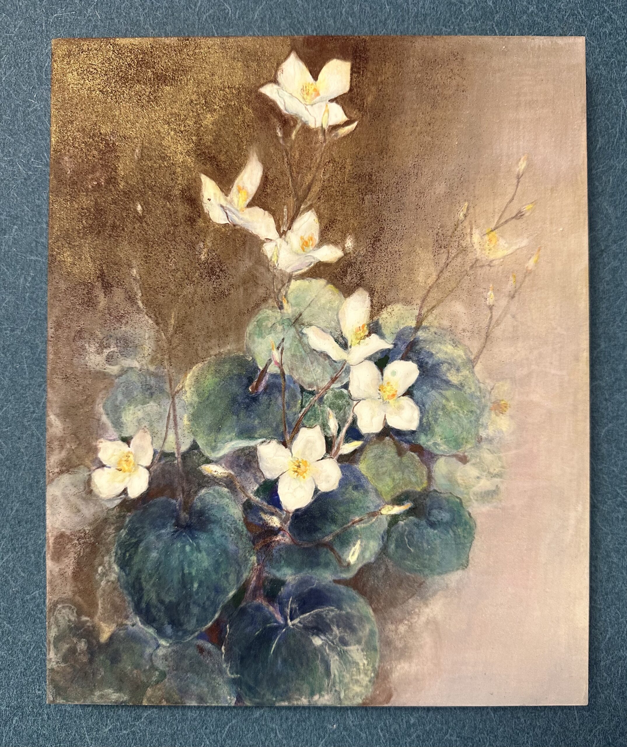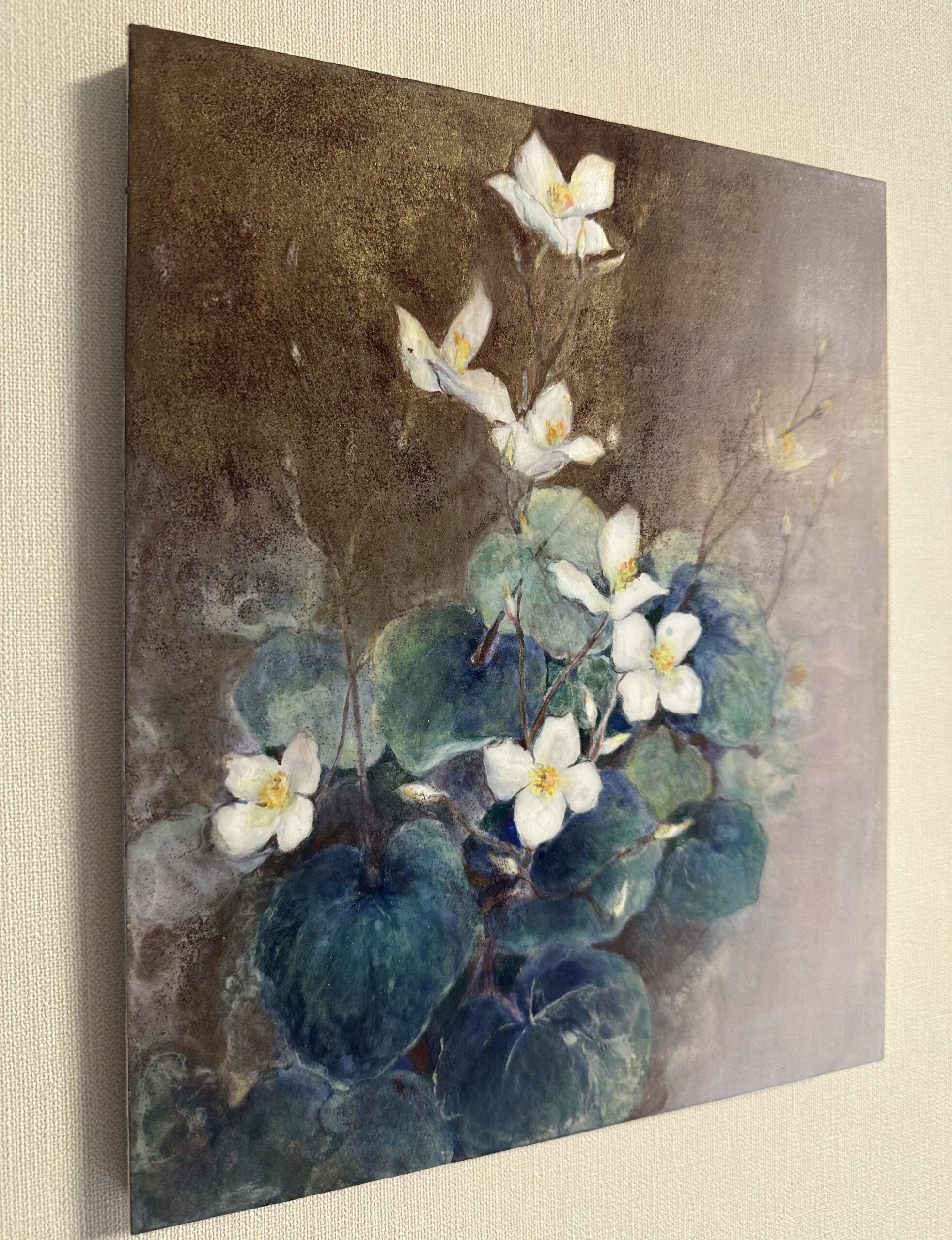 箔を使用した作品は、光のあたり方によって輝き方が変わります。日中の窓から入る自然光、夜の照明の光など、光の違いにより表情がかなり変わります。また、箔の変色を抑えるためのコーティングをしておりますが、時間経過とともに少しずつ色味が変化します。その変化もお楽しみいただけますと幸いです。