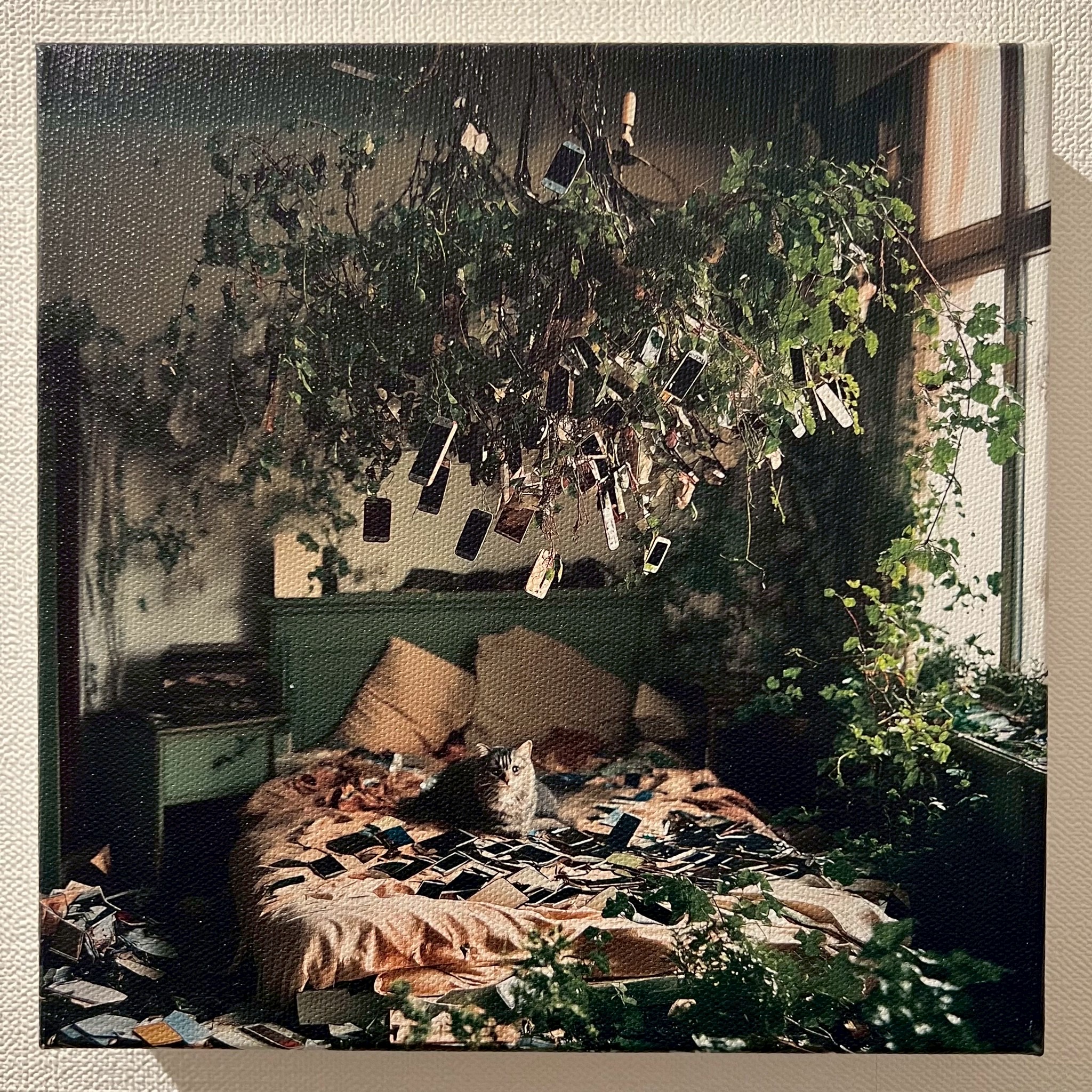 生成AIサービスMidjourneyをツールとして利用して作成された作品。2025年、兵庫県の廃墟カフェRUINSへ本作品を含め期間展示。緑をイメージした独特の世界観を味わうことができます。