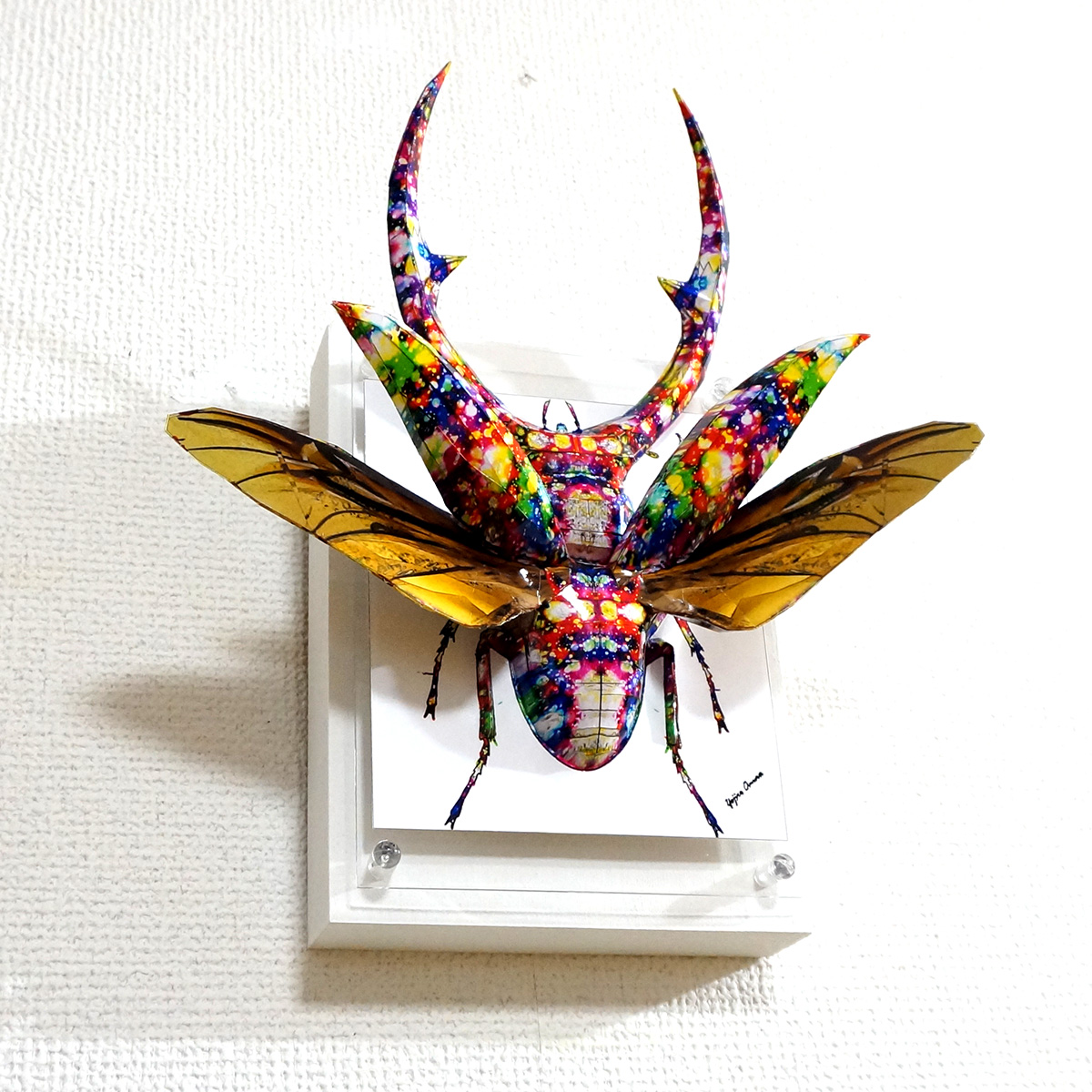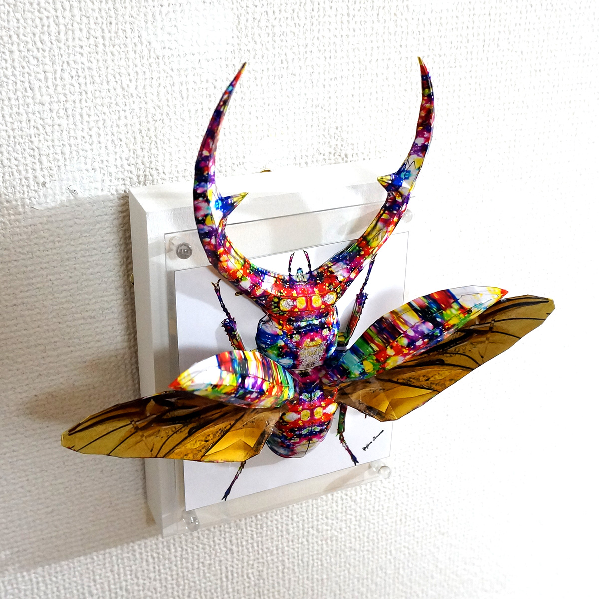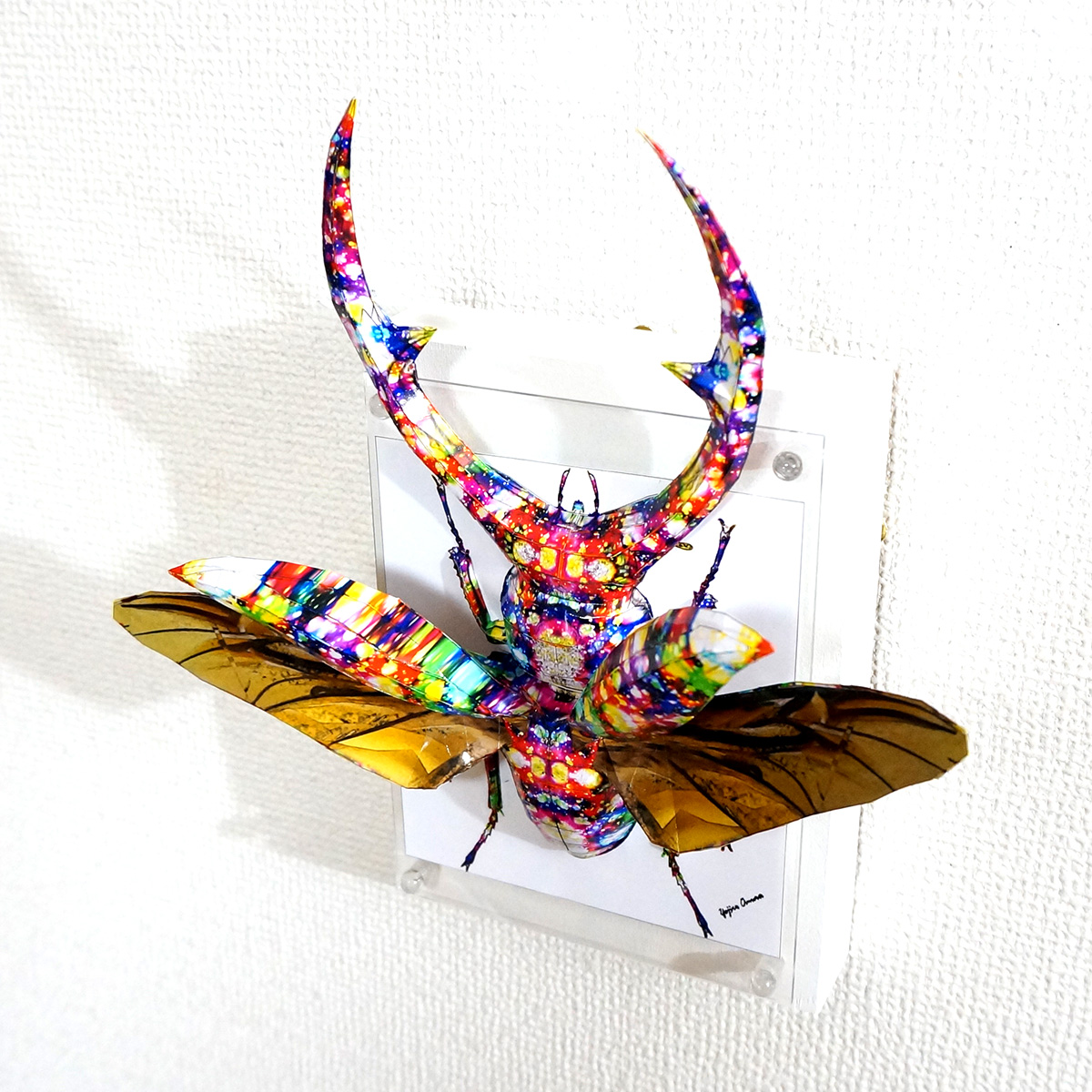 表面上は様々な色合いのカラフルで煌びやかな模様をクワガタ本来の風合いに重ね合わせた、光沢のあるサーフェイスとなっております。