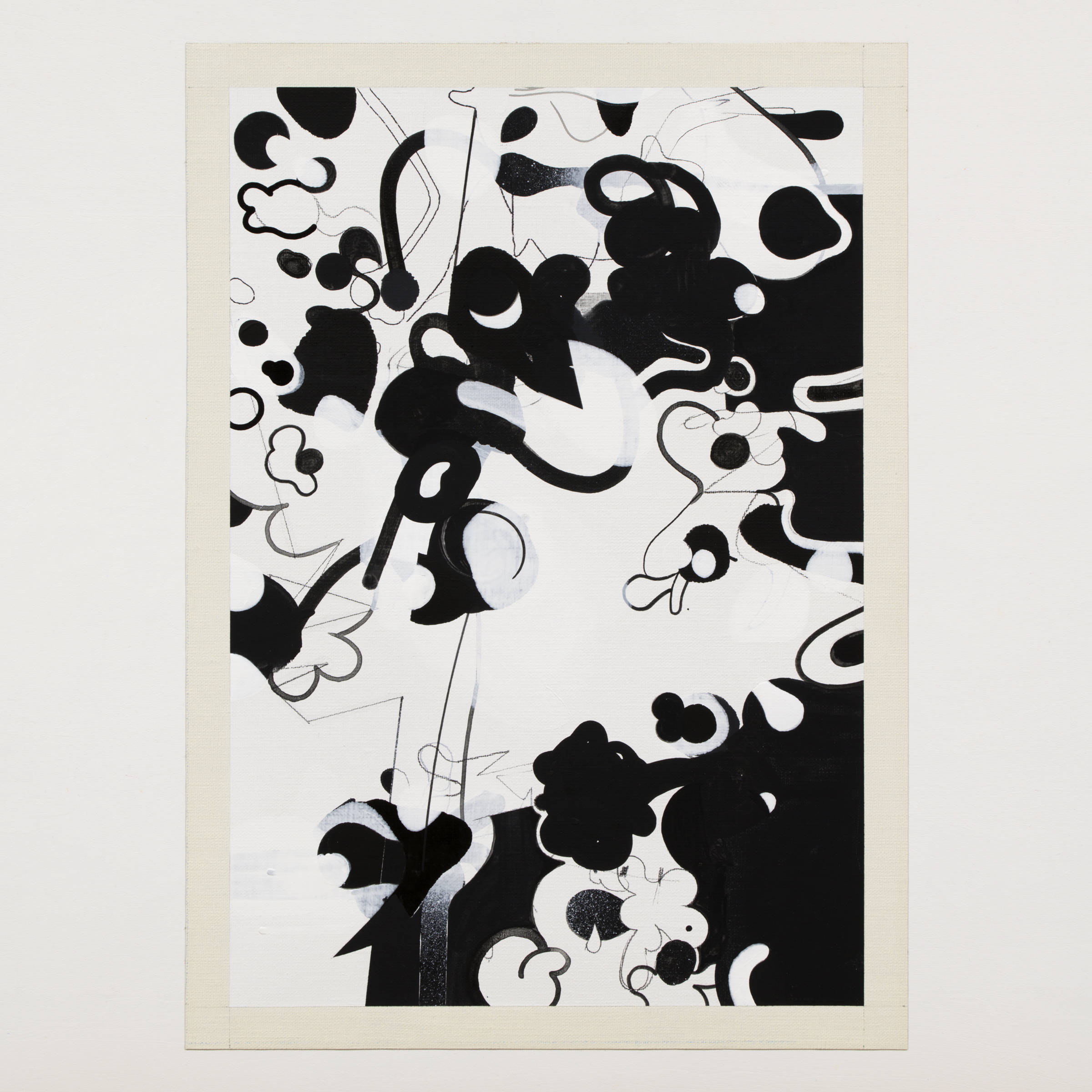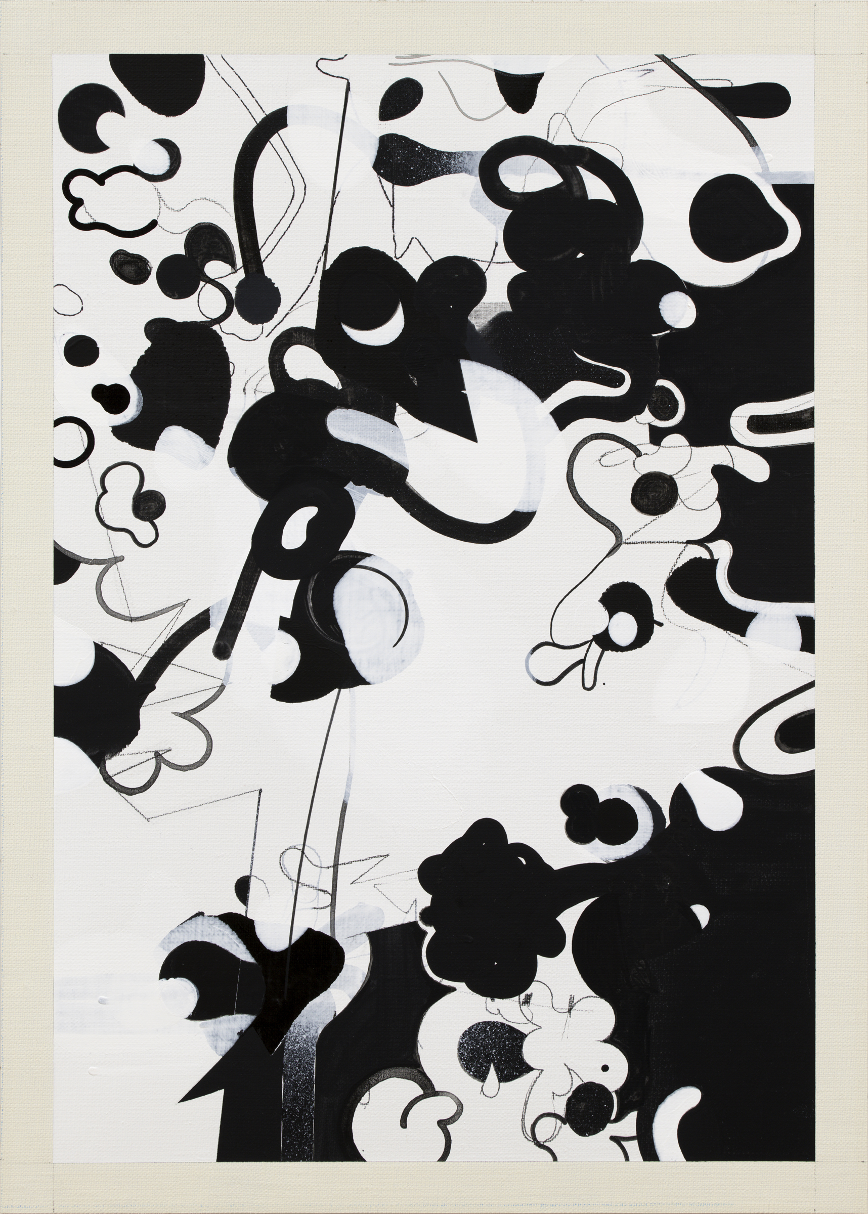 ジェッソが塗られた、木枠に張られてないリネンキャンバスにアクリル絵具、マーカー、鉛筆、スプレー塗料