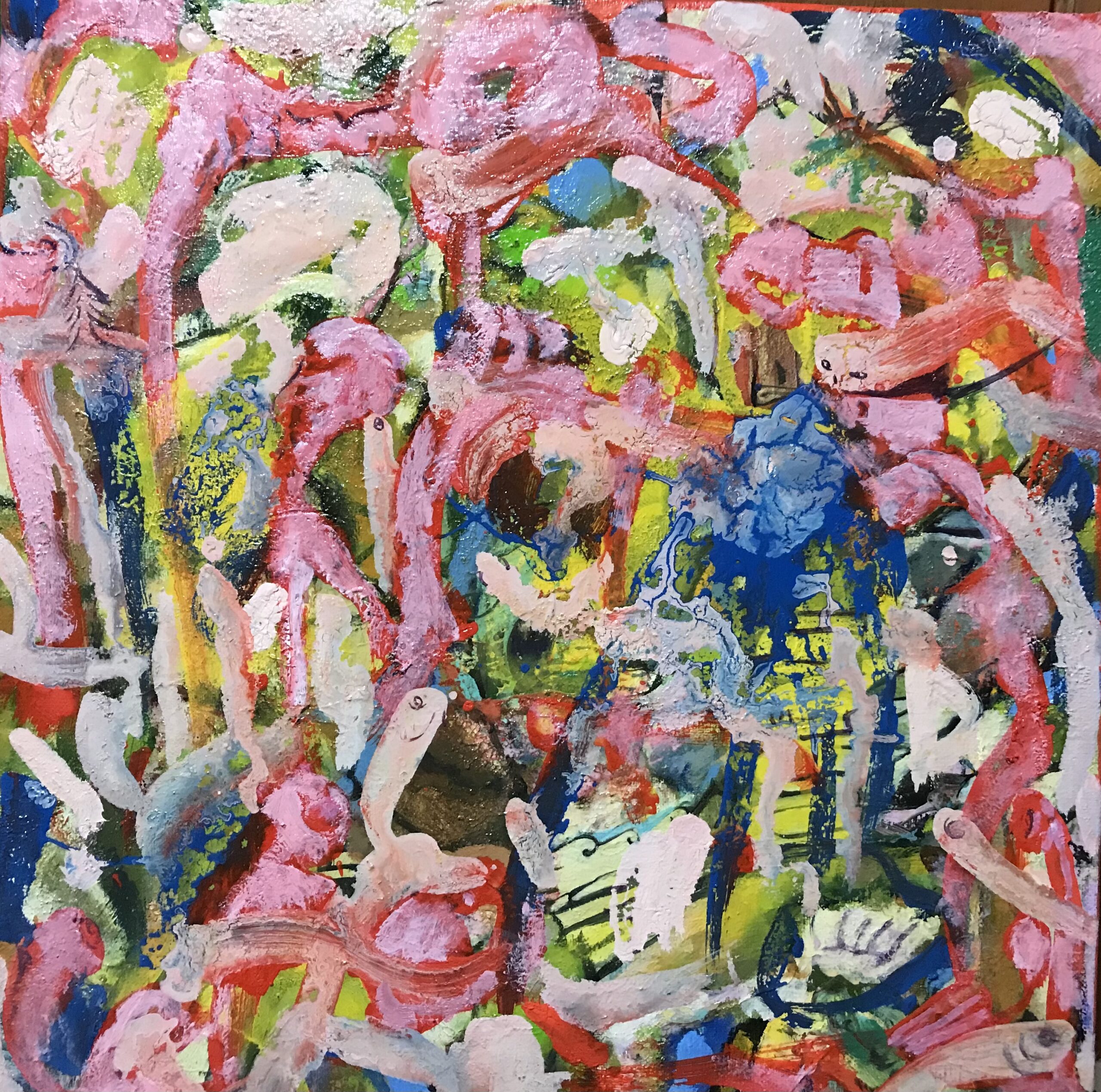 アクリル絵の具にて描く。乾燥してひび割れ有り。S4号キャンバスにて制作。