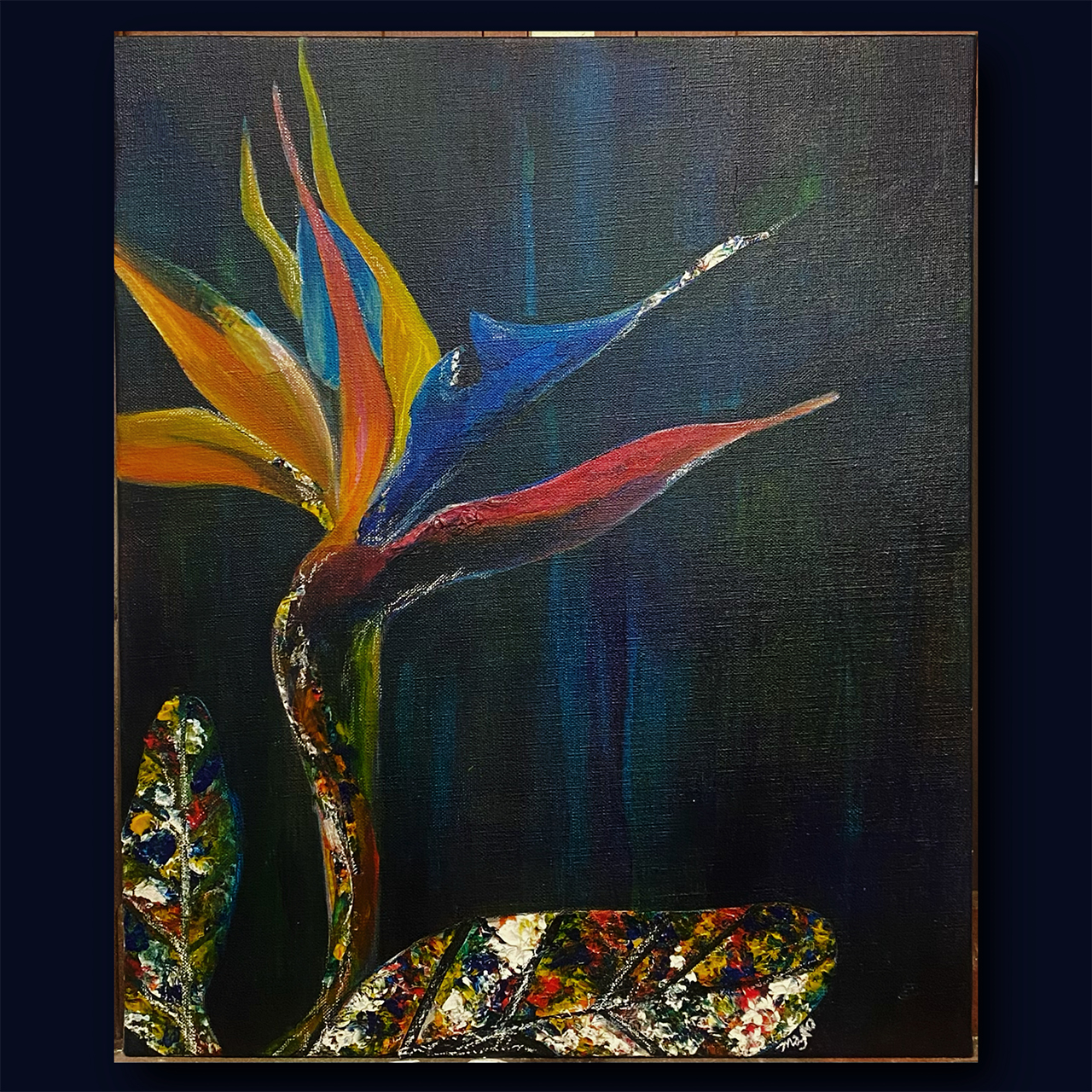 鮮やかなオレンジとブルーの翼を広げ、今にも飛び立ちそうな極楽鳥花。