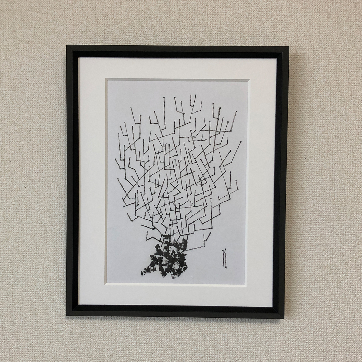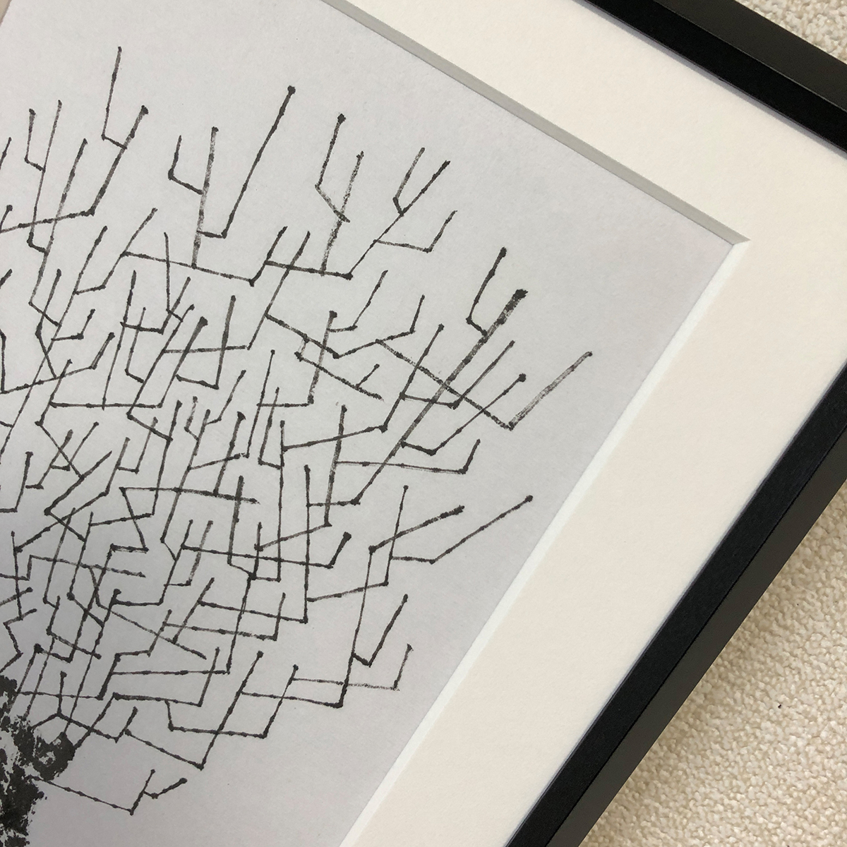 一本の細い筆を用いて、幹の部分は筆の側面で枝は穂先で描きました。