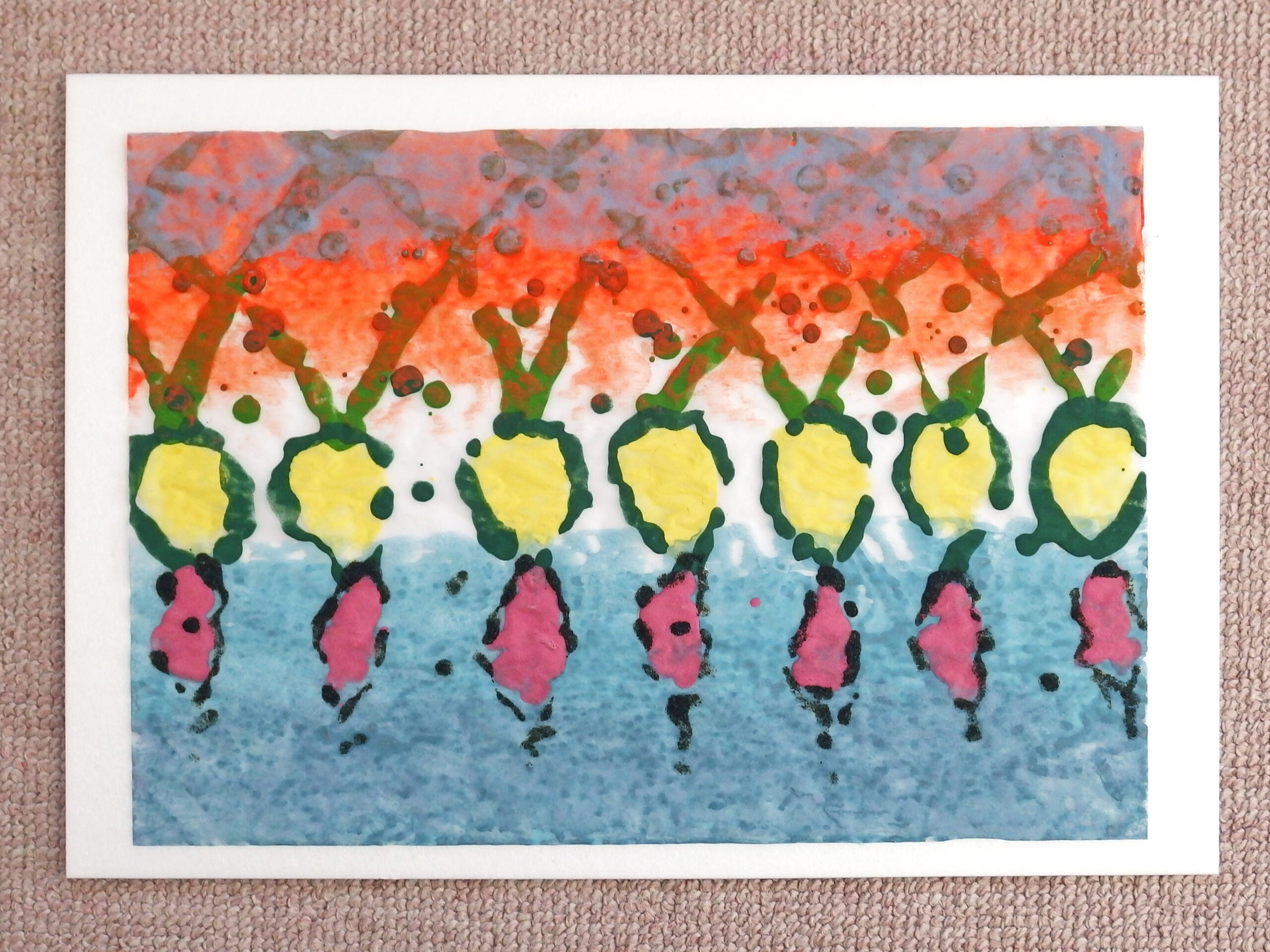 スチレンペーパーという光沢のある真っ白な素材に、岩絵の具自体の美しさが際立ちます。この組み合わせを発見し、気に入って使い続けています。