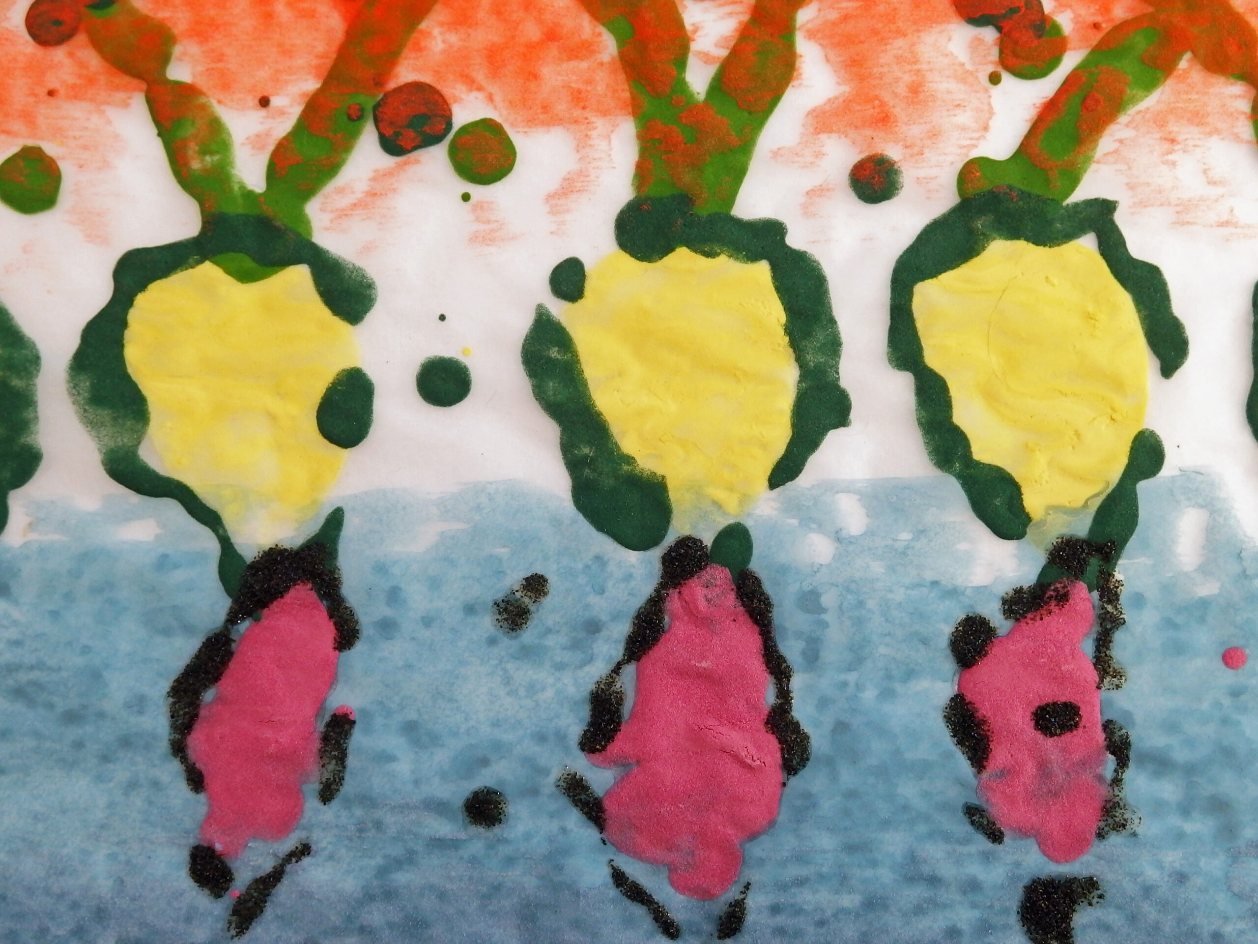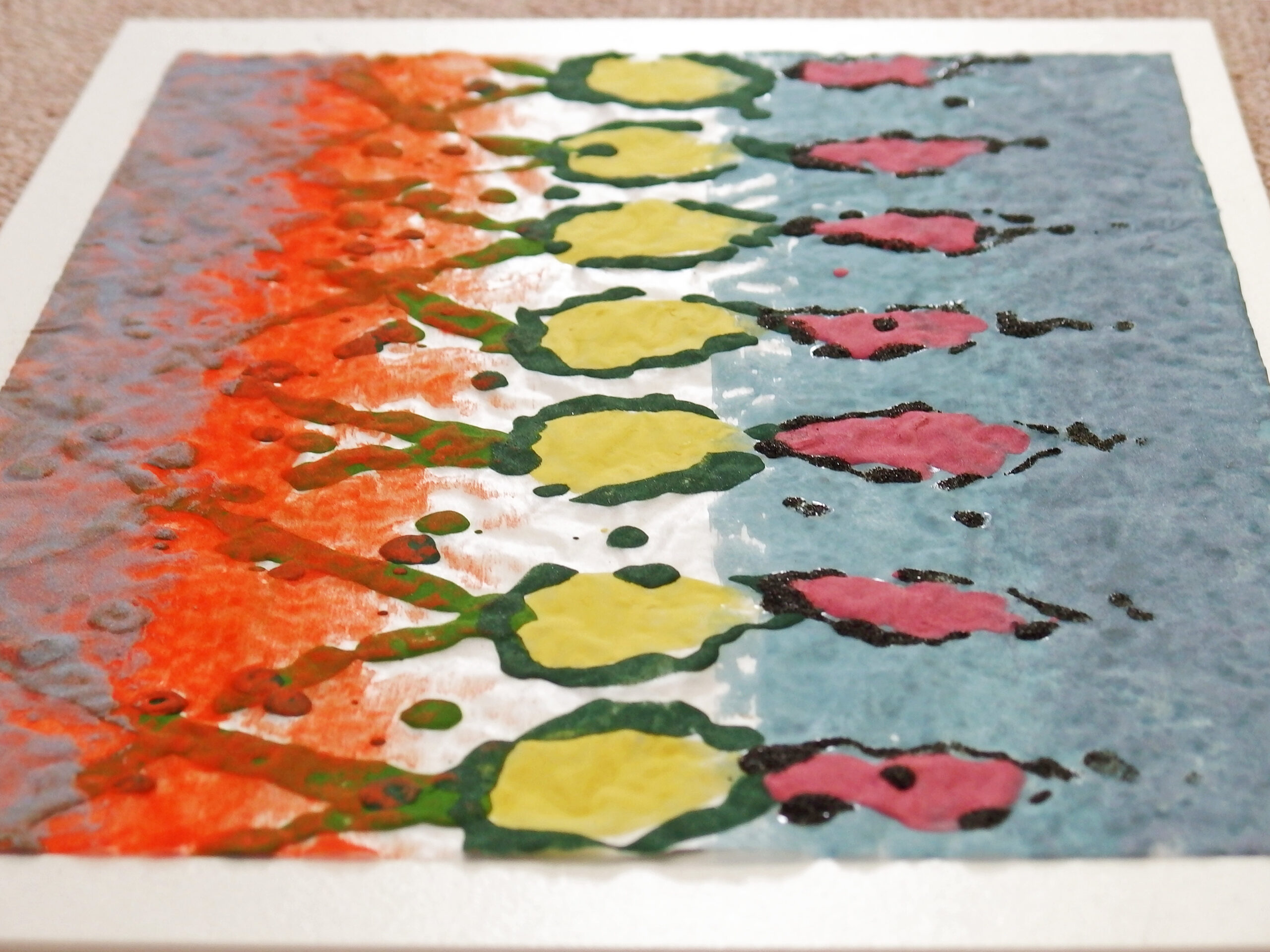 天然素材の和紙に膠を使うのが「日本画」の常識ですが、あえて人工素材を使っています。
