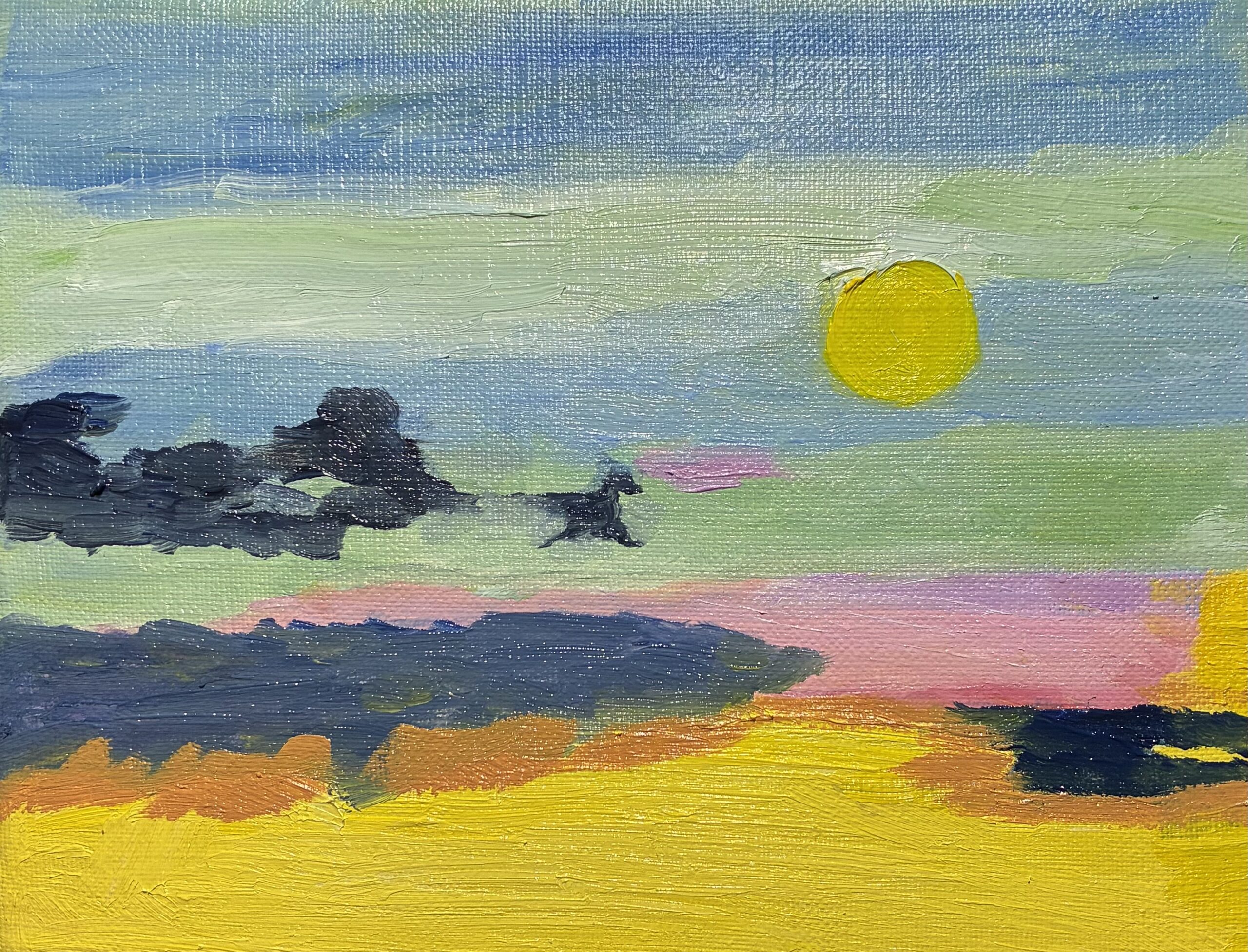 空の雲が馬のように見えたので、油彩で駆けるような様子を表現しました。