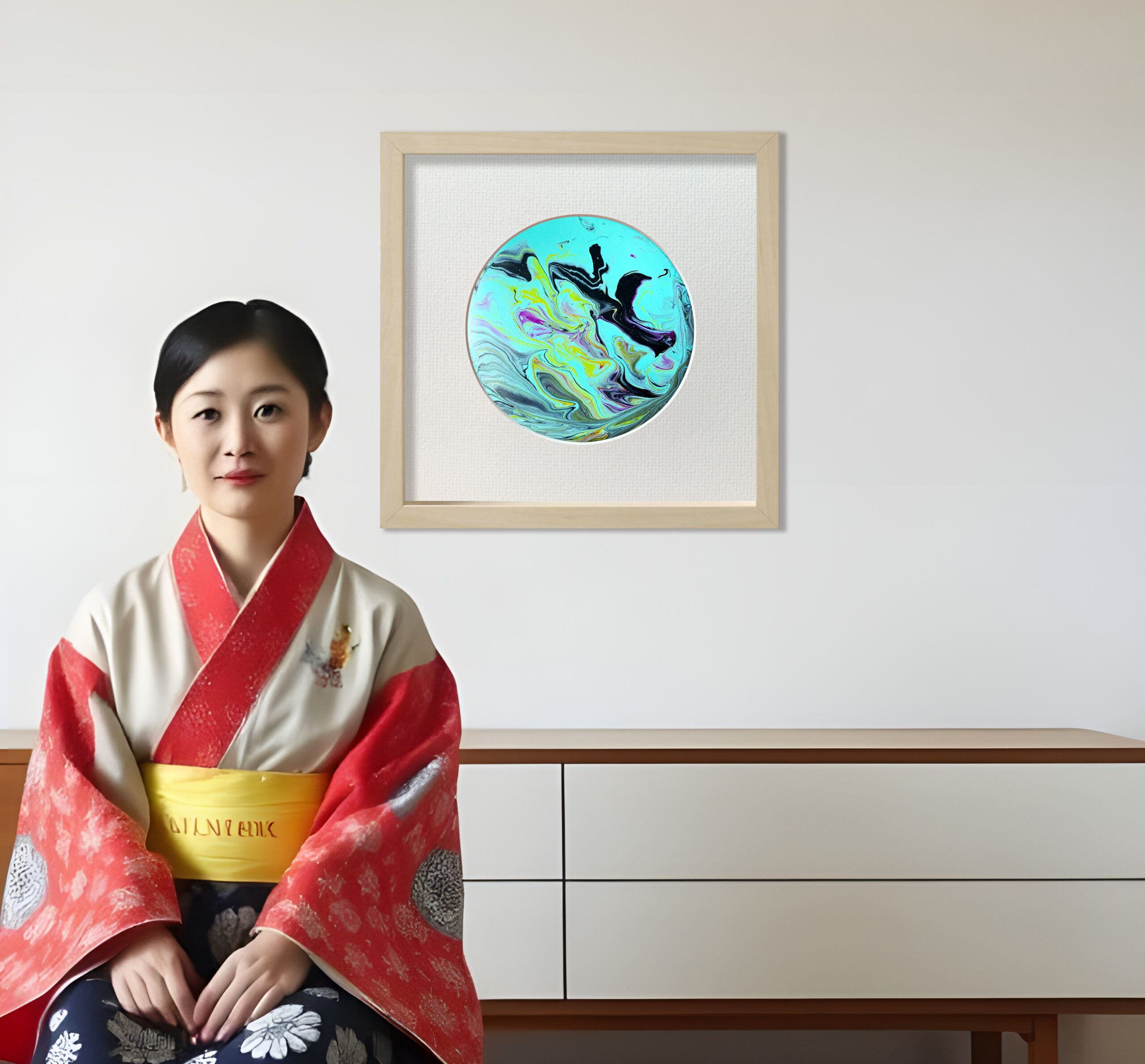 Created in June 2025 in Australia for Japanese people as a tribute to the style and design of Japanese mansions. This painting is circular and 13 cm in diameter, while the frame is 25 cm x 25 cm, made of sand-coloured birch, and is ready to hang. Each painting features Estelle’s hanko on the back of the artwork.