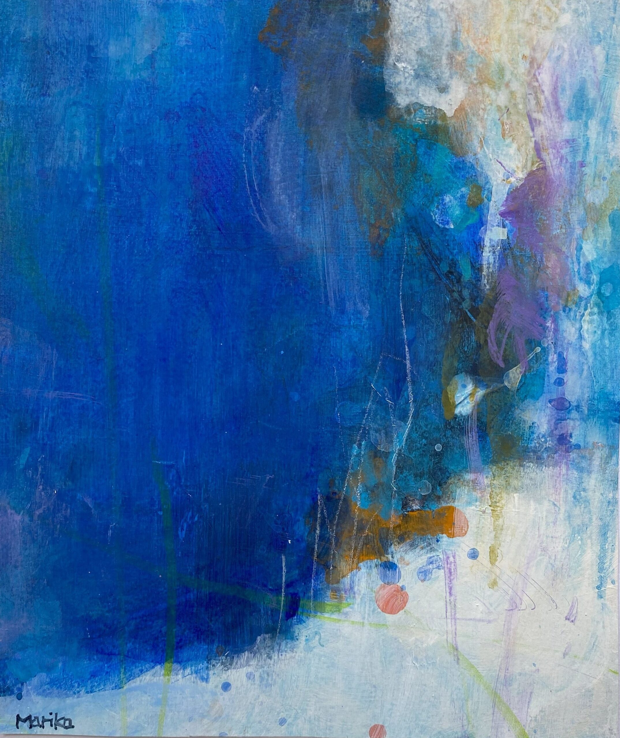 この絵は、青色を基調とした抽象画です。画面の大部分は深い青色で覆われており、流れるようなオレンジや紫、白などの色がアクセントとして配置されています。色の境界線はぼやけており、柔らかなグラデーションが全体的に広がっています。