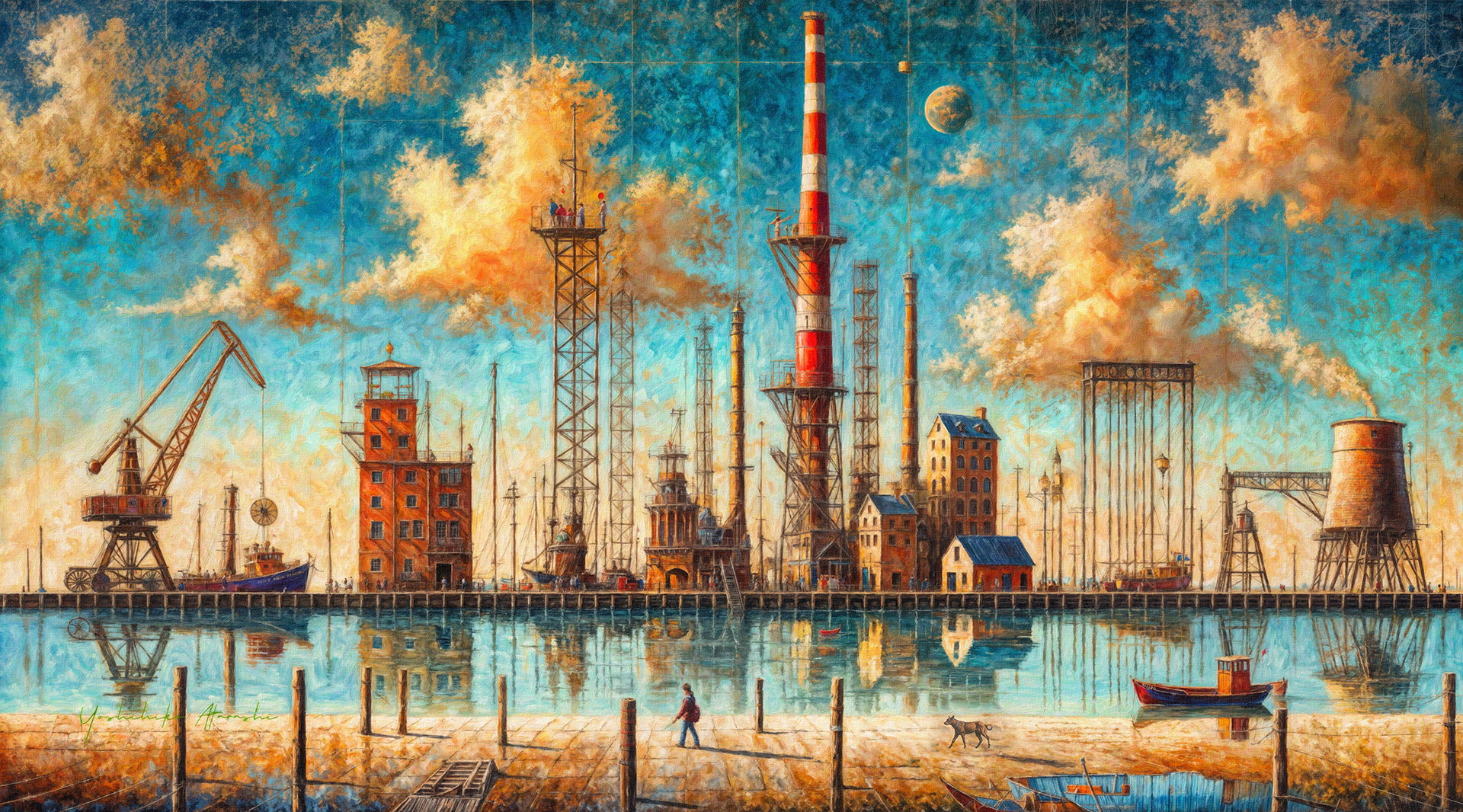 本作品群は、産業建築の迫力と詩的な風景が融合した希少なシリーズです。精緻な構図と温かな色調が、観る者の心に郷愁と静けさを呼び起こします。展示は横長の壁面に配置し、空間に時間の流れを演出すると効果的です。工業美に詩情を宿す、現代アートの新たな魅力をご堪能ください。