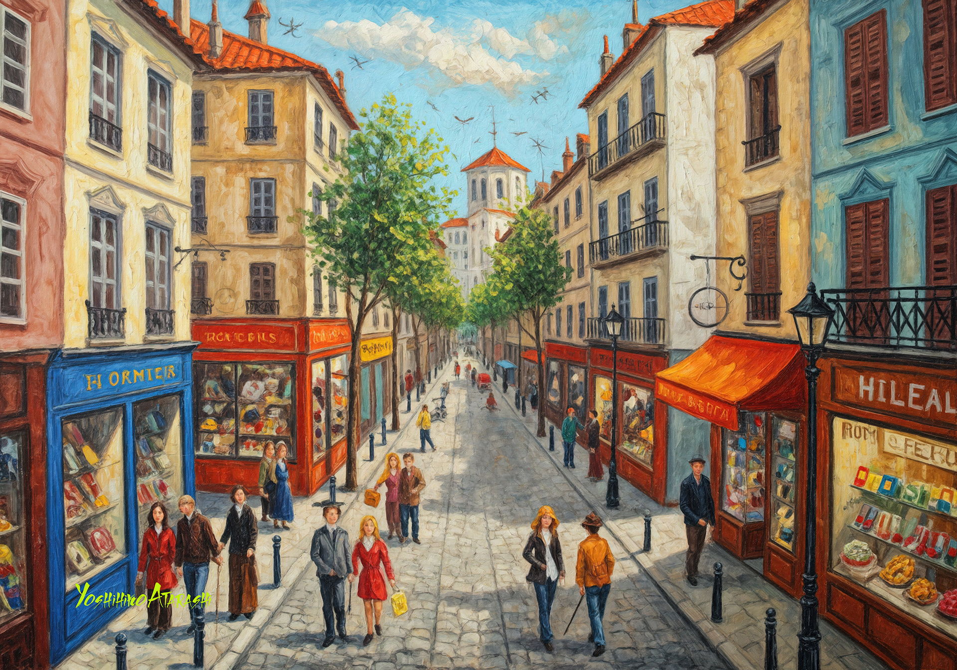 これらの作品は、「街の息づかいと時代の記憶」をテーマに描きました。色彩豊かな建物と行き交う人々、さまざまな乗り物、都市の喧騒と活気、そして過ぎ去った時代への郷愁を表現しています。遠近法を強調した構図と厚塗りの筆致で、絵の中に吸い込まれるような臨場感を生み出しました。懐かしくも力強い街の風景を、誰もが心に持つ原風景として届けたいという想いを込めています。