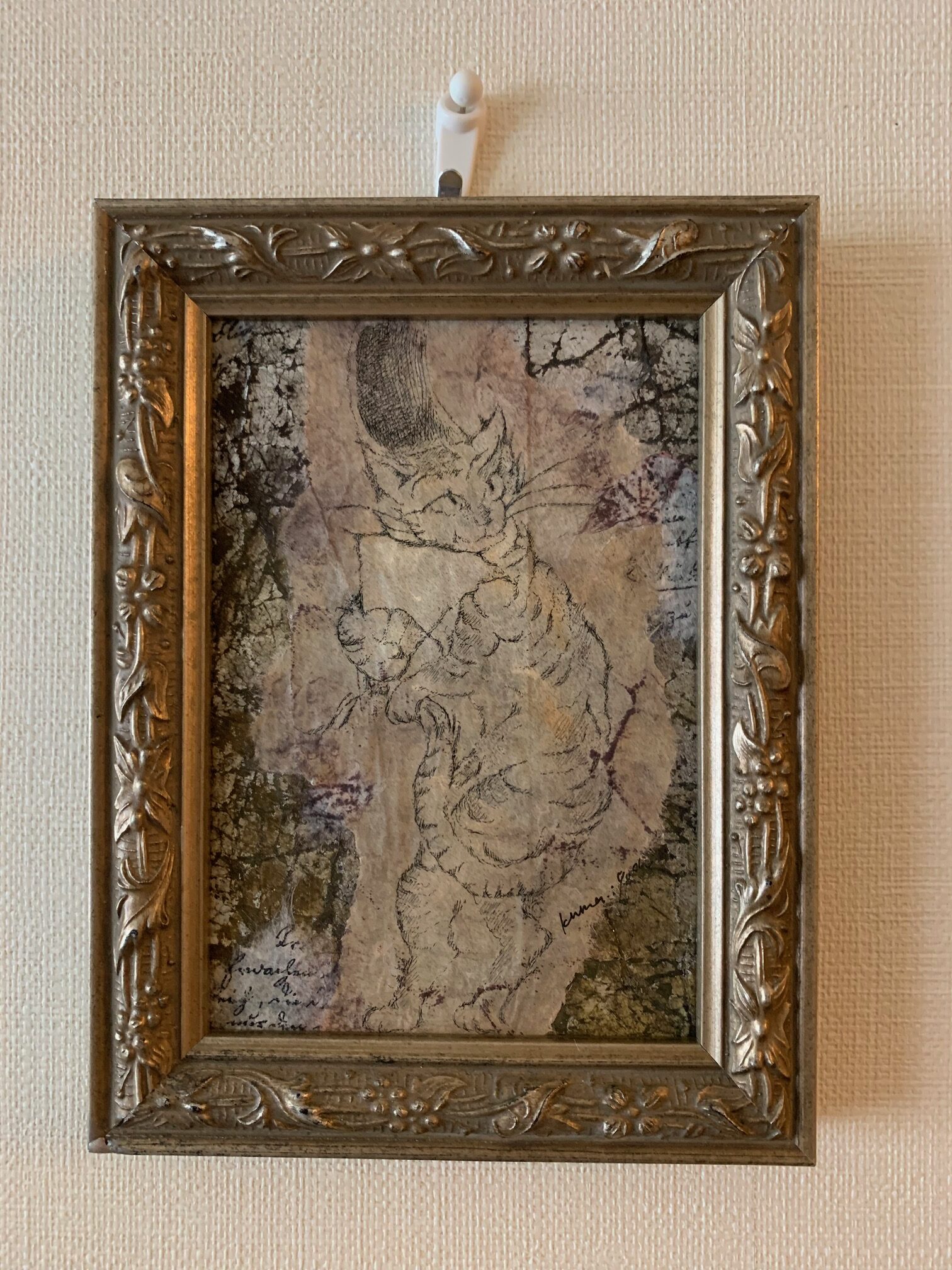 鳥獣戯画の猫を銅版画にして、コラージュしました。コラージュの素材は和紙などを染色したり、箔、日本画の画材で作り込んでいるので凝っています。こちらは渋かっこいい感じの珍しい鳥獣戯画です。吊り下げ金具がついているので吊り下げができます。表面にアクリル板ありですが、外していただくと、箔でところどころ渋く光る色をより楽しんでいただけると思います。