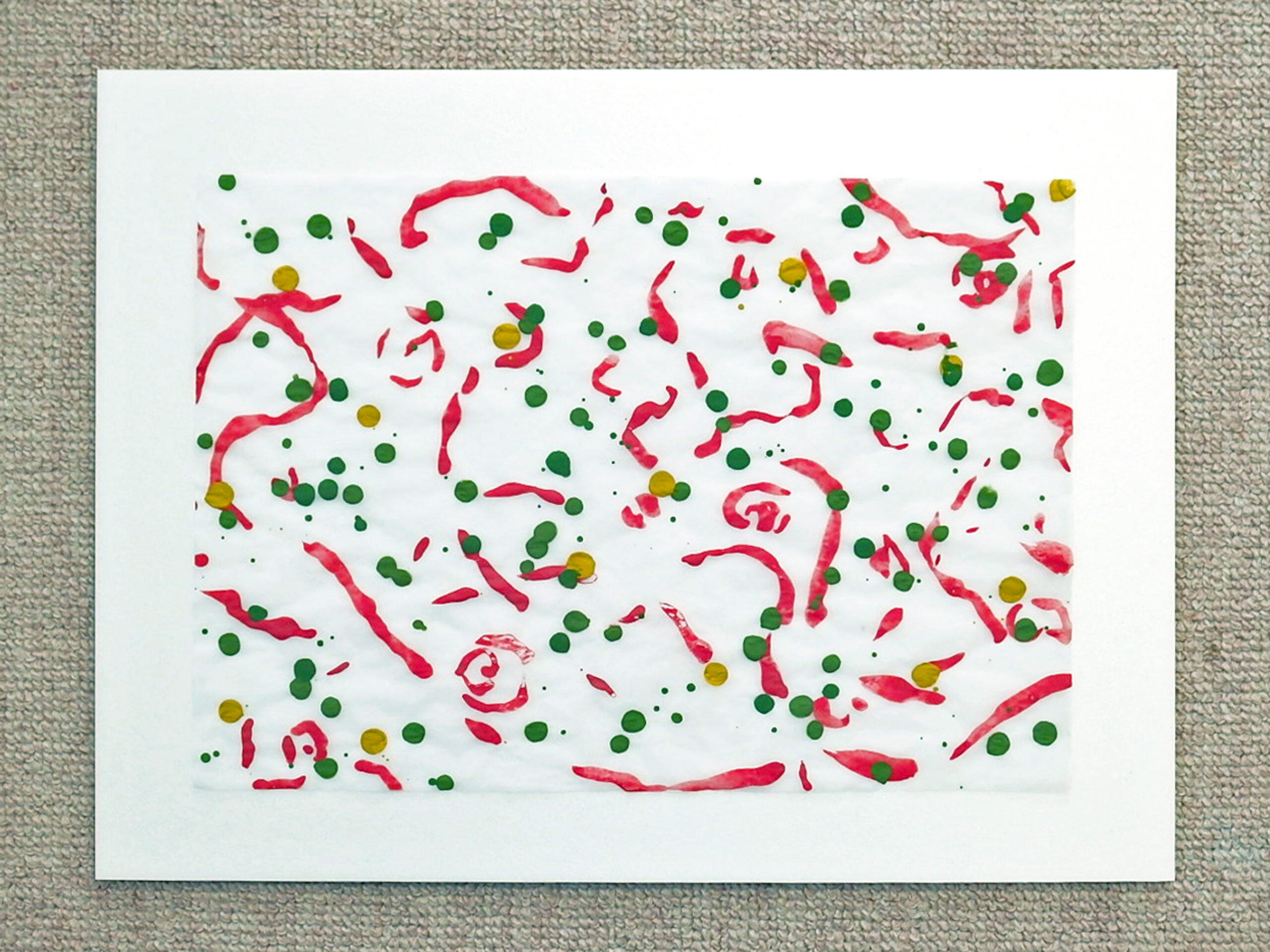 スチレンペーパーという光沢のある真っ白な素材に、岩絵の具自体の美しさが際立ちます。この組み合わせを発見し、気に入って使い続けています。