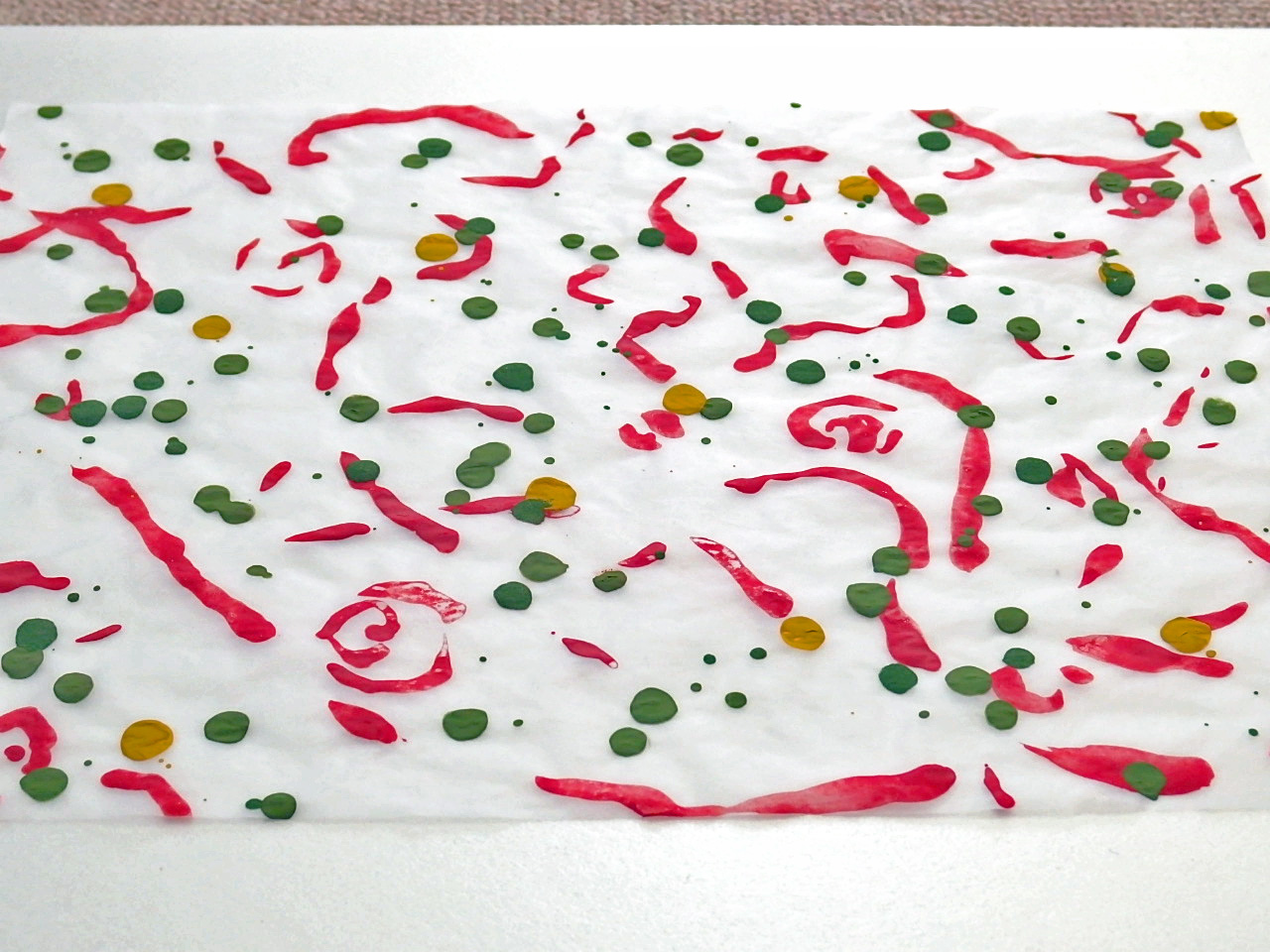 天然素材の和紙に膠を使うのが「日本画」の常識ですが、あえて人工素材を使っています。