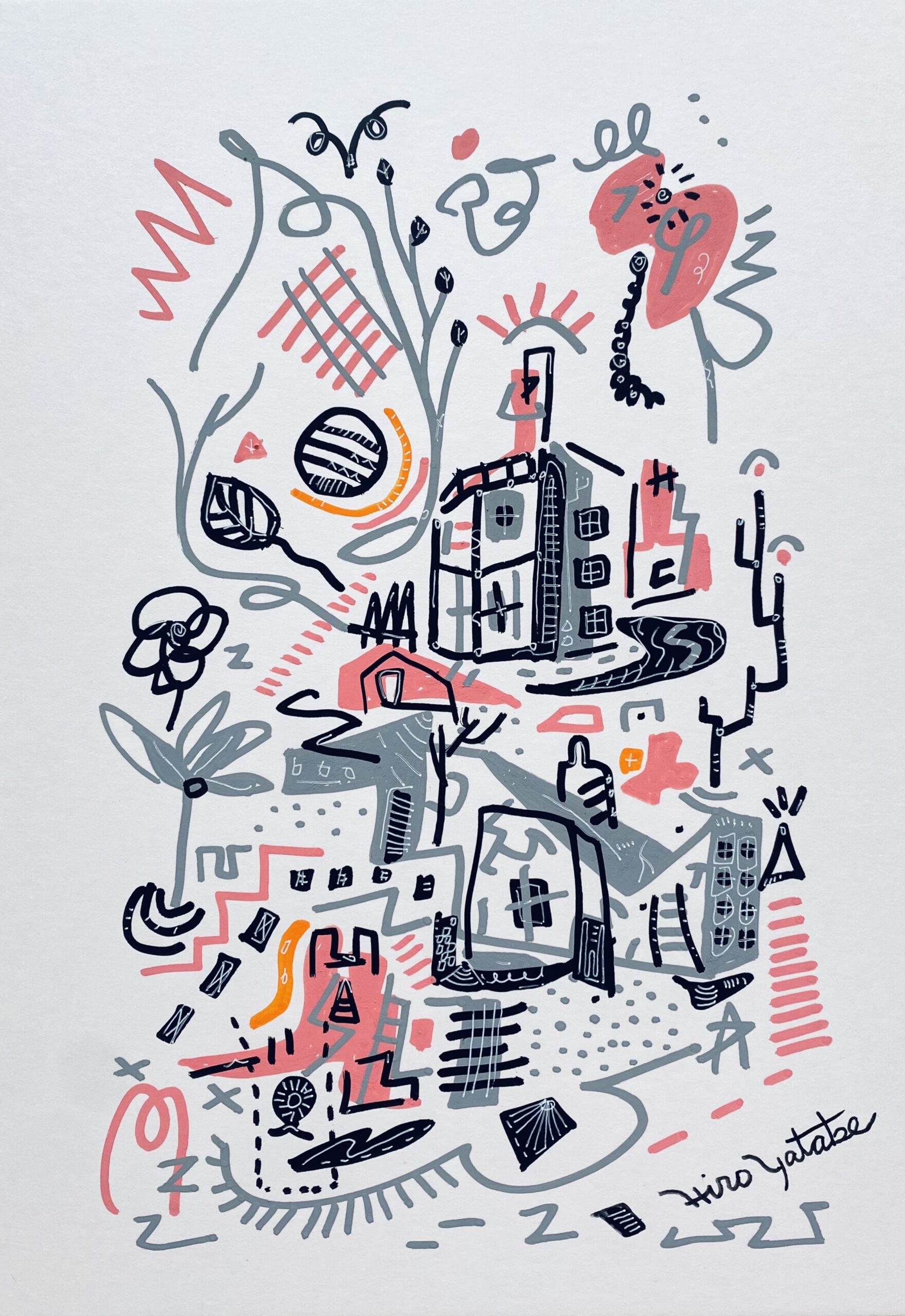 2008年 浮かんだイメージを付箋にボールペンでスケッチ。2012年になりそれをまとめたものを知人に見せたところサイズや画材をかえて絵画として発表することを勧められ、2013年、公募展にA4サイズのカードボードにペン・パステルで描いた作品を出品。その後アクリル絵具での創作をスタート。