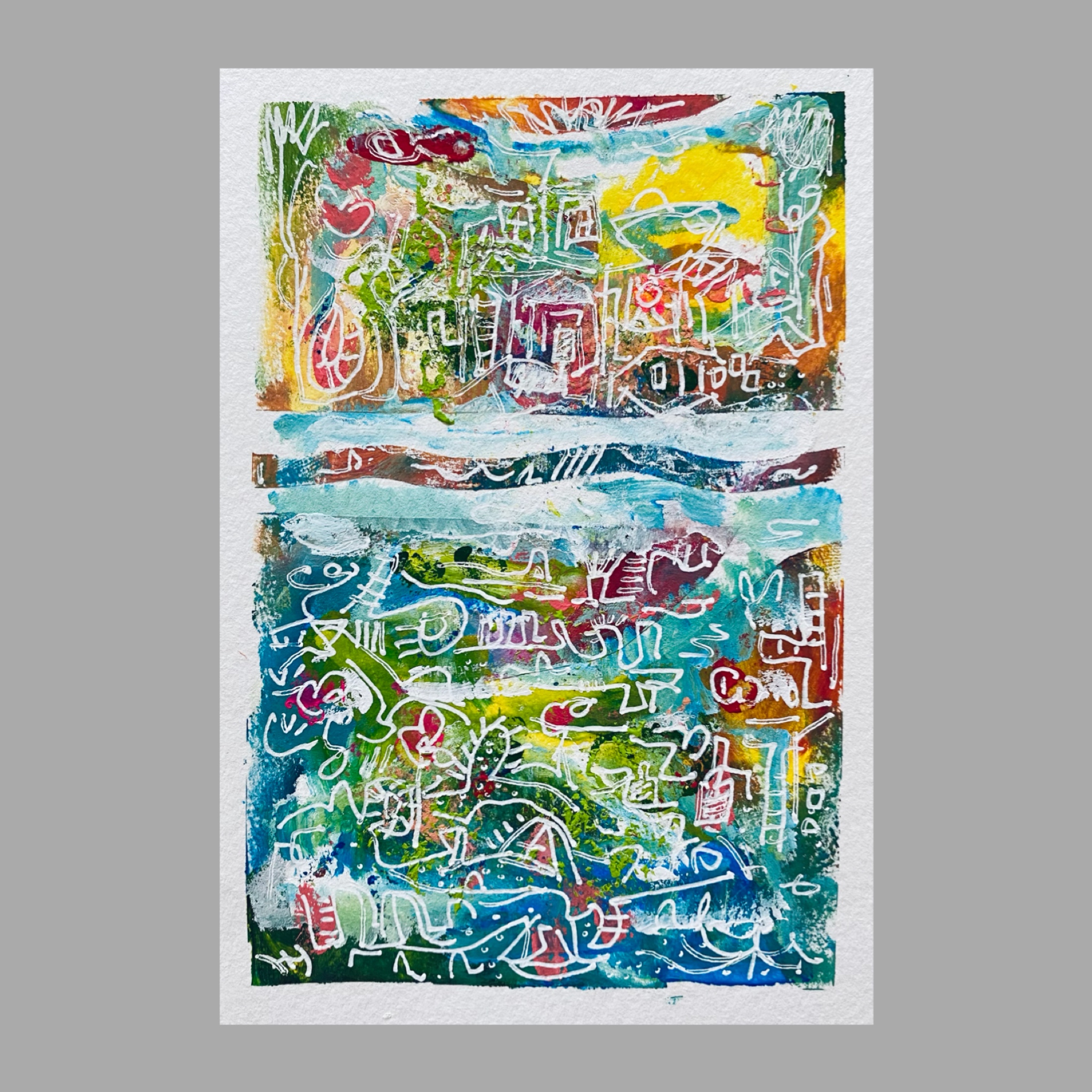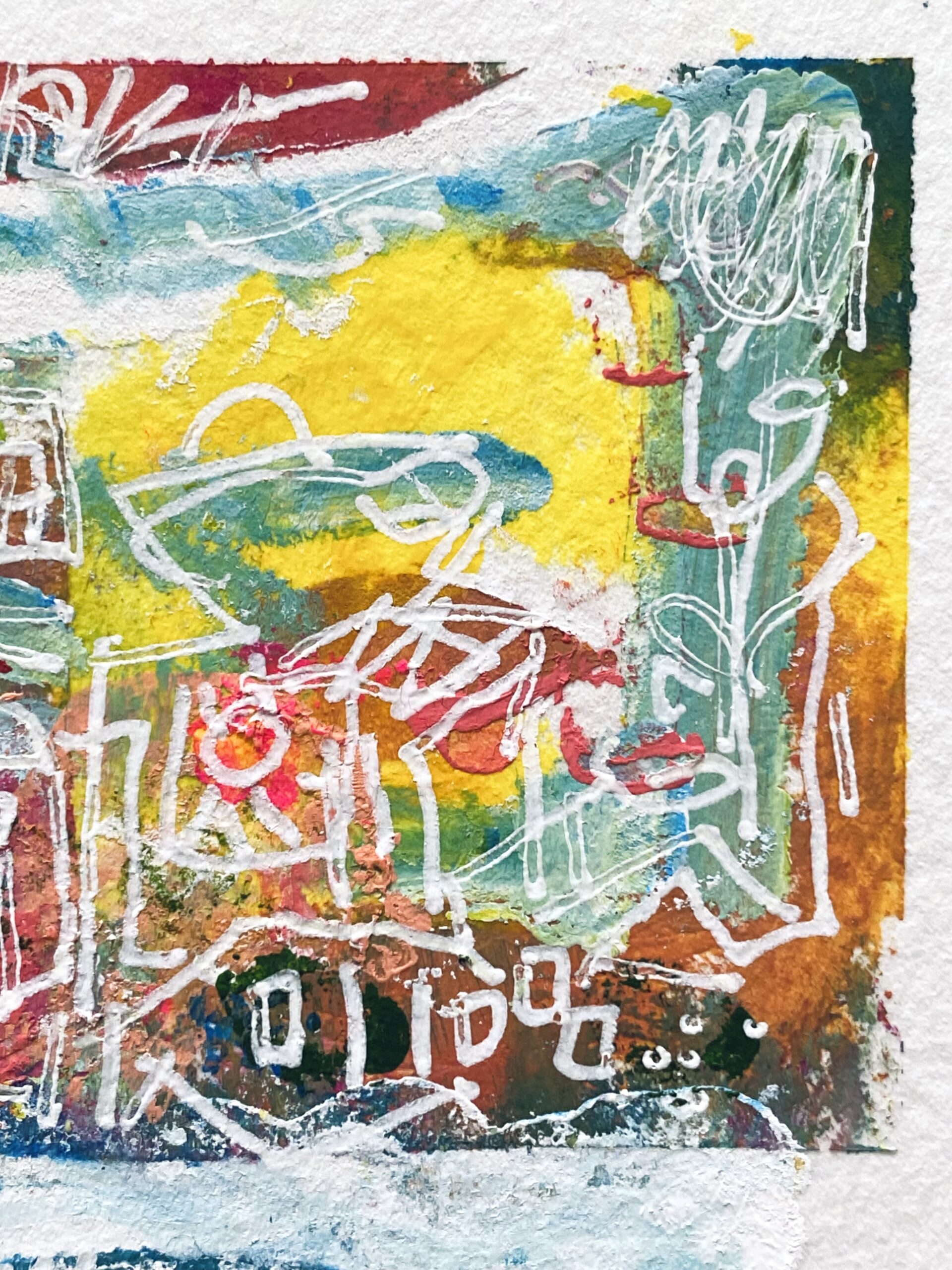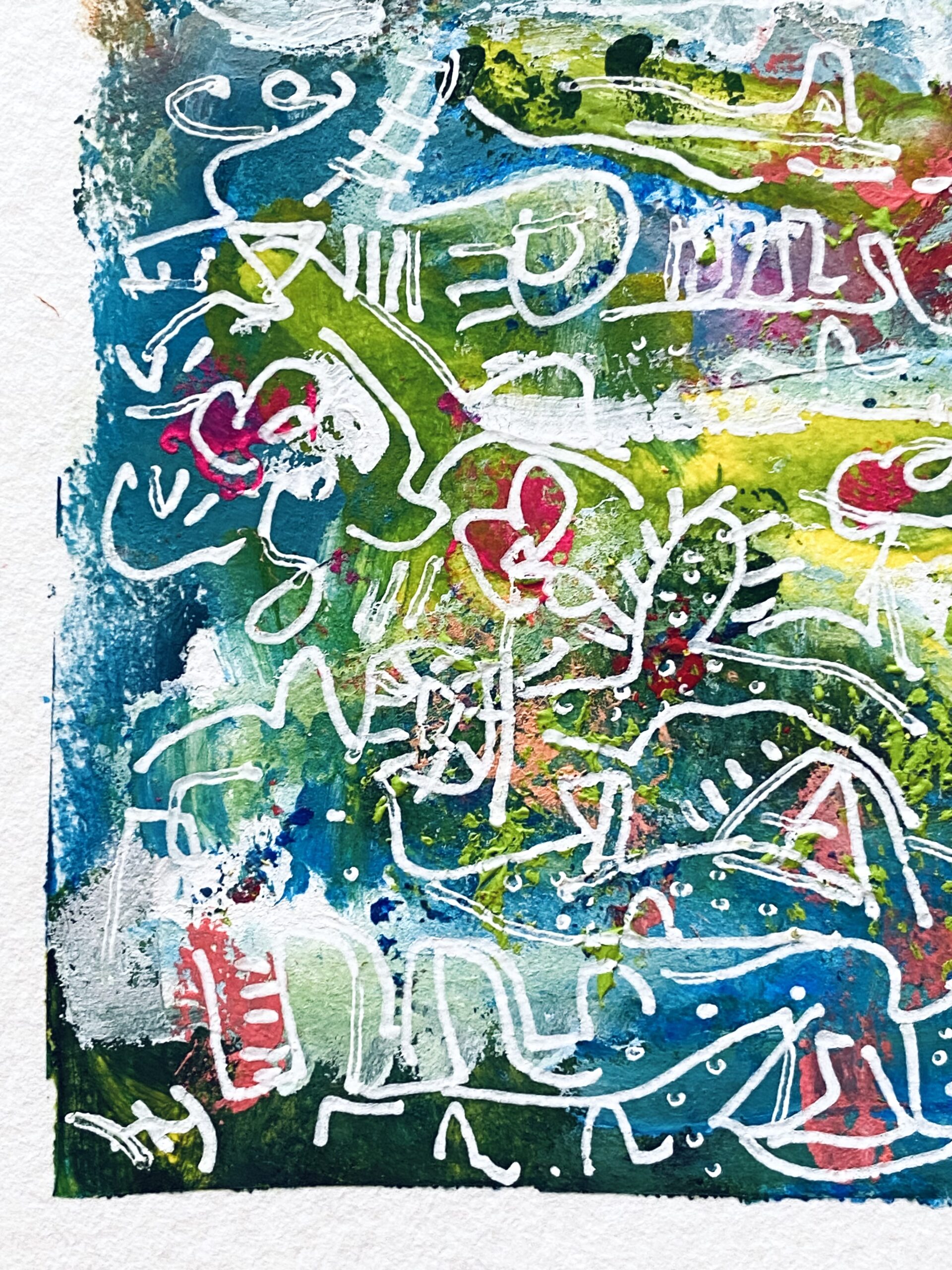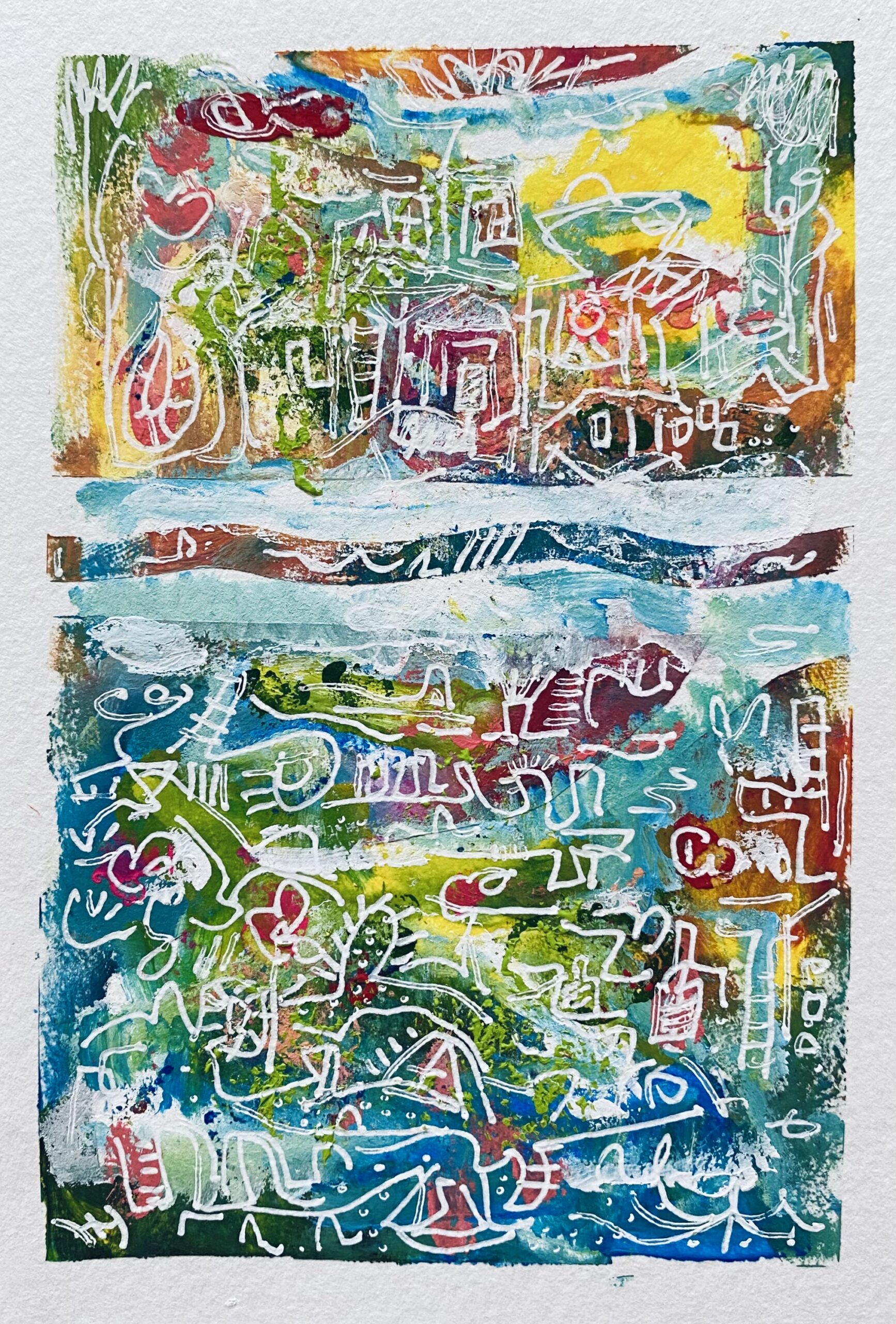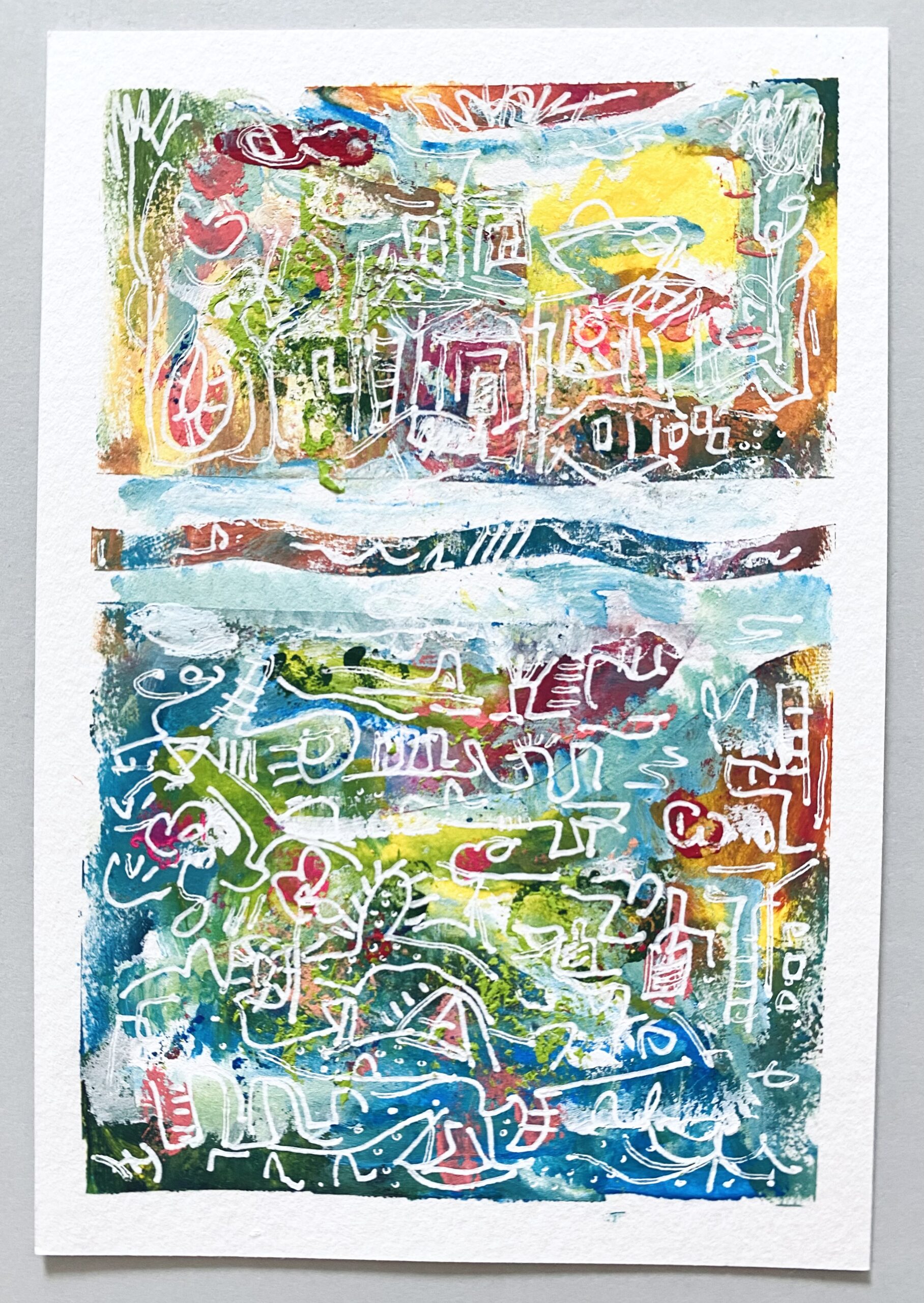 シリーズ作品を除き、タイトルは創作のはじめにあったものではなく、描き終えた時点で観る側となった私が名付けた「仮のタイトル」です。参考にするのも、答え合わせのように楽しむのも、あるいはまったく無視するのも自由です。抽象表現の色や形に意味を見出す手がかりは、あなたの記憶や経験のなかにしかありません。最終的な作品は観るかたの中で完成すべきものだと考えています。思い思いに想像の翼を羽ばたかせ、作品に新しい解釈を加えていただくことを望みます。