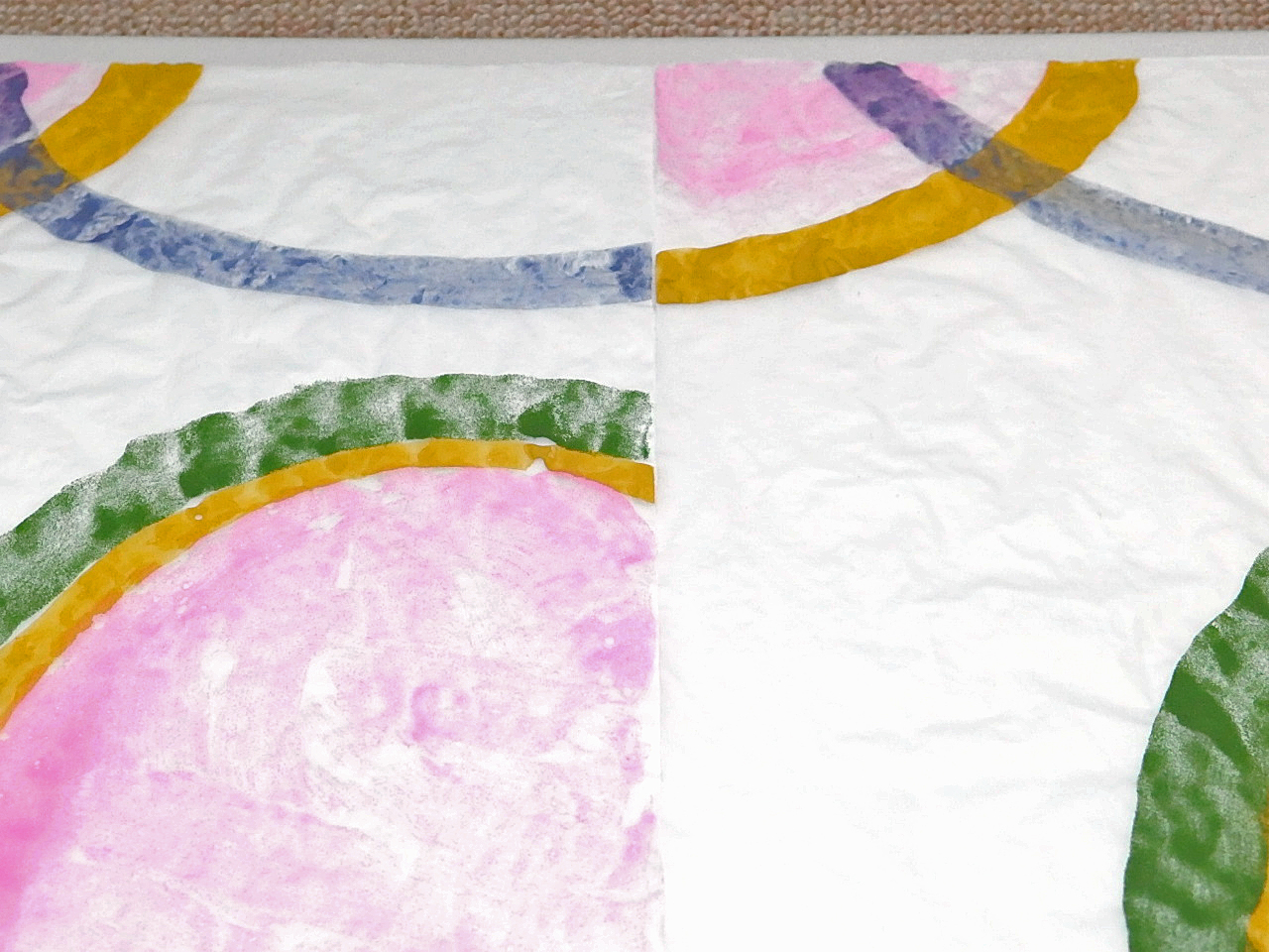 天然素材の和紙に膠を使うのが「日本画」の常識ですが、あえて人工素材を使っています。