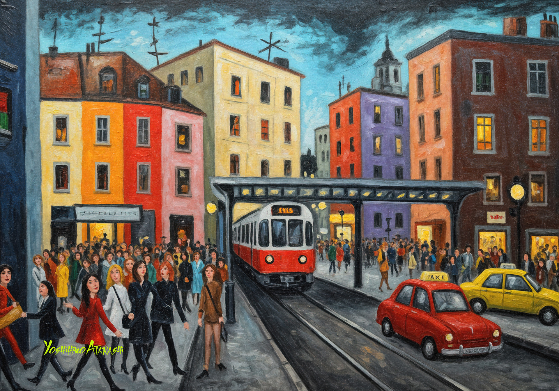 本作は、色彩と構図で都市のエネルギーとノスタルジーを見事に融合させたシリーズです。異なる時代の列車や建築が共存し、観る者を時空を超えた旅へと誘います。都市の変遷や人々の営みを物語として体感できます。空間全体に躍動感と温かさを与える、非常に魅力的な作品群です。