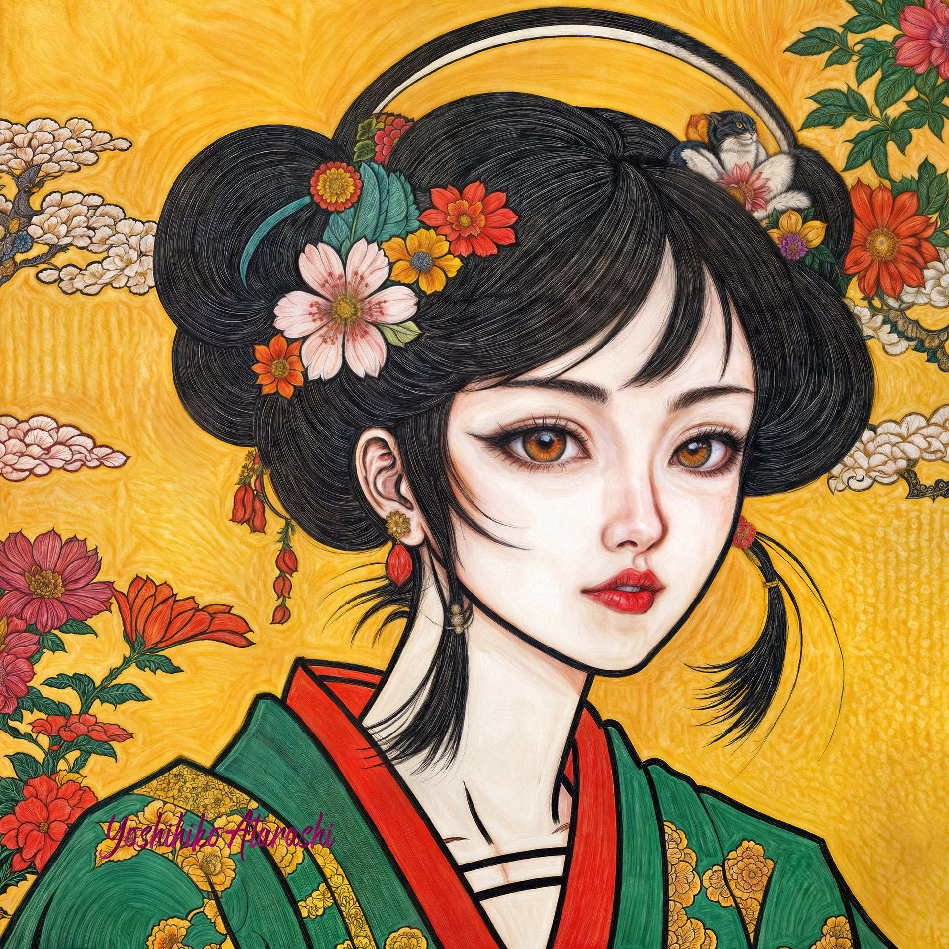 これらの作品は、日本の伝統美とモダンアートが融合した、唯一無二の魅力を持つ逸品です。細部まで描き込まれた華やかな着物、美しい女性の表情、そして幻想的な色彩が、見る人を魅了します。浮世絵や大正ロマンの要素を取り入れながらも、現代的な感性で再構築されており、和の美しさを新たな視点で楽しめる作品です。お部屋に飾るだけで空間が華やぎ、洗練された雰囲気を演出します。ぜひこの機会に、特別な一枚をお手元に迎えてみませんか?