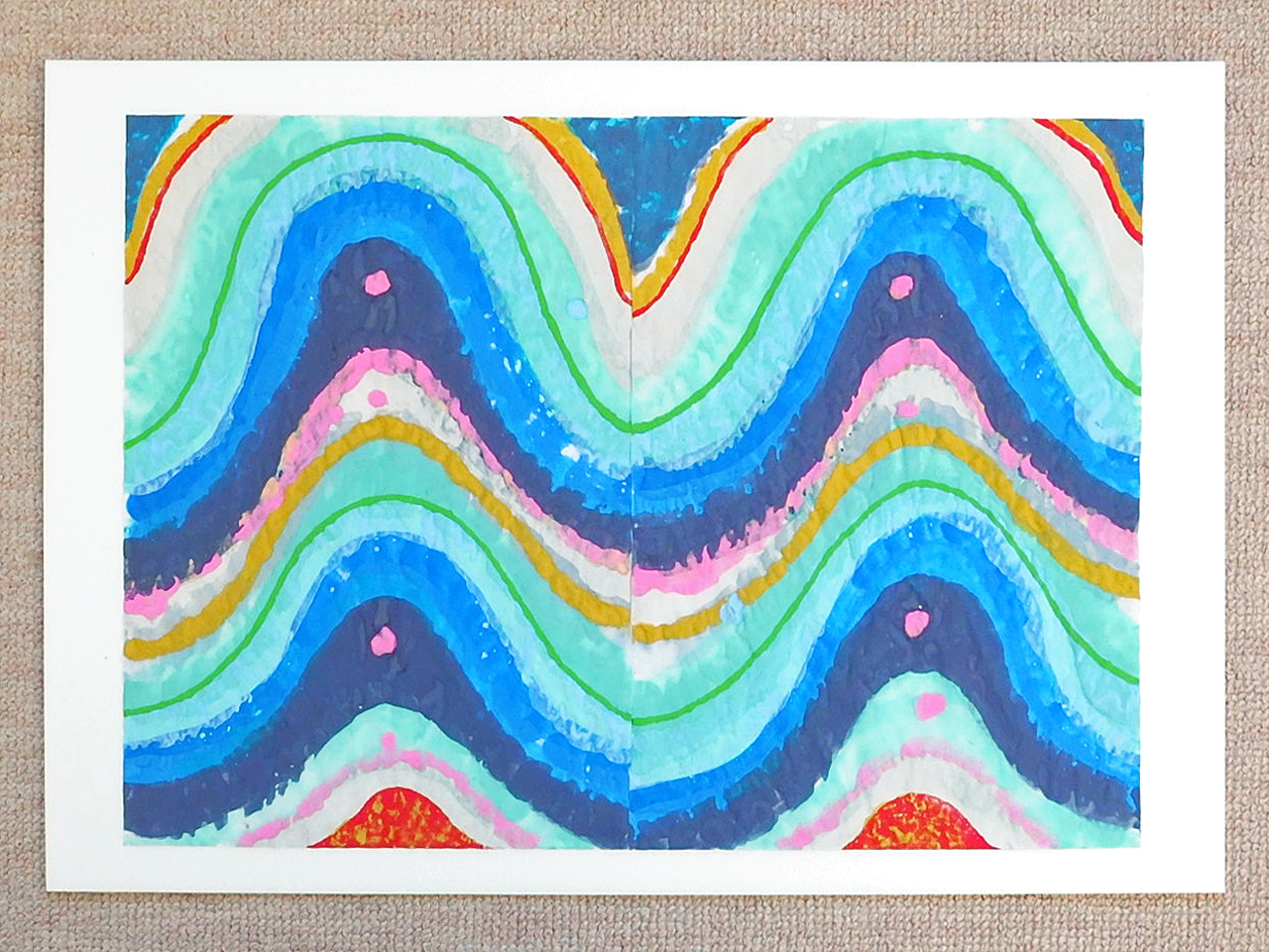 スチレンペーパーという光沢のある真っ白な素材に、岩絵の具自体の美しさが際立ちます。この組み合わせを発見し、気に入って使い続けています。