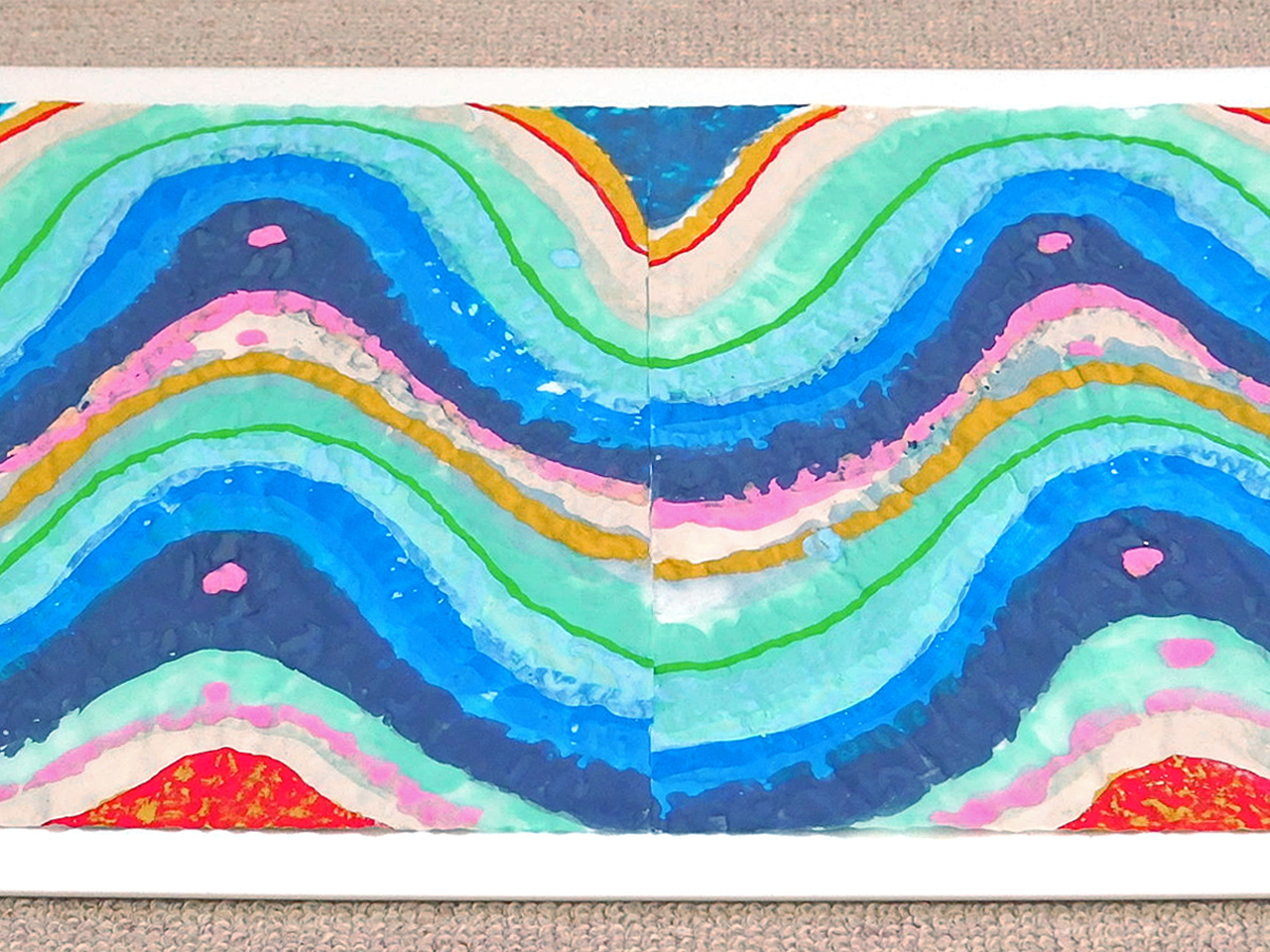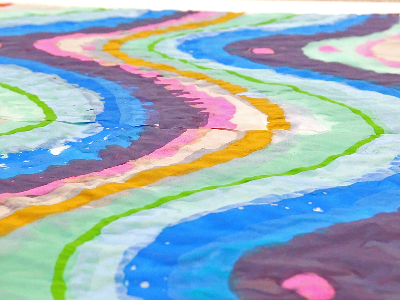 天然素材の和紙に膠を使うのが「日本画」の常識ですが、あえて人工素材を使っています。