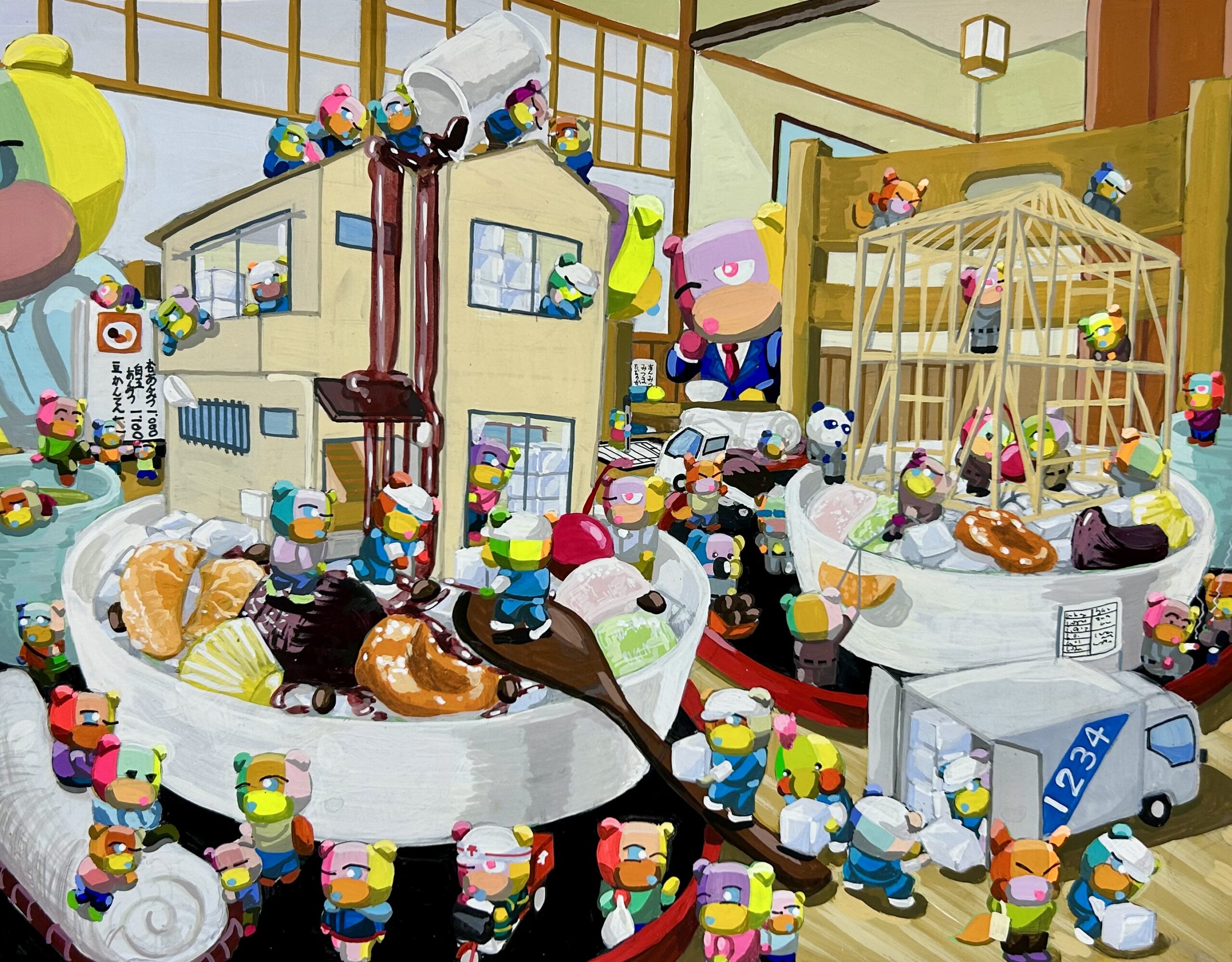 あんみつの上に一戸建て住宅が立っており、屋根から黒蜜をかけています。また引っ越しで運び込まれる段ボール箱のごとく、引越し業者が寒天を家に運んでいます。