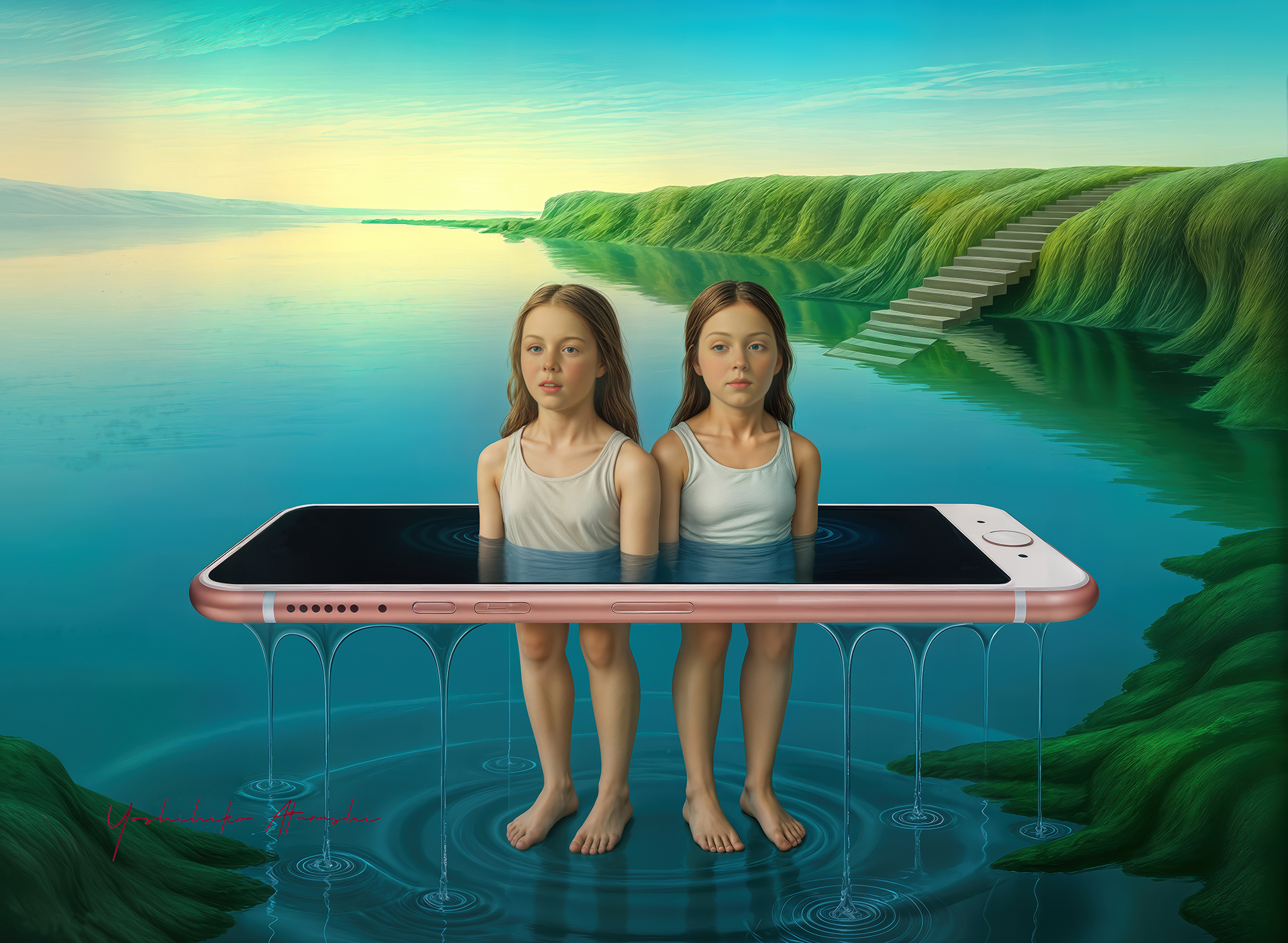 本シリーズは、スマートフォンという現代の象徴を舞台に、少女たちの記憶や感情を幻想的に描いた話題作です。静けさと哀愁をたたえた表 情、水面に映るもう一つの世界――その詩情豊かな構図は、観る者の内面に深く訴えかけます。インテリアとしても映え、現代アートの新たな コレクションとして高く評価される作品群です。
