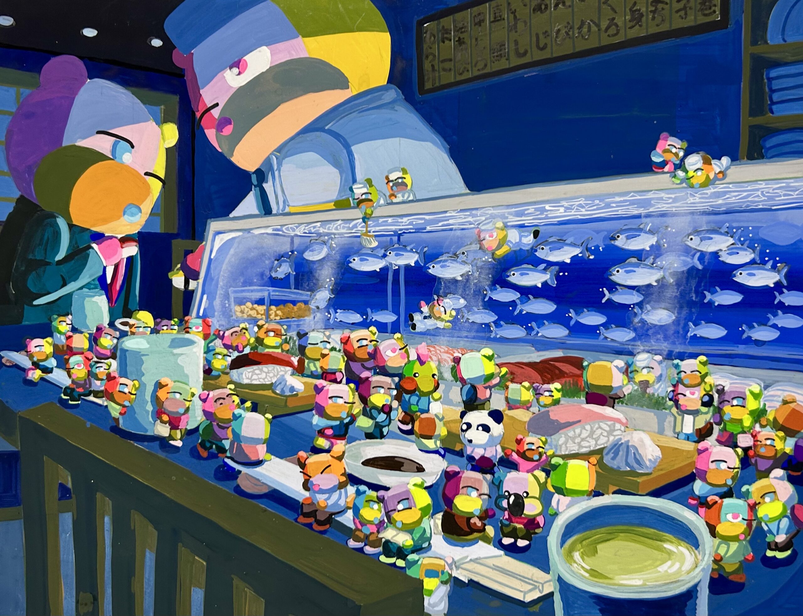 お寿司屋さんのカウンター席のネタケースが水族館の大水槽になっています。