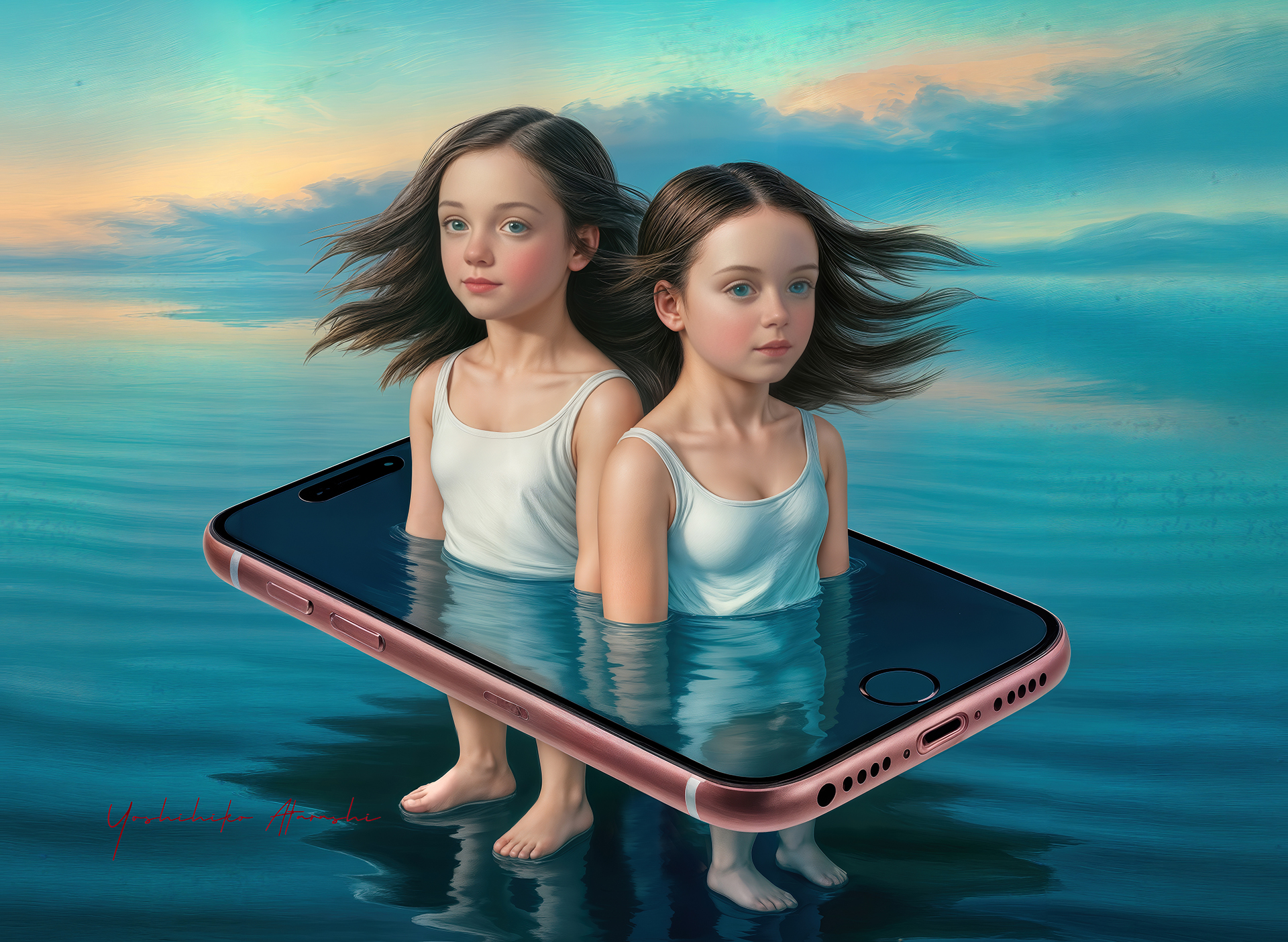 本シリーズは、スマートフォンという現代の象徴を舞台に、少女たちの記憶や感情を幻想的に描いた話題作です。静けさと哀愁をたたえた表 情、水面に映るもう一つの世界――その詩情豊かな構図は、観る者の内面に深く訴えかけます。インテリアとしても映え、現代アートの新たな コレクションとして高く評価される作品群です。