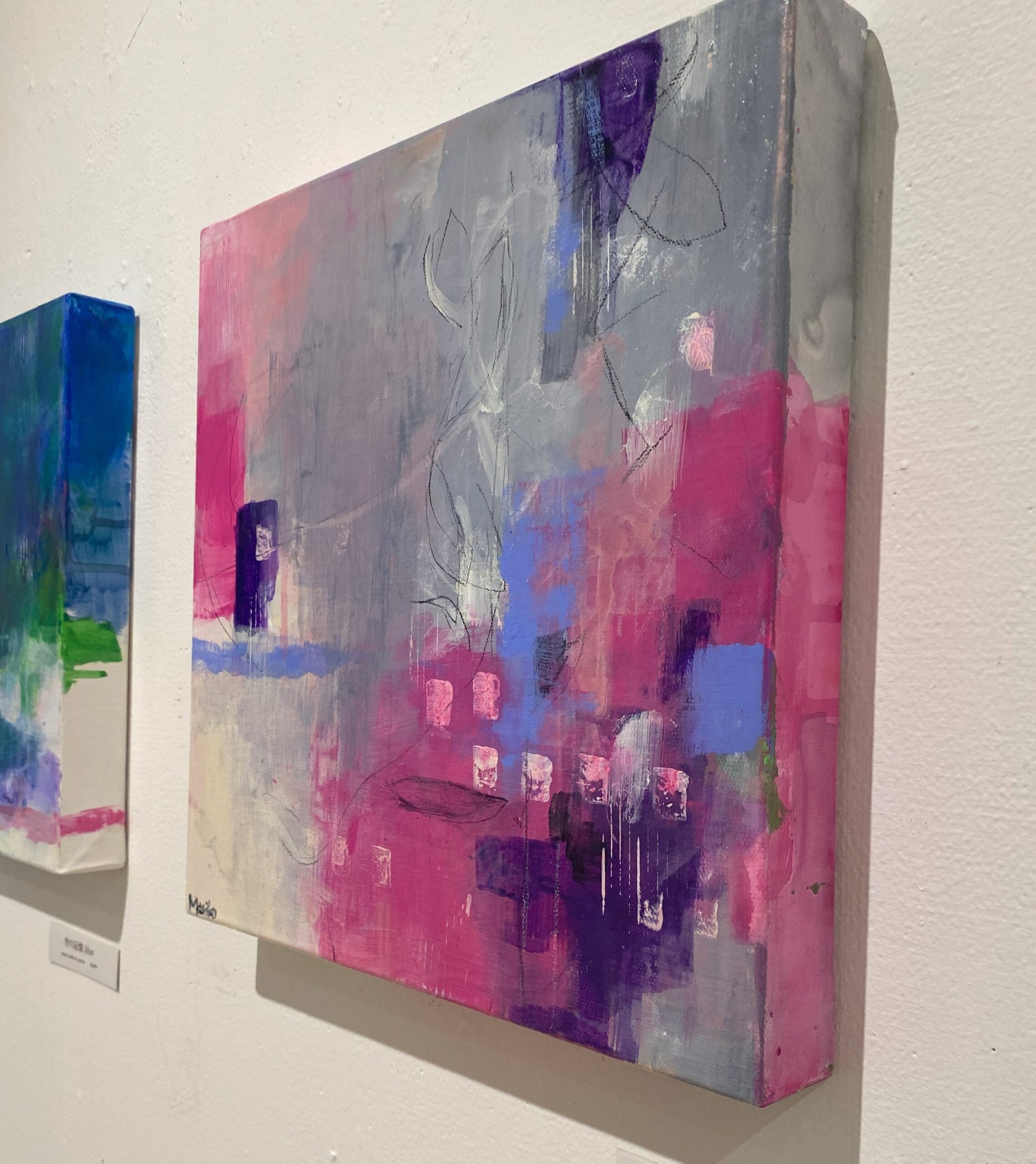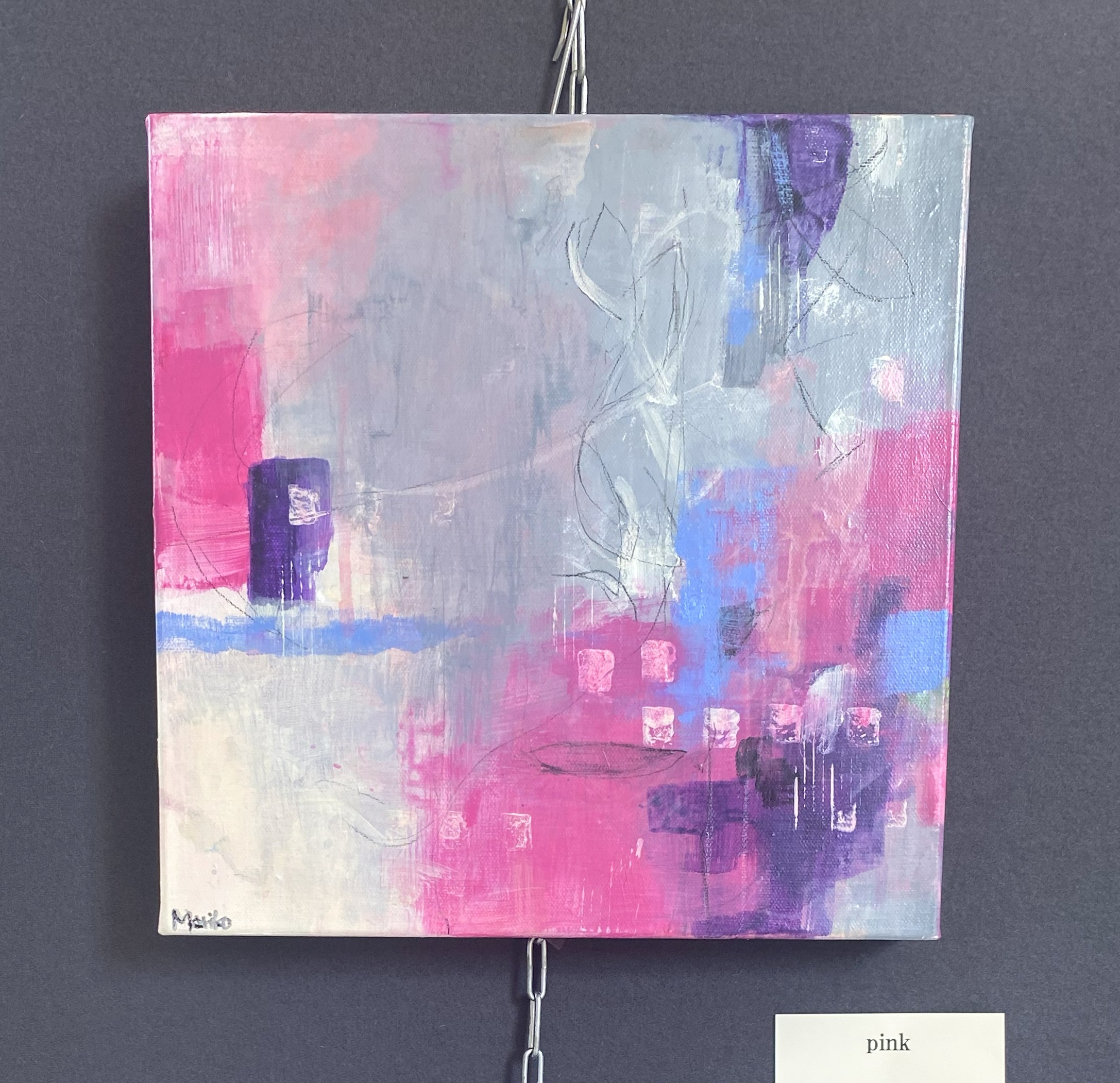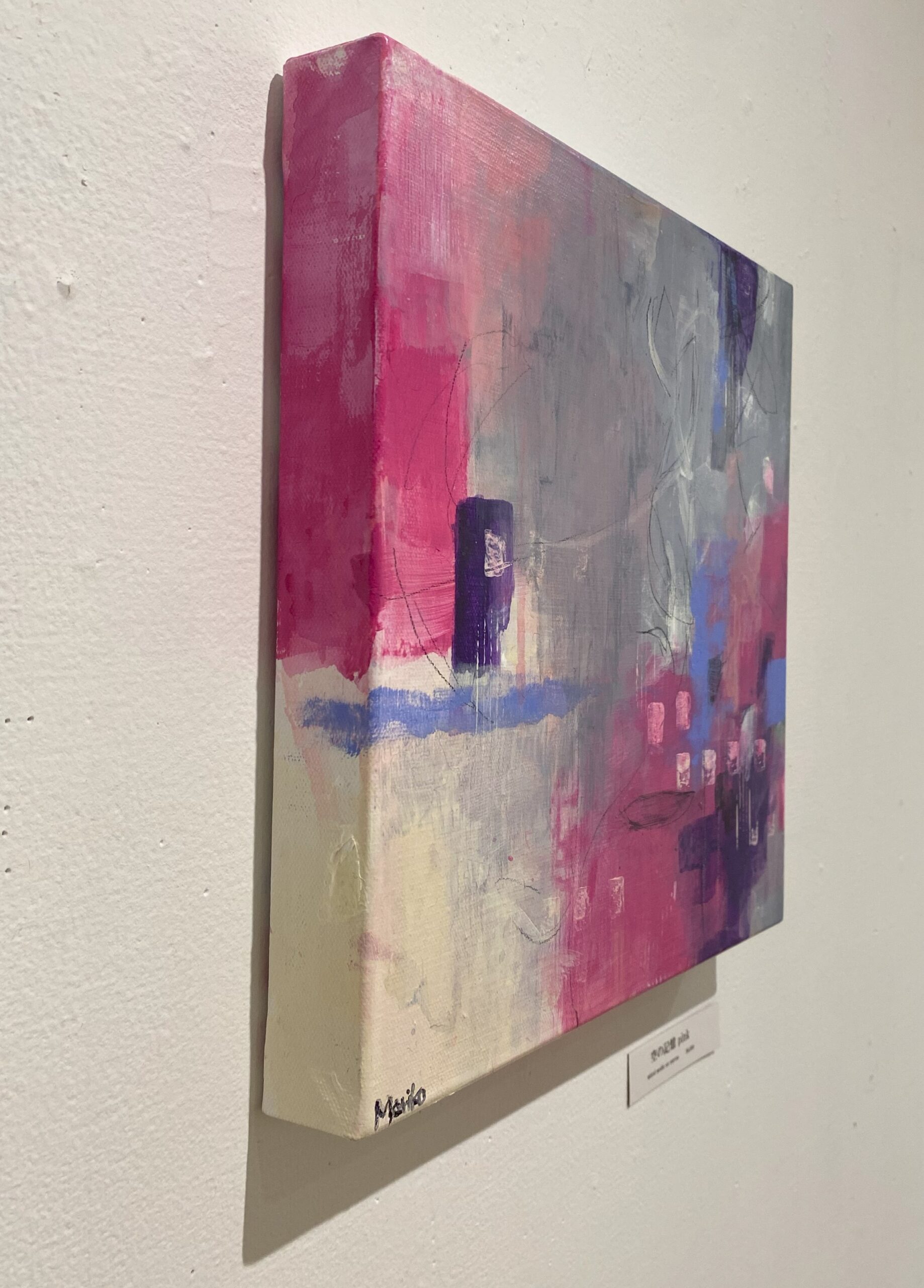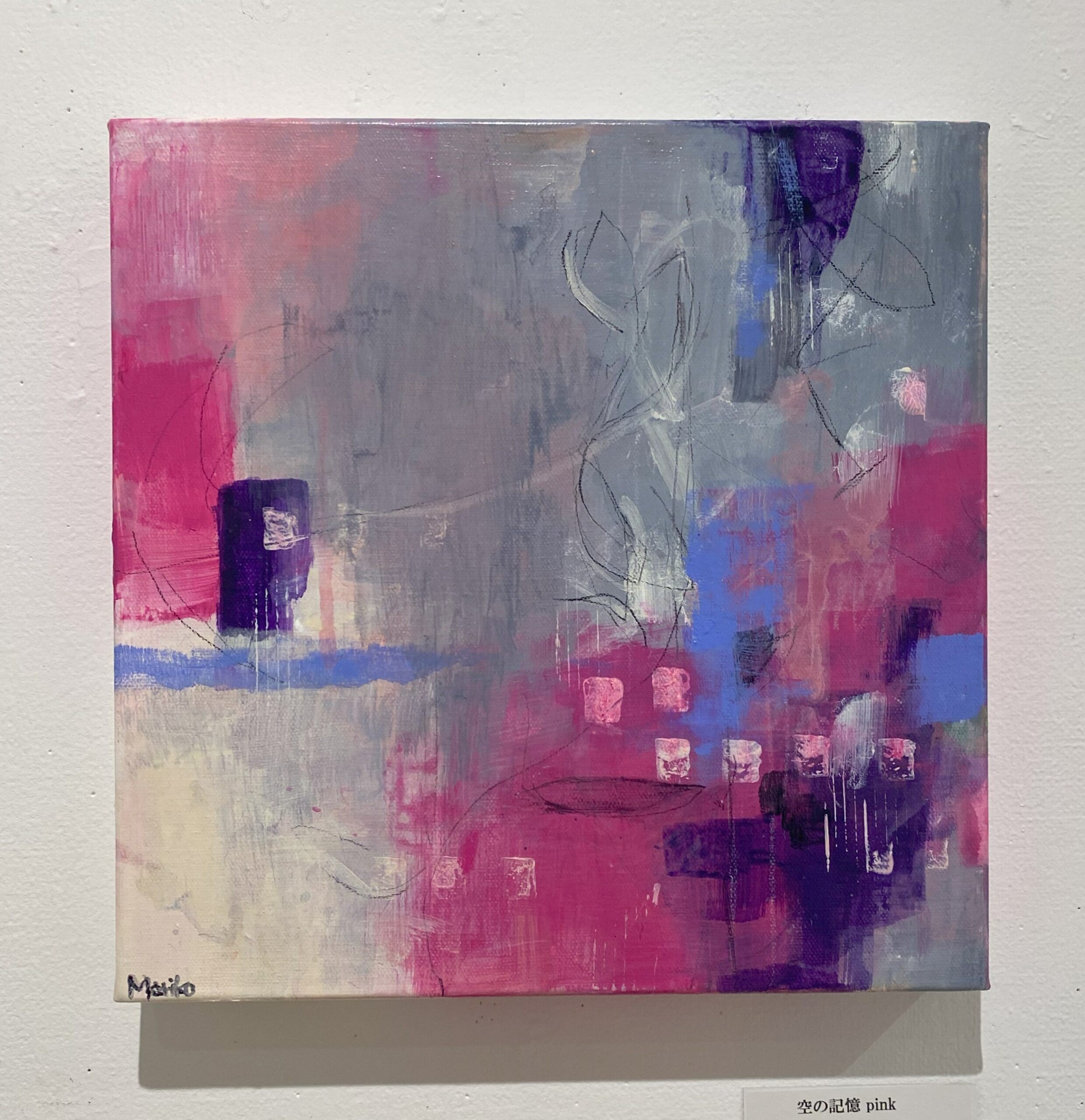 やわらかなピンクと落ち着いたグレーが重なり合う、記憶の情景を描いた抽象画です。