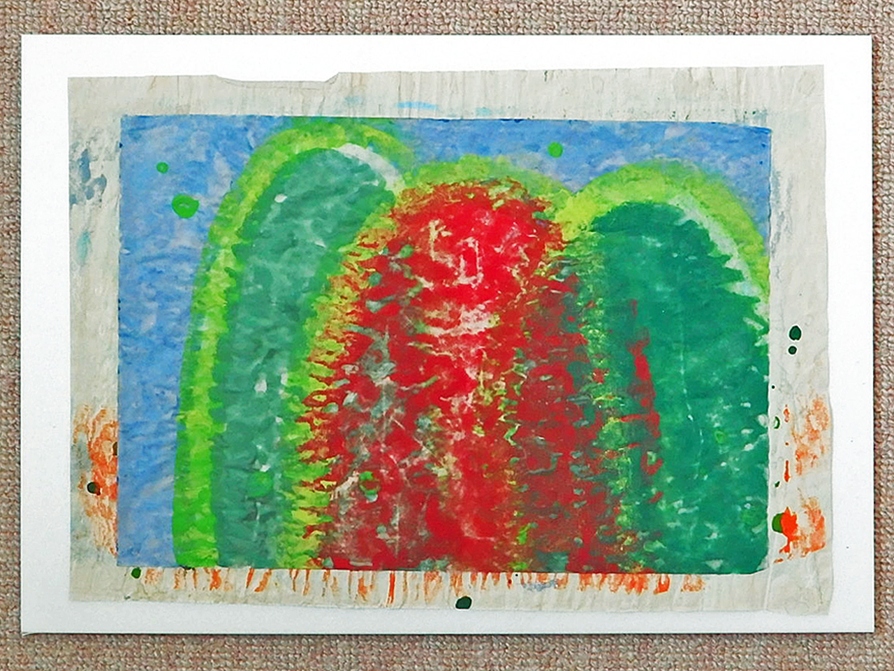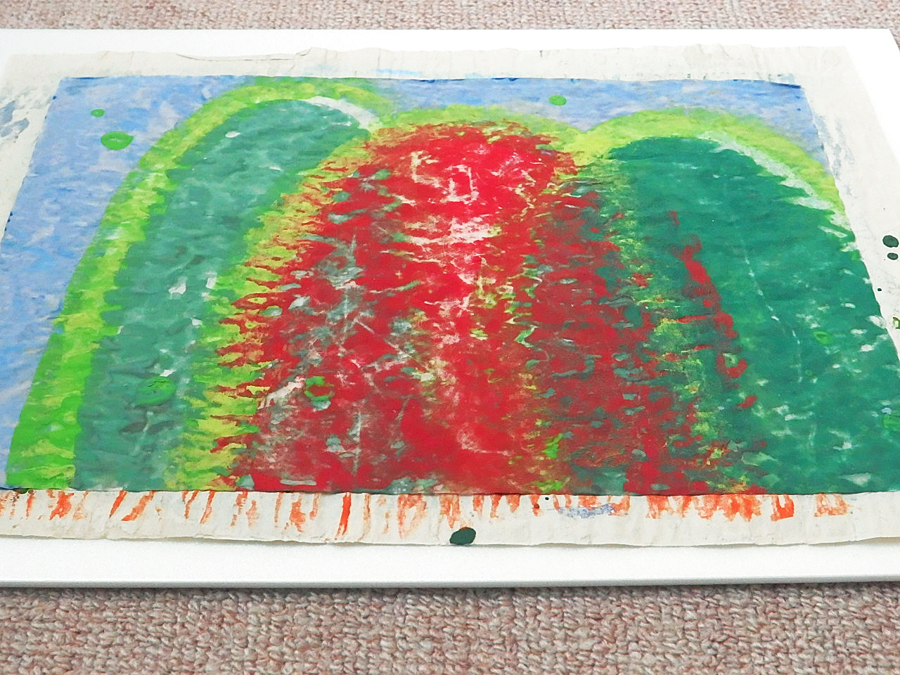 スチレンペーパーという光沢のある真っ白な素材に、岩絵の具自体の美しさが際立ちます。この組み合わせを発見し、気に入って使い続けています。