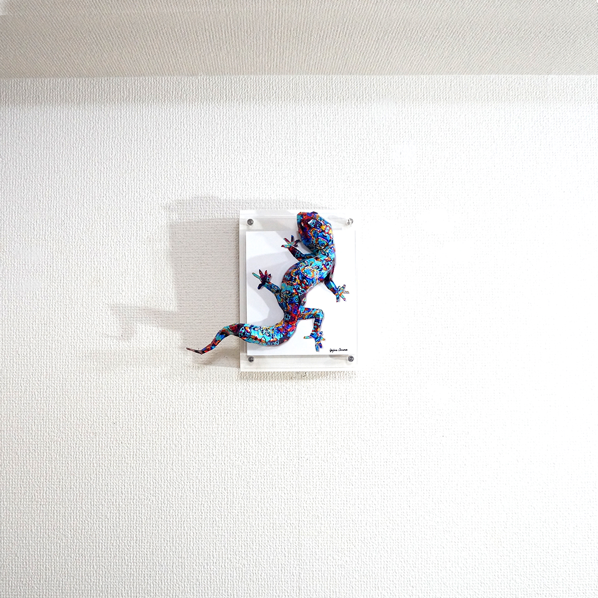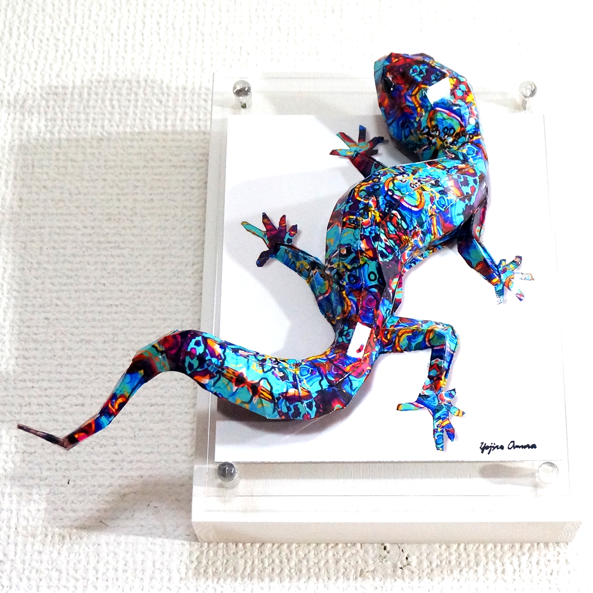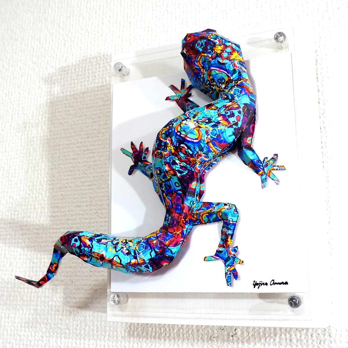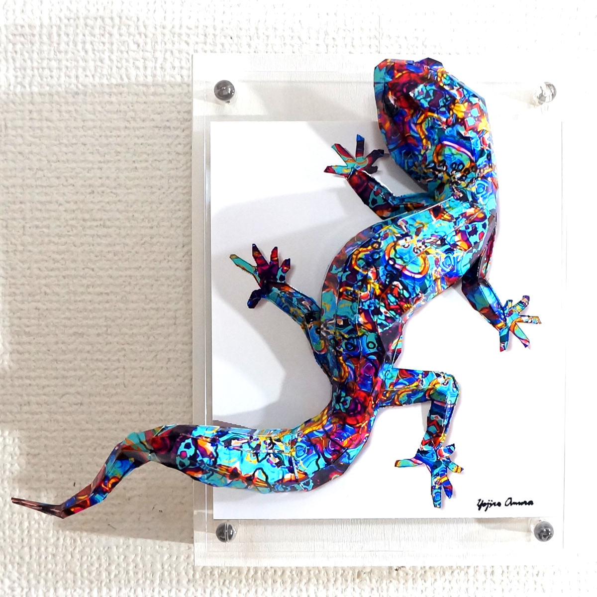青を基調とした抽象画をイメージしたパターンにトカゲ本来の模様に重ね合わせたデザインです。表面上は光沢紙の艶のある質感です。