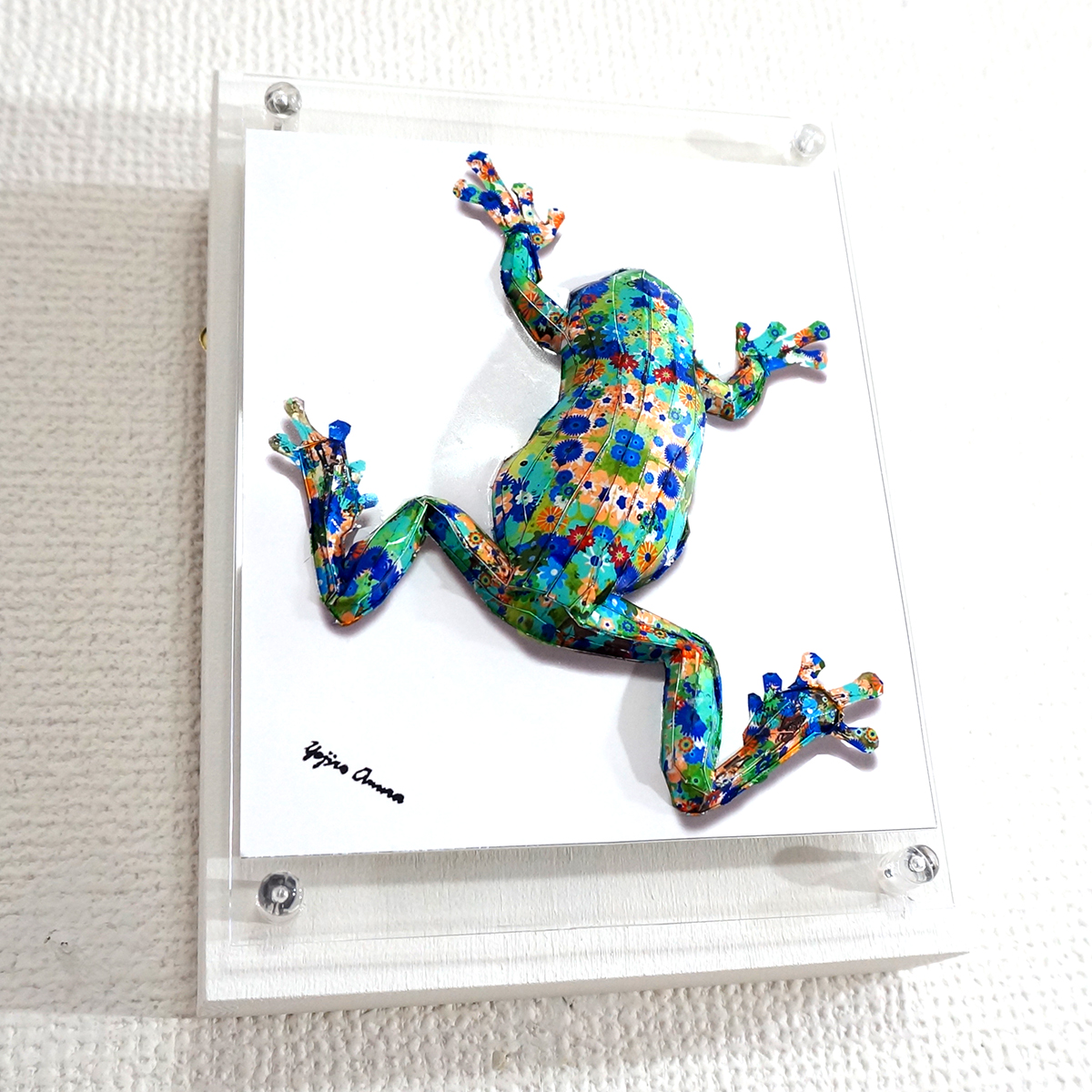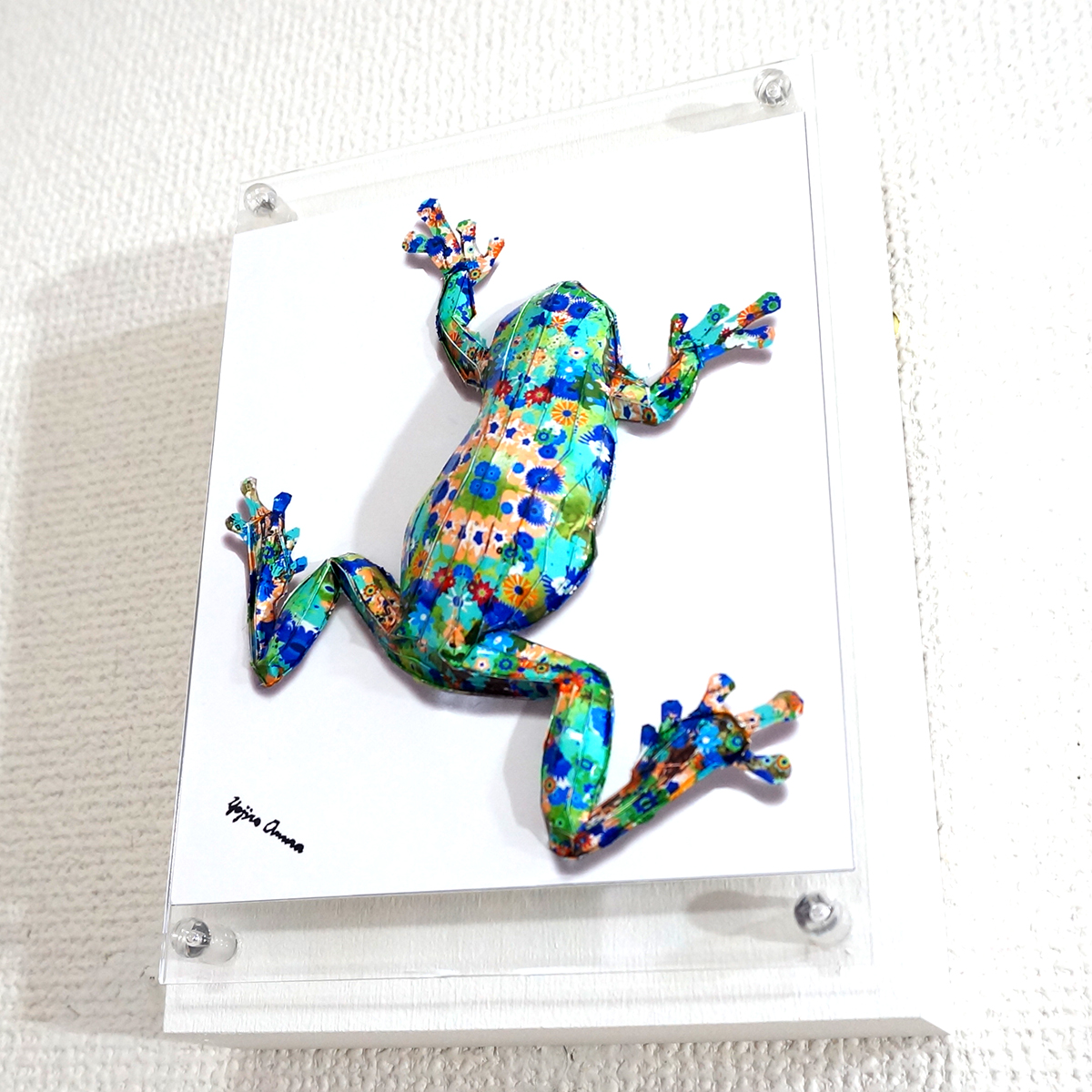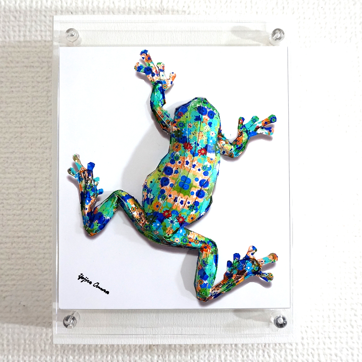 アマガエルのコラージュ画像を作成しペーパークラフト技術を用いて立体的に表現した作品です。