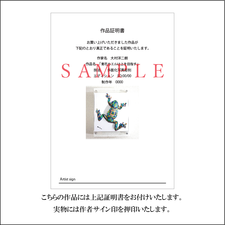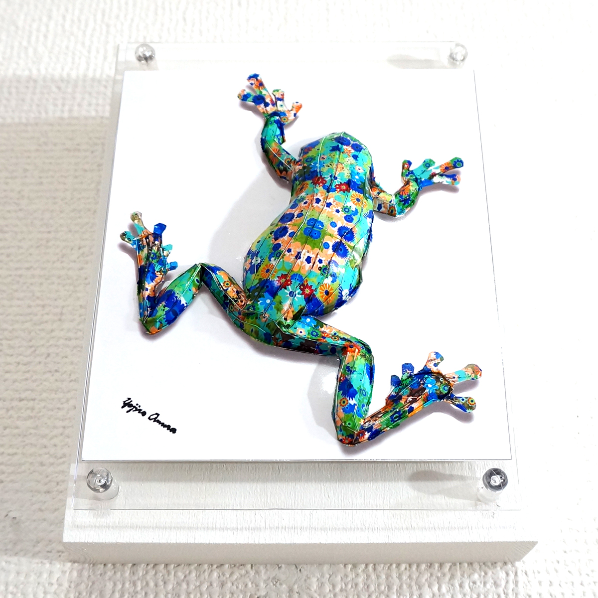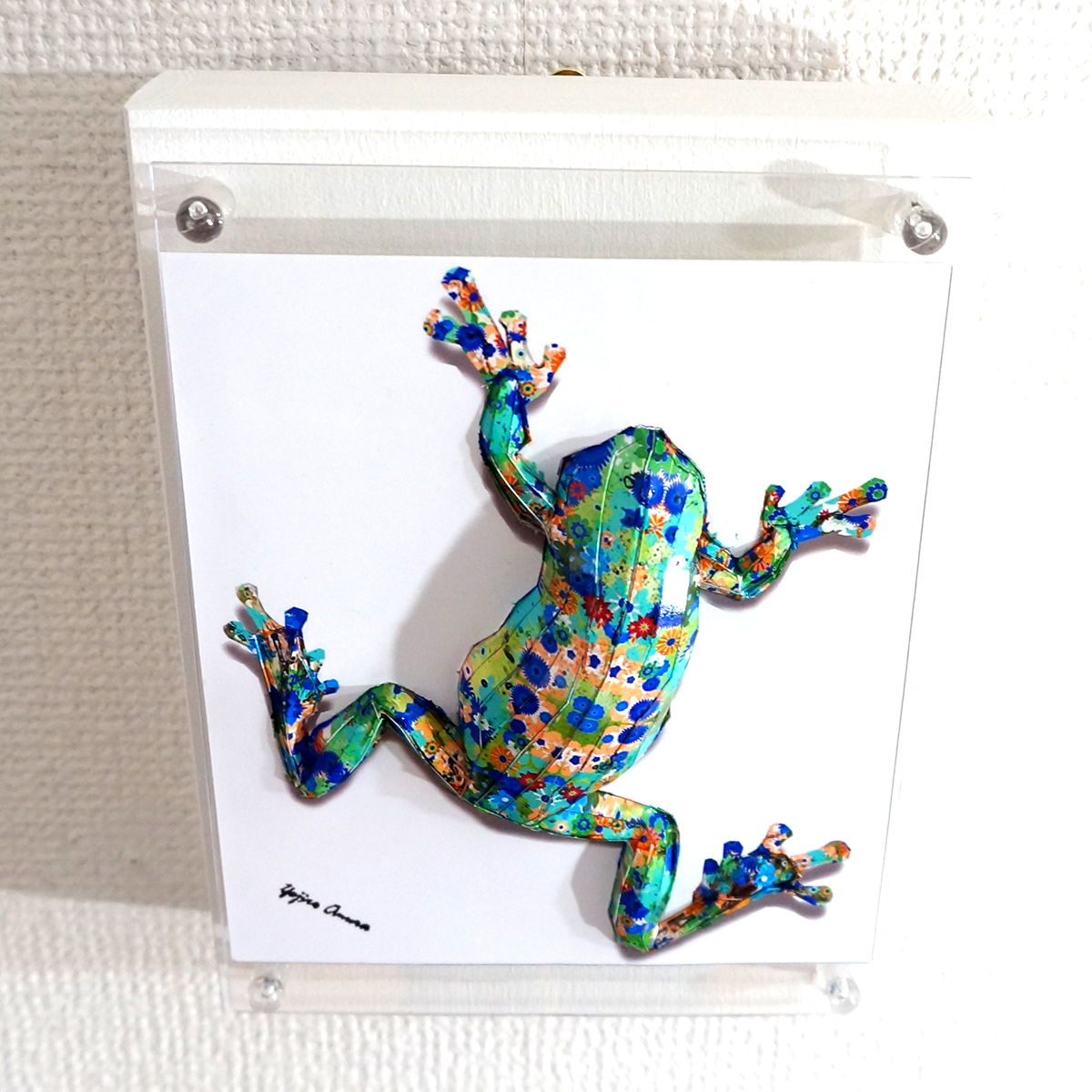 青色を基調とした花柄模様とカエル本来の模様を重ね合わせたデザインです。表面上は光沢紙の艶のある質感となっております。