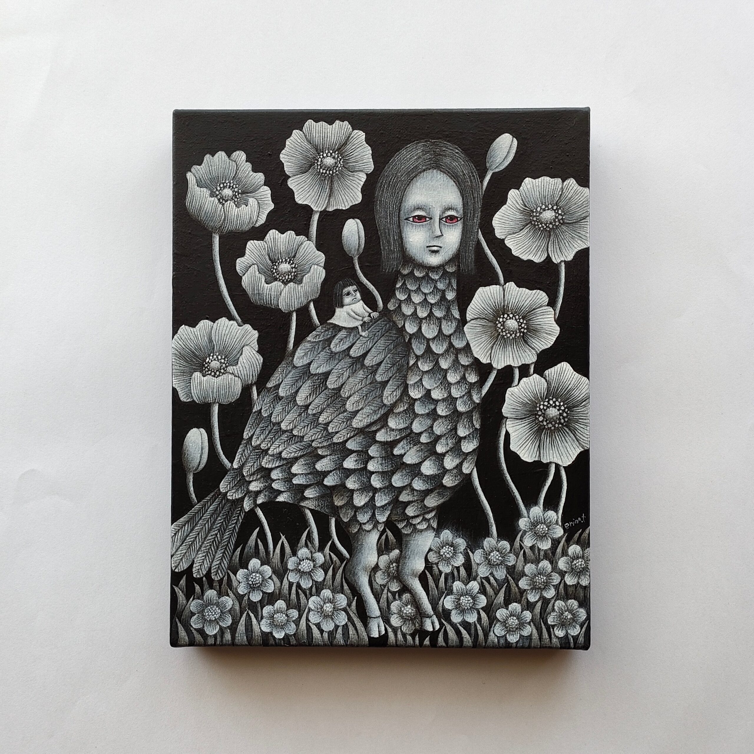 人の顔をした不思議な鳥が、小さな女の子を背中に乗せて、お花畑を散歩している場面を描きました。