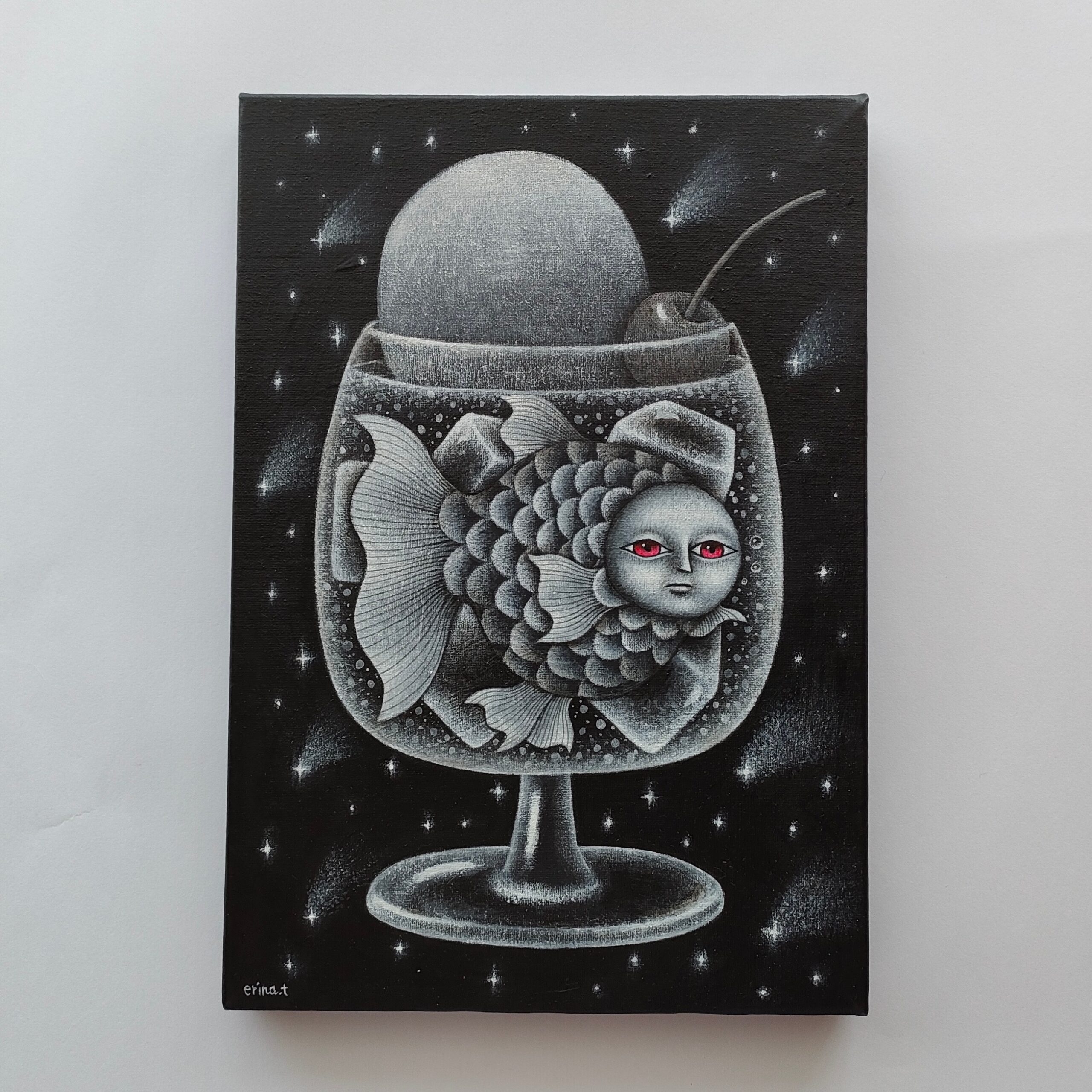 人の顔をした不思議な魚が、クリームソーダの中で気持ちよく泳いでいる場面を描きました。
