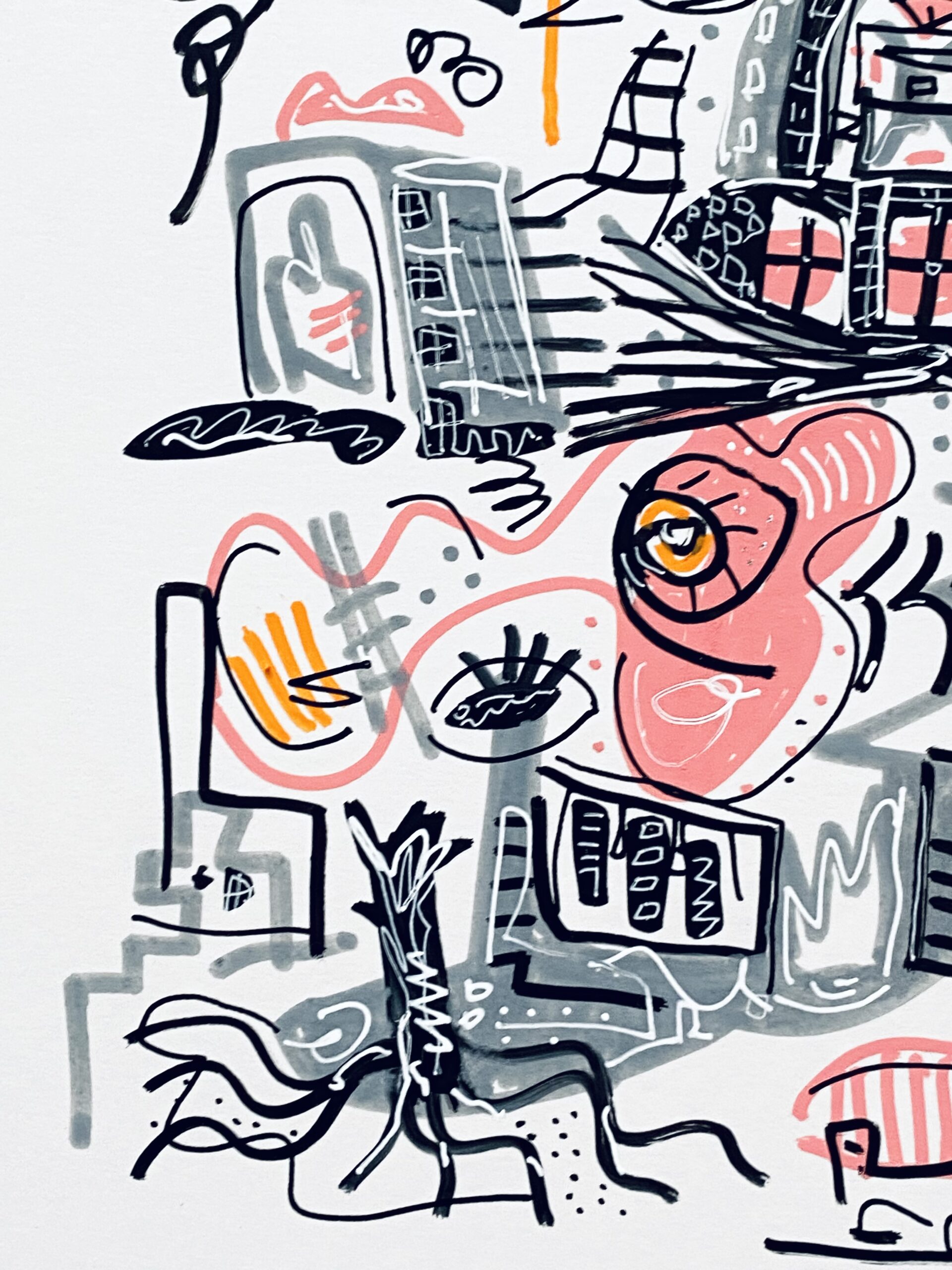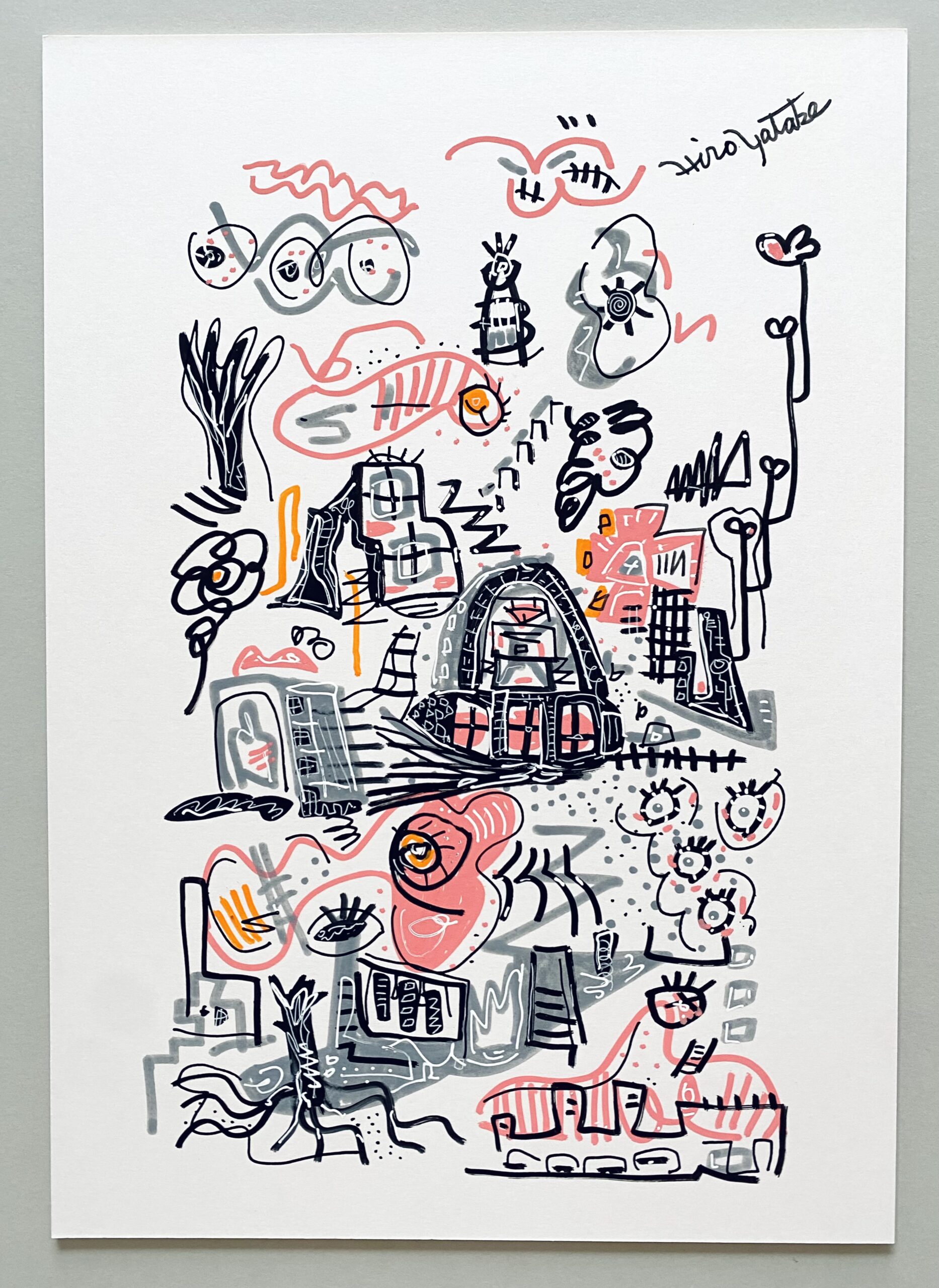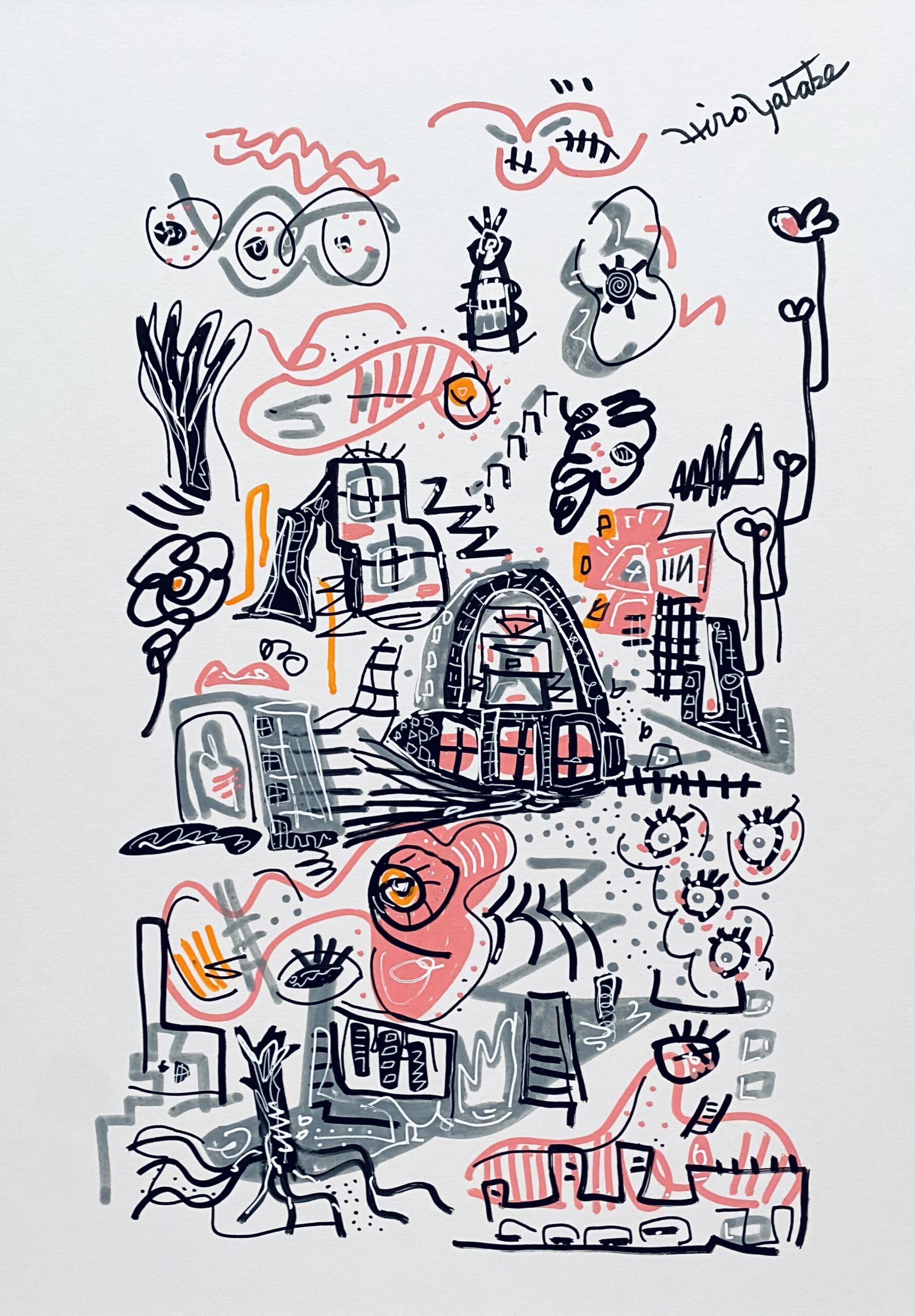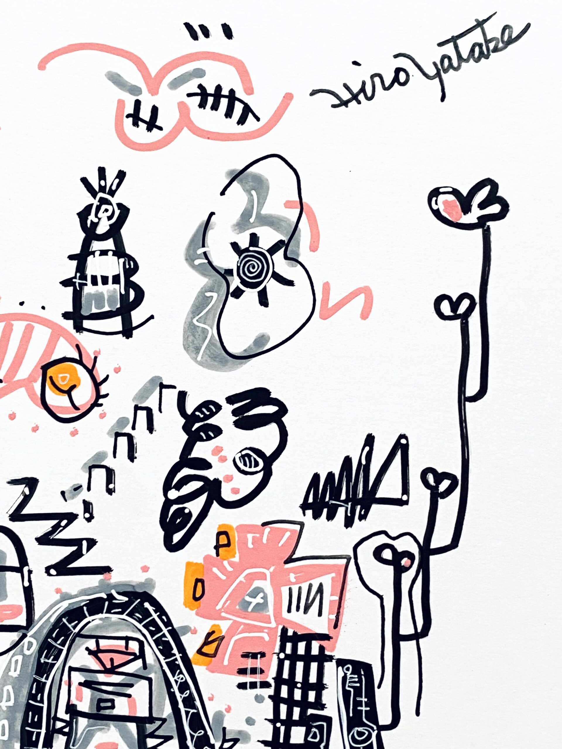 2008年 浮かんだイメージを付箋にボールペンでスケッチ。2012年になりそれをまとめたものを知人に見せたところサイズや画材をかえて絵画として発表することを勧められ、2013年、公募展にA4サイズのカードボードにペン・パステルで描いた作品を出品。その後アクリル絵具での創作をスタート。
