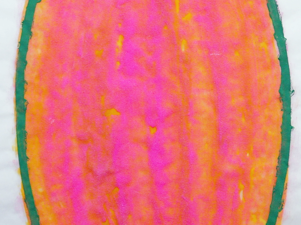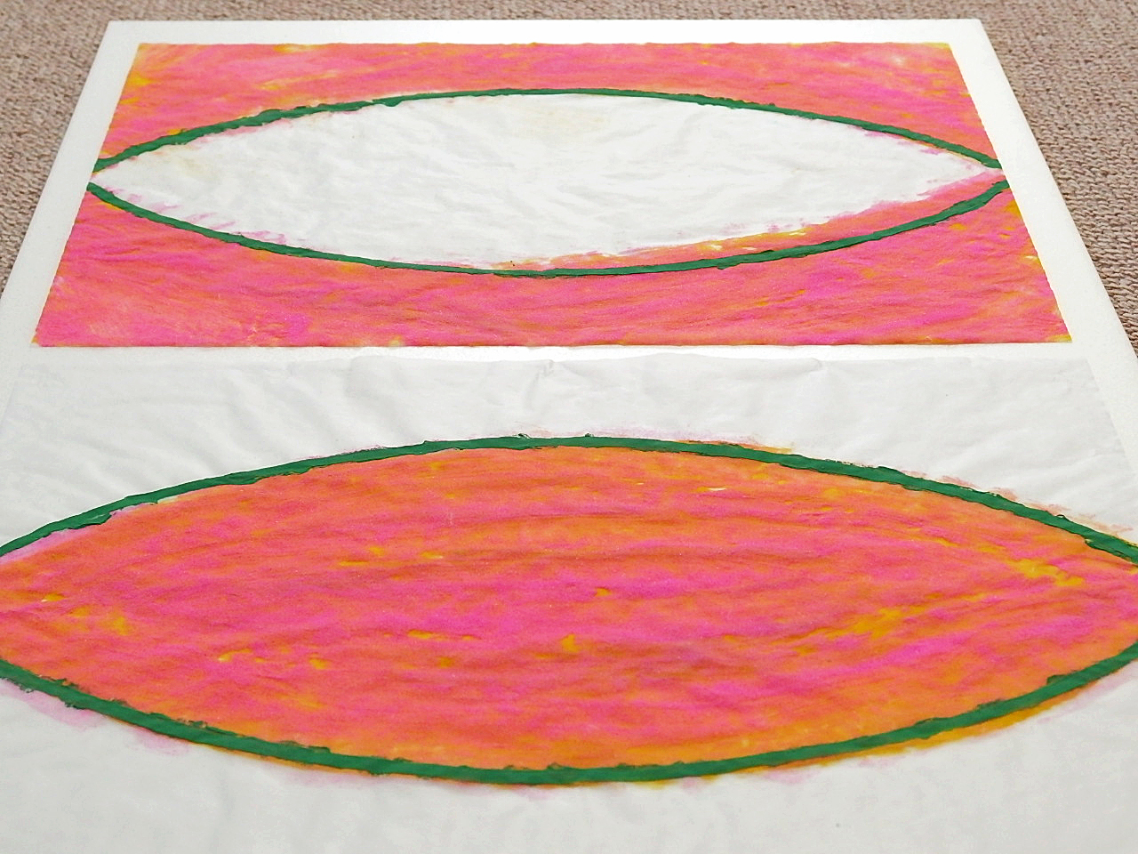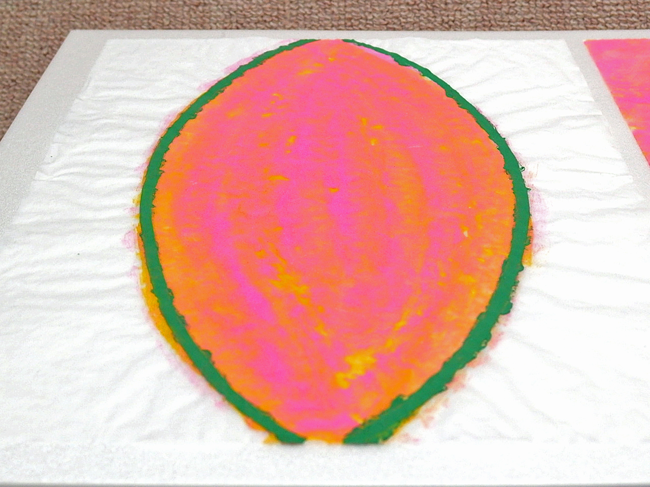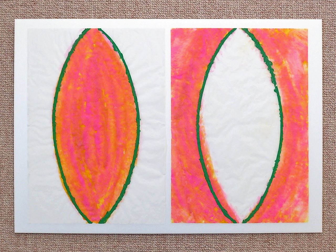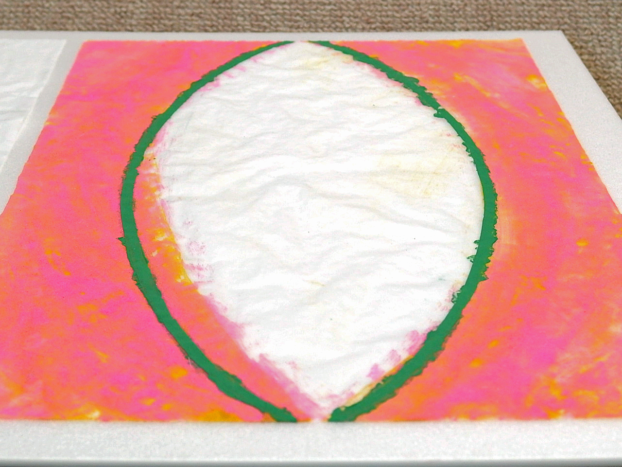 スチレンペーパーという光沢のある真っ白な素材に、岩絵の具自体の美しさが際立ちます。この組み合わせを発見し、気に入って使い続けています。