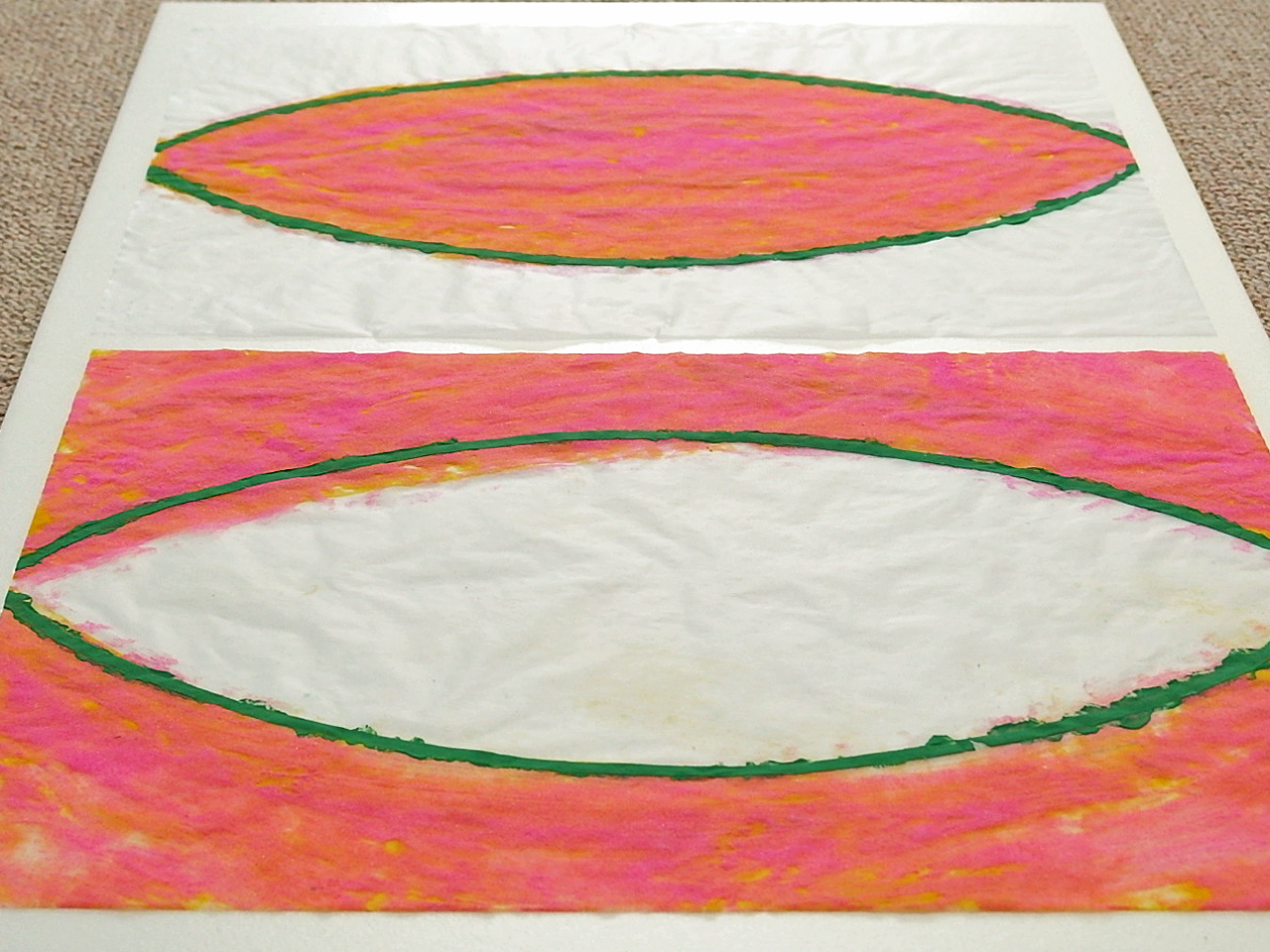 天然素材の和紙に膠を使うのが「日本画」の常識ですが、あえて人工素材を使っています。