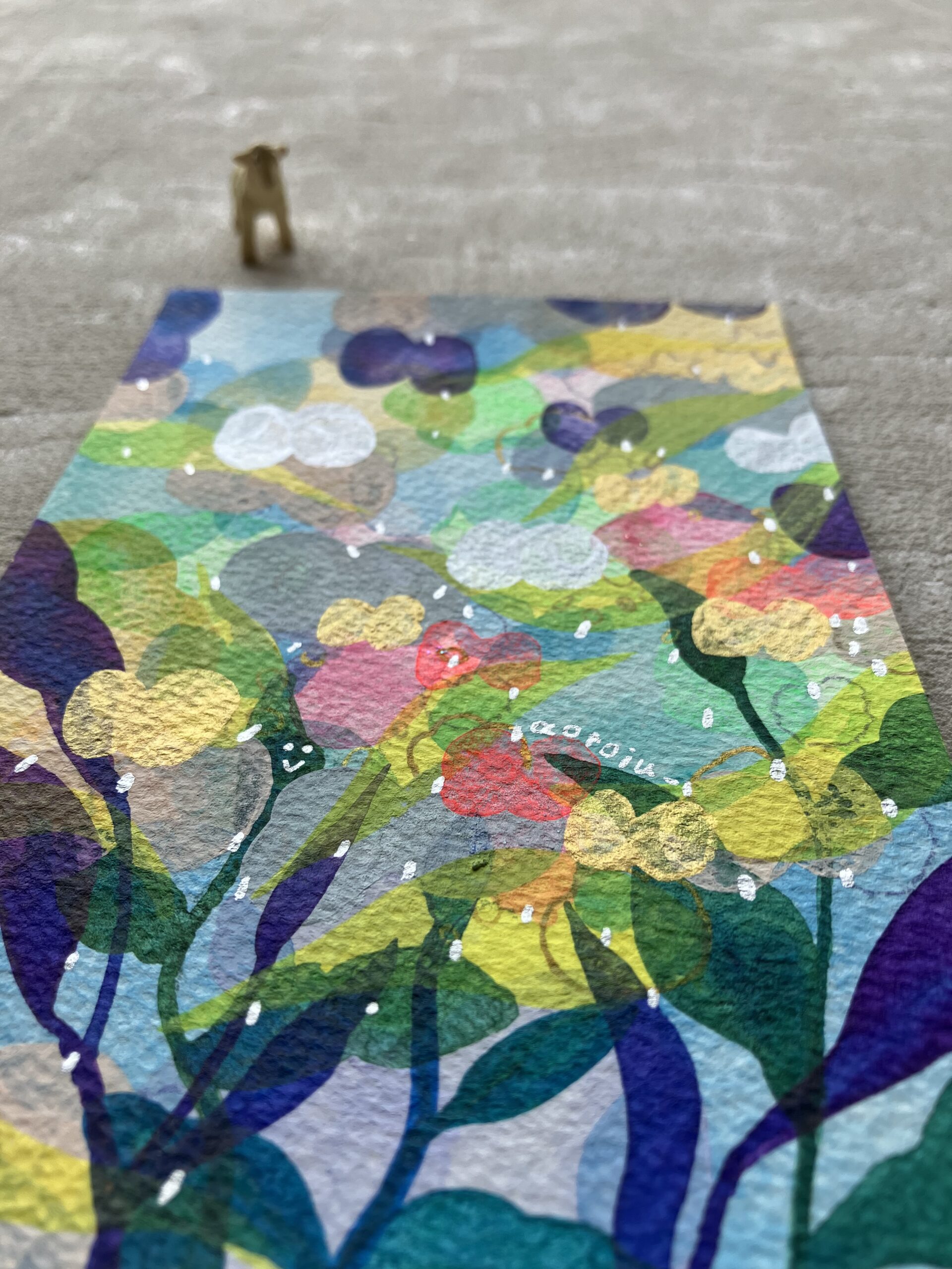 小さいころから描くのが好きでした。引っ込み思案な子どもで、今でもたいそう不器用な人、です。何とかなんとか、周りの人たちに助けられて生かされています。振り返ってみると、つらいときも、きれいだなぁ、素敵だなぁ、心動かされるものを表現したい想いだけは、ずっと、かすかに消えそうになりながらも、わたしの膝のうえにあった気がします。たとえば、なにも特別なことは出来ないけれど、わたしにできることで、描くことで、わたしの絵に出会って下さった人の笑顔があることで、巡り巡って恩返しができるのではないか、と思っています。