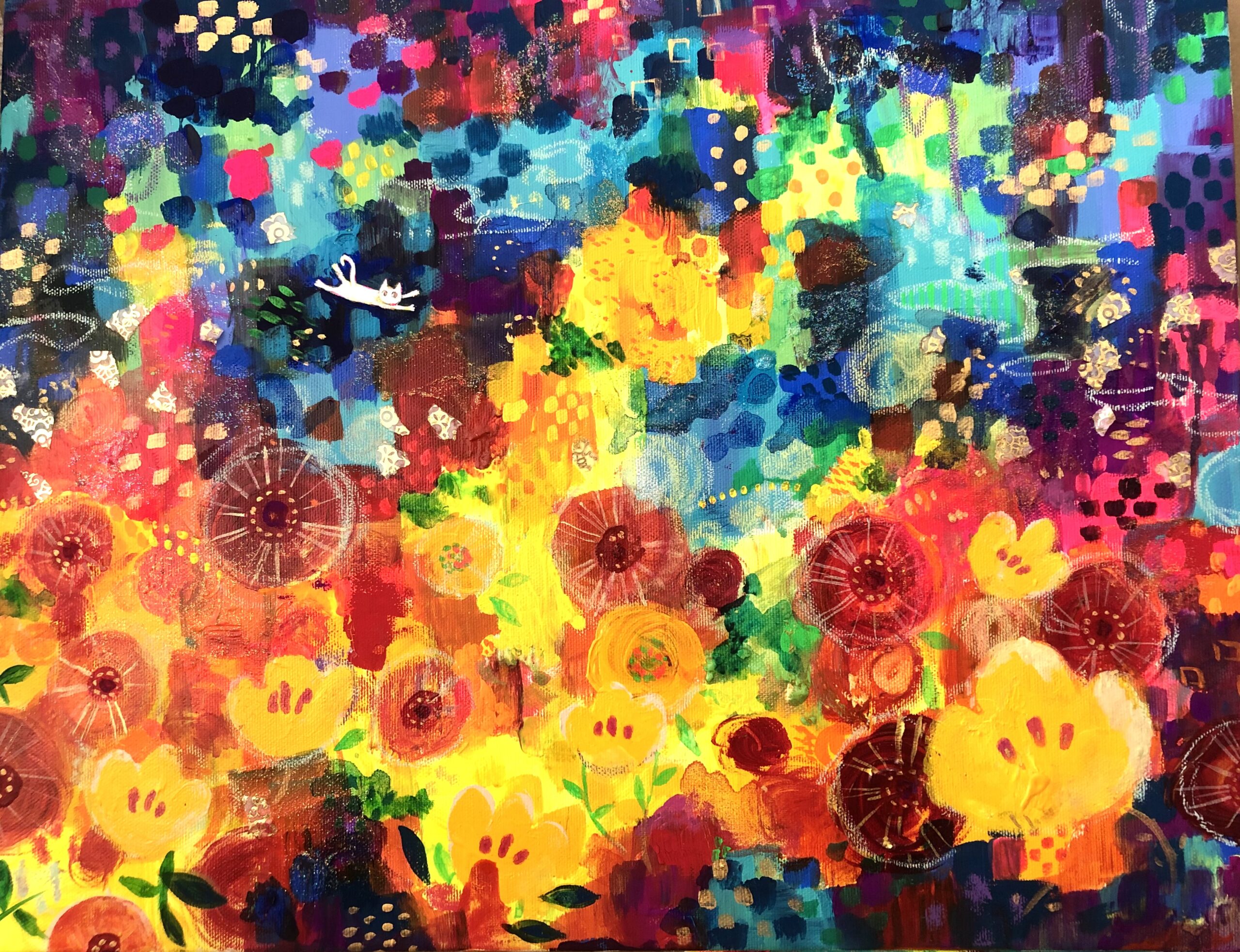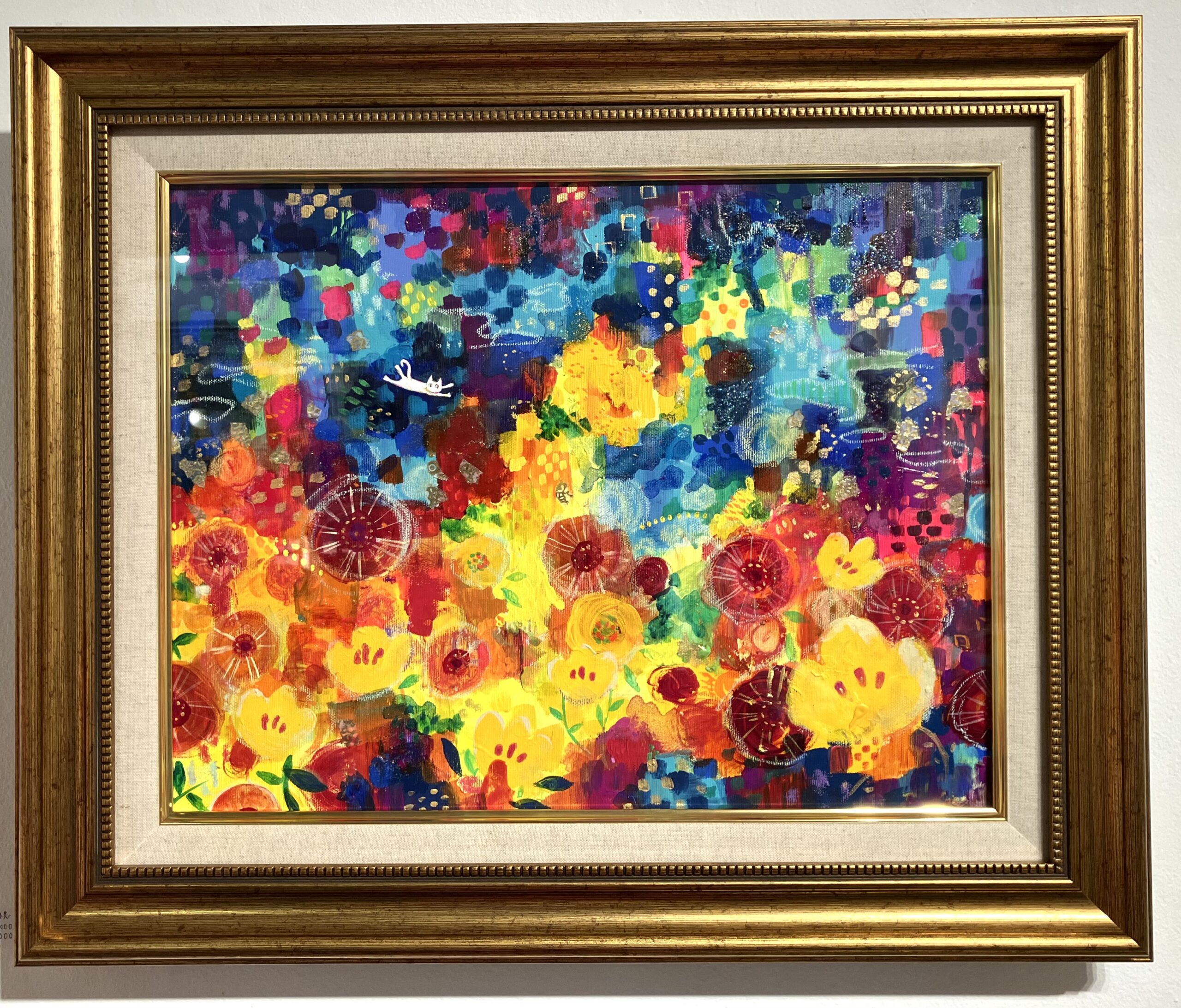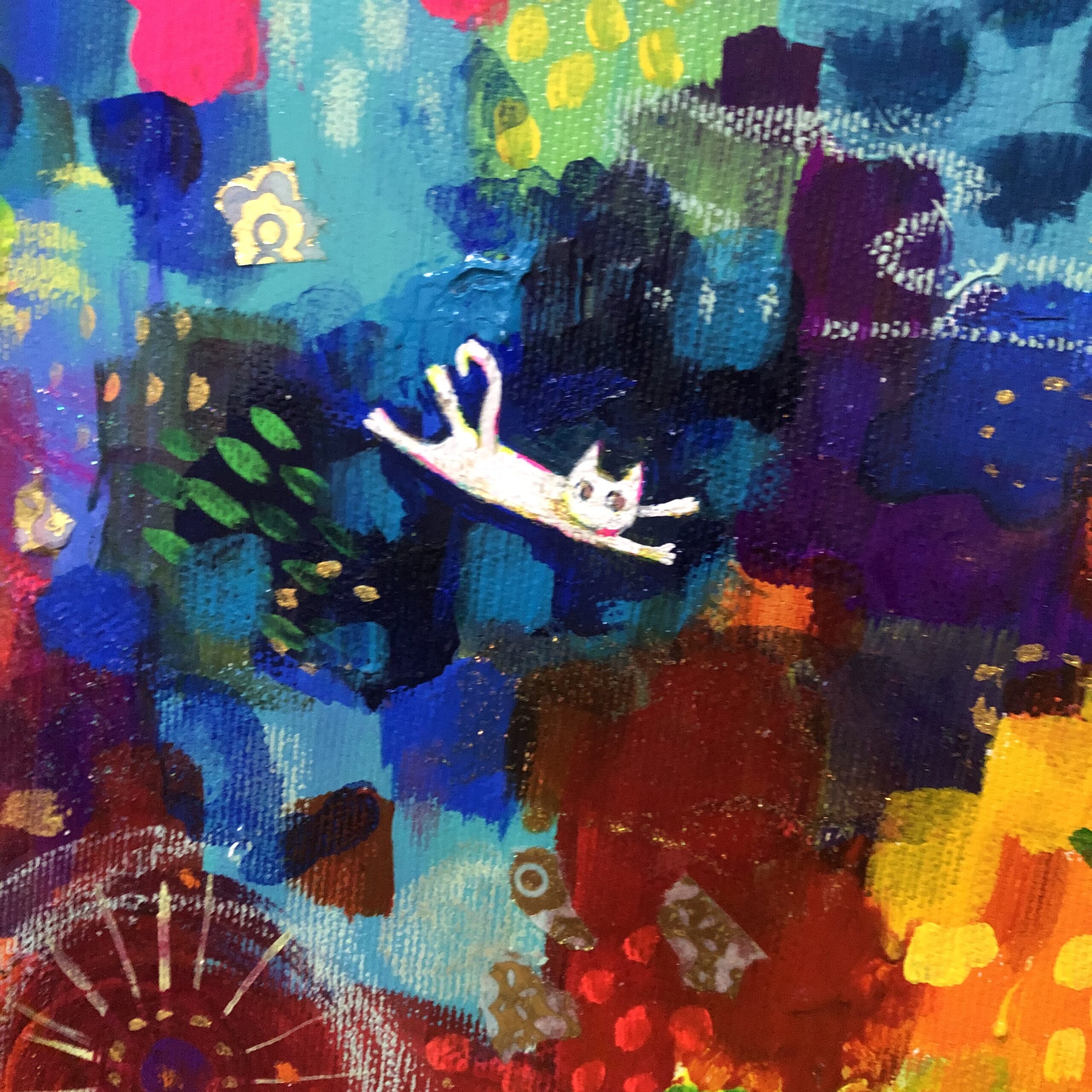 鮮やかな色合いの中を漂う。カラフルですがまとまりのある作品に仕上がりました。