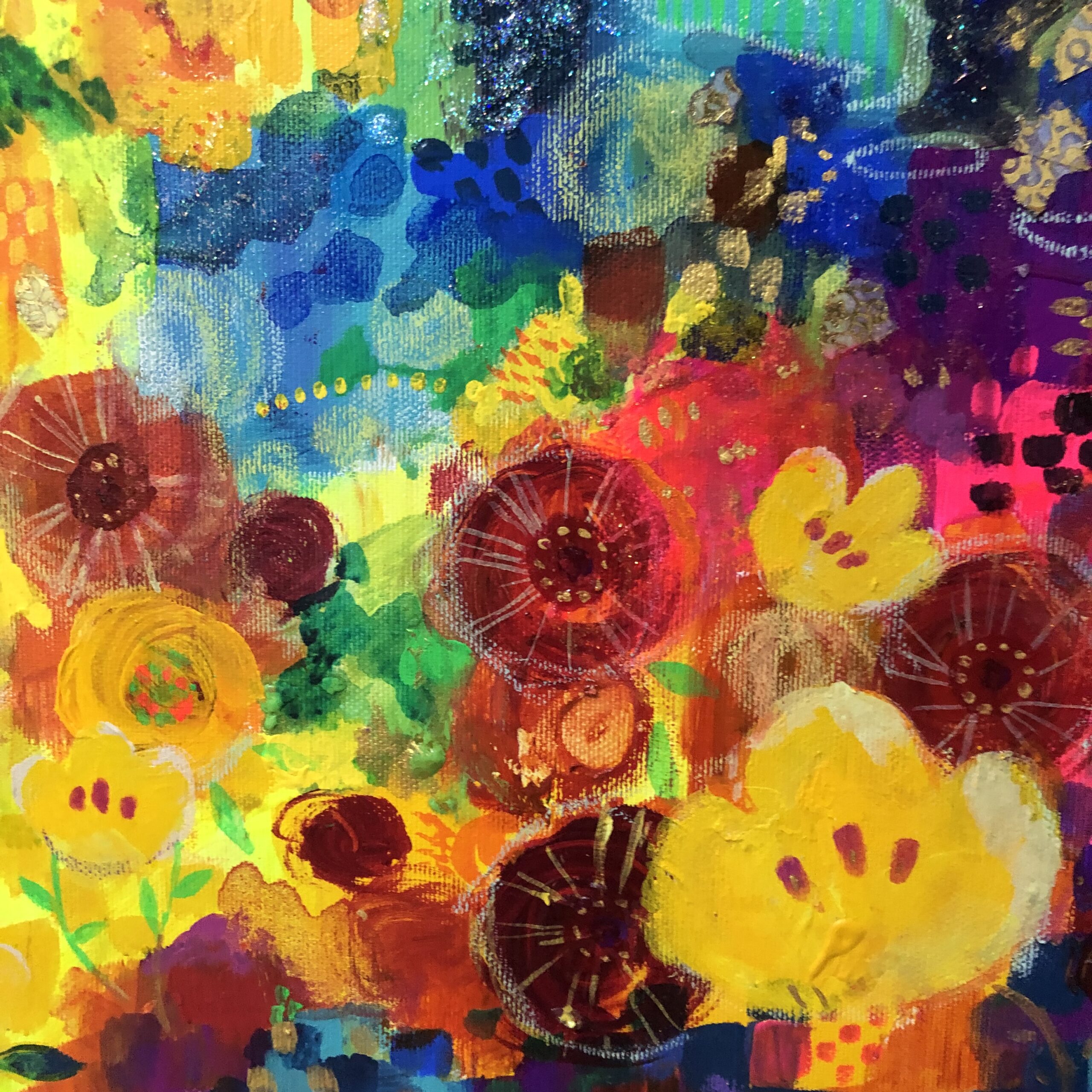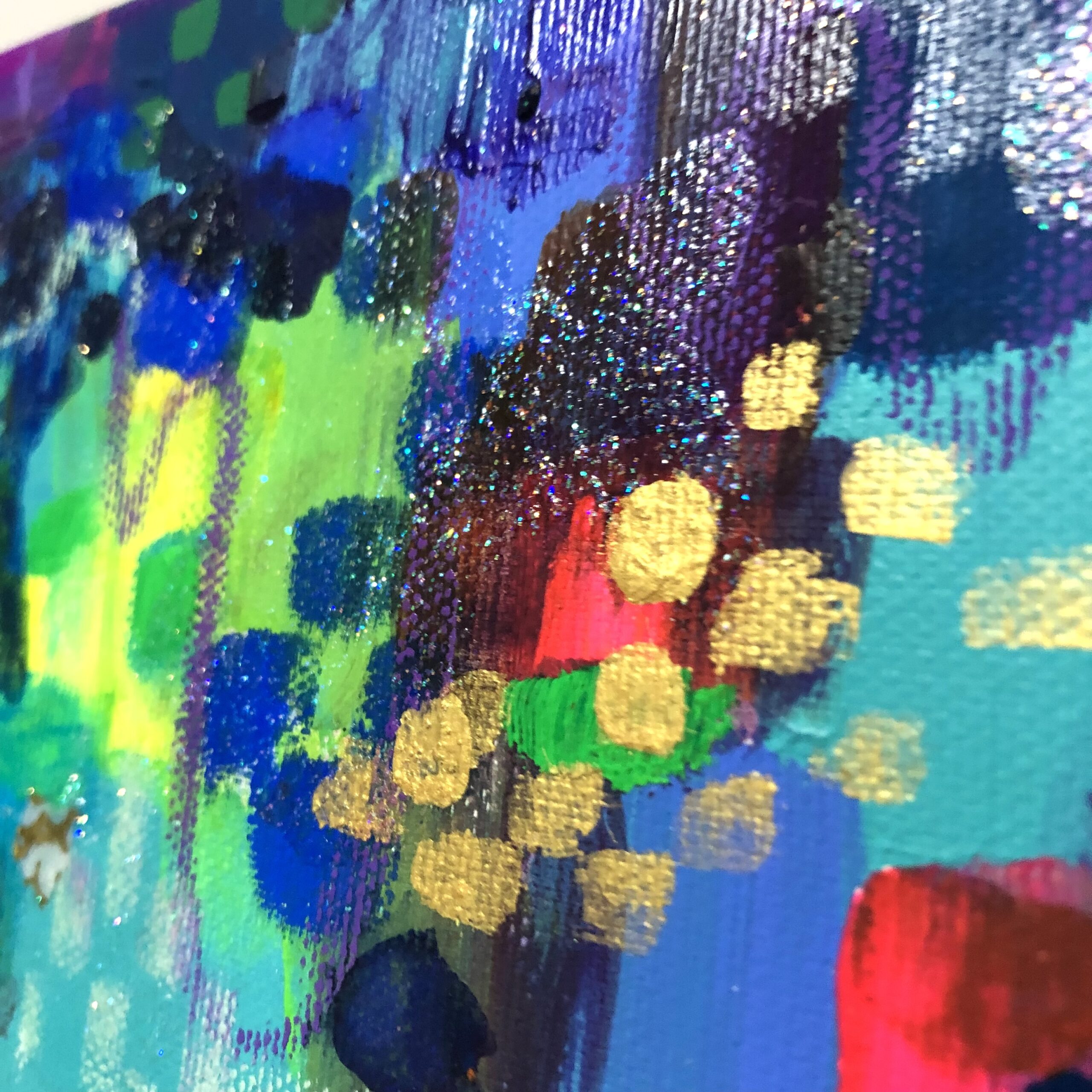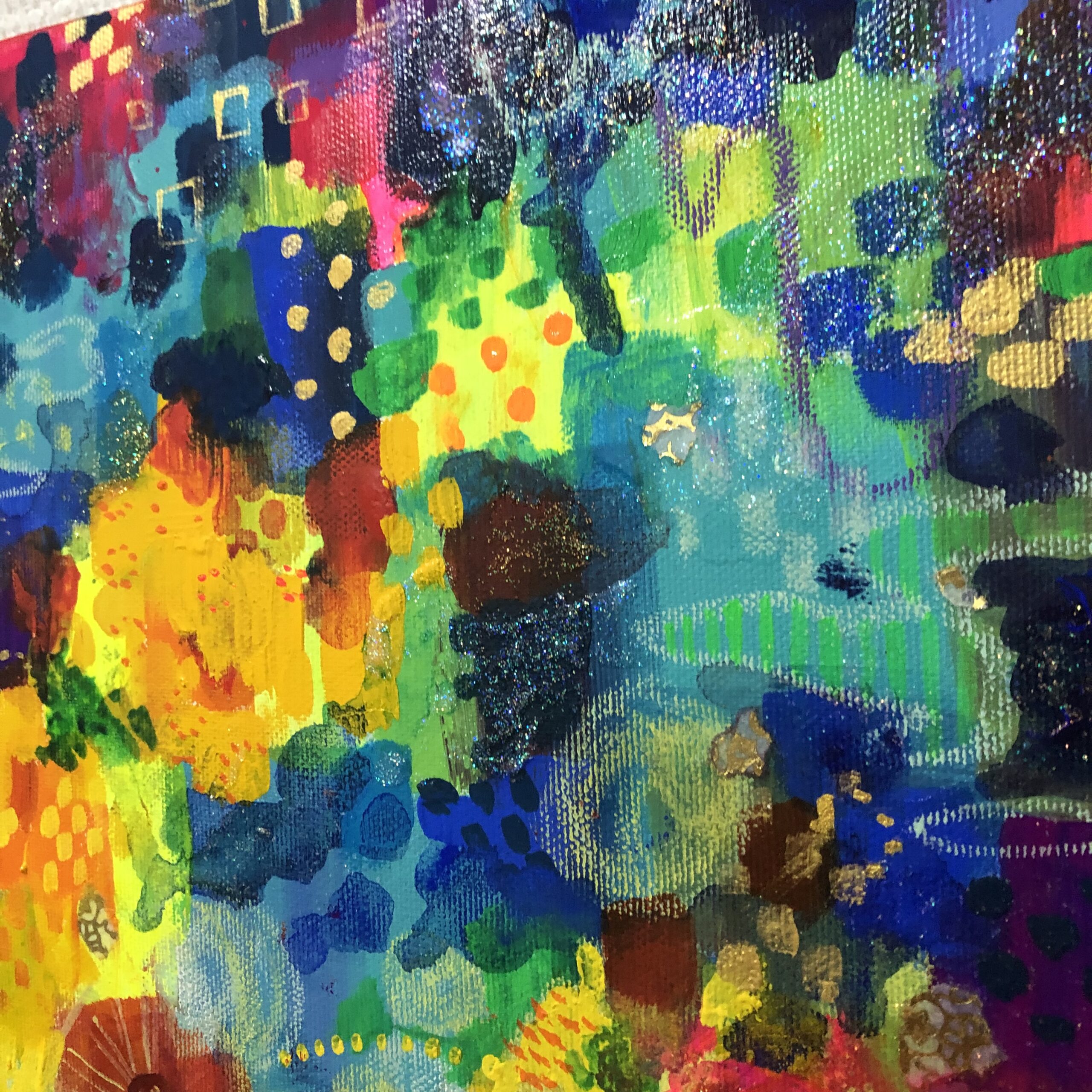 鮮やかな色合いの中を漂う。カラフルですがまとまりのある作品に仕上がりました。