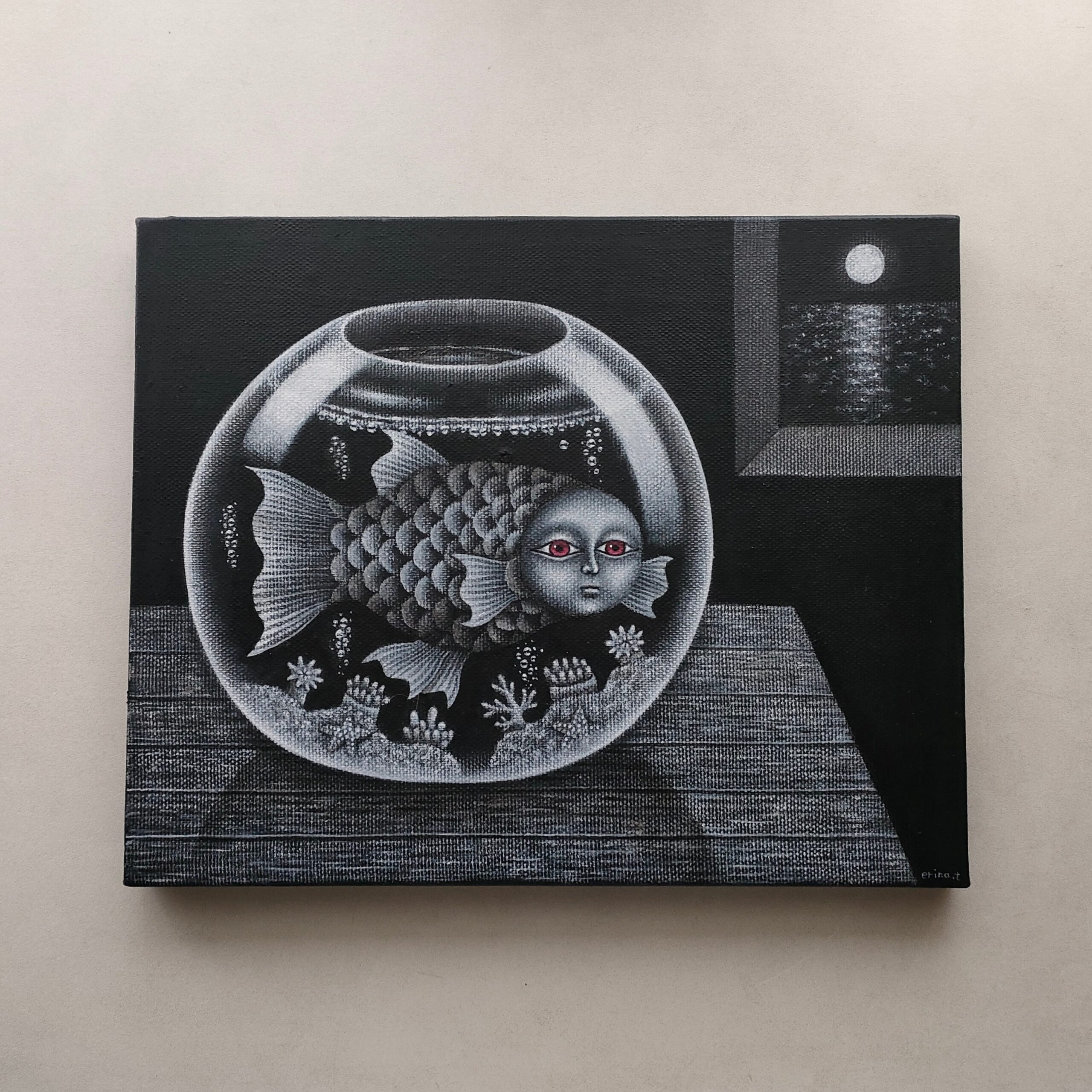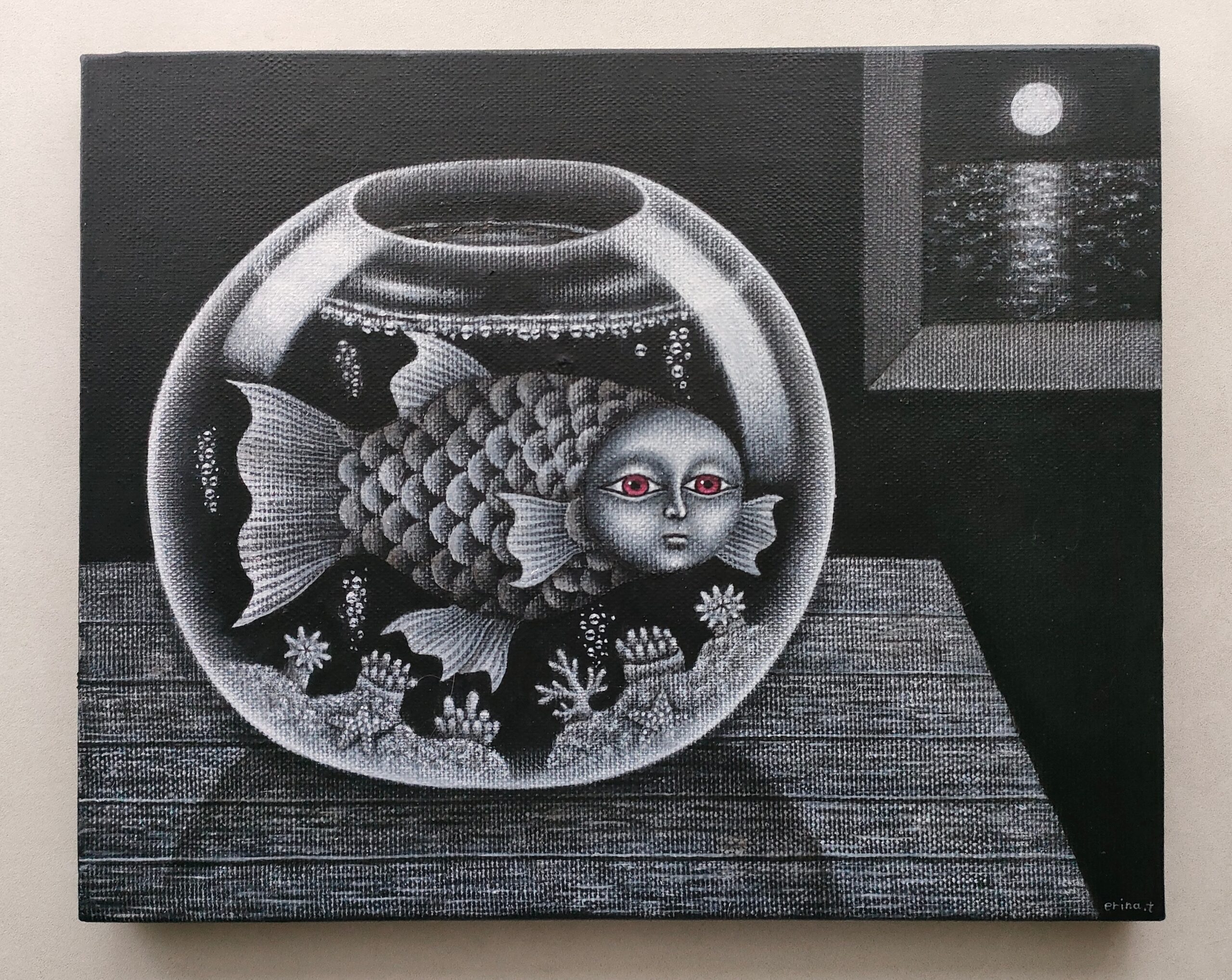 水槽の中に入れられた不思議な魚が、窓から海を眺めている場面を描きました。