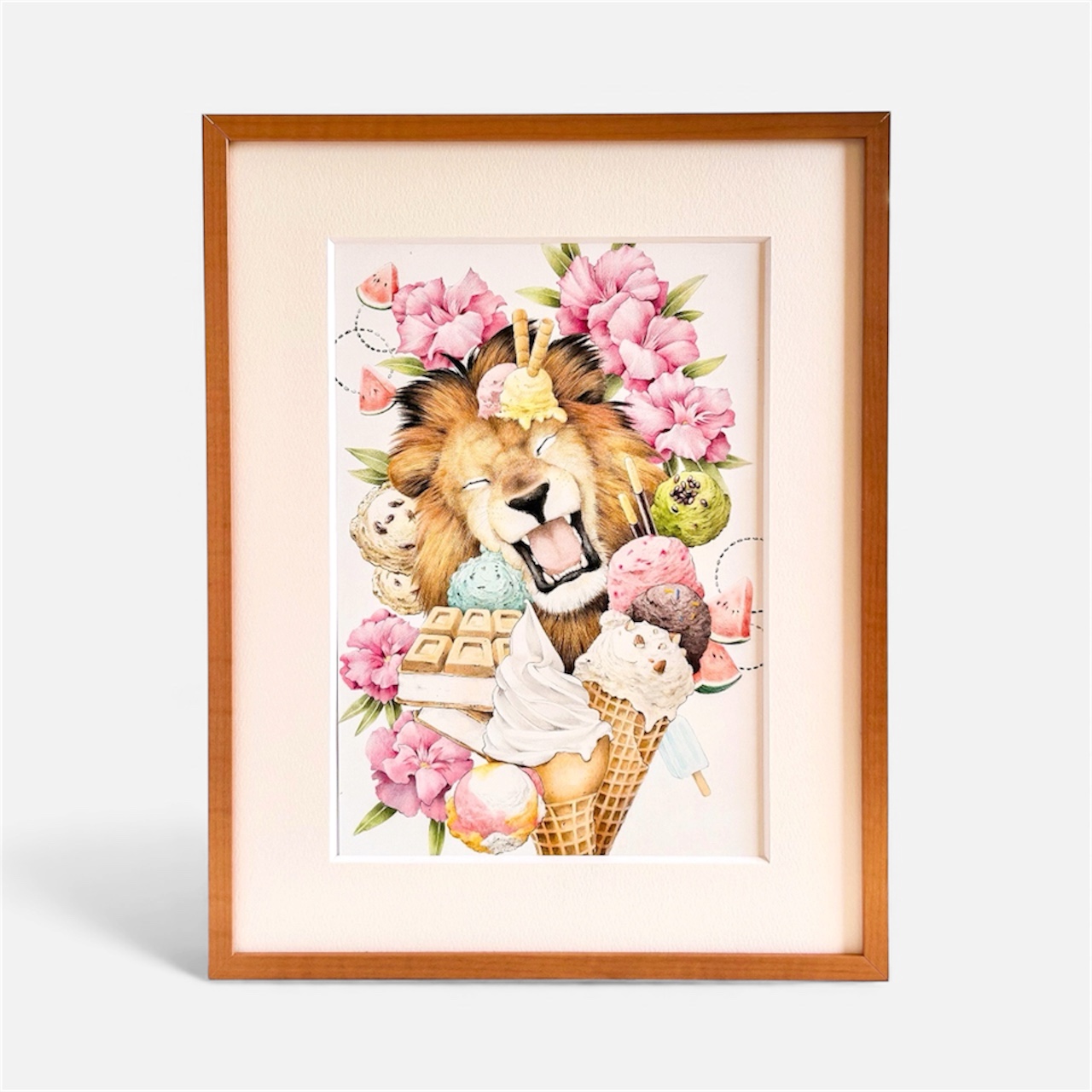 満面お笑みを浮かべたライオン。その周囲を美味しいアイスとソフトクリームとキョウチクトウの花。